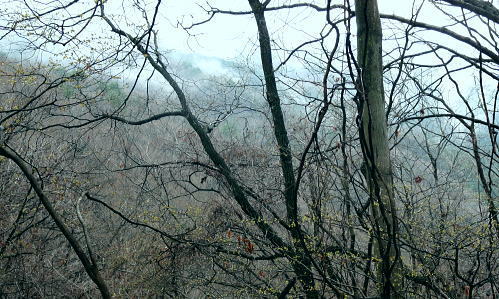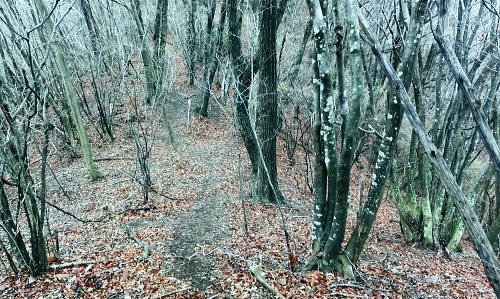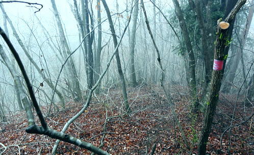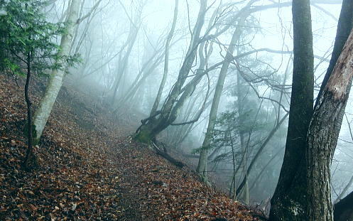 | 第三弾.前道志山稜を横切り.高取山稜から大平川へ下り.猿焼山西尾根へ・・前道志越えの山並Top 道志山地Top 前道志からS字状に高取山稜を横切り朝日馬場を抜け猿焼山へ登り.西尾根から富士急赤坂へ 小篠沢から前道志高畑山を越え.朝日川左俣大平沢流域から桂川へ 小篠から高畑山北尾根・雛鶴峠・檜山峠・大ダビ山・高取山・サイマル山を経て朝日馬場―更に双耳の猿焼山北・西尾根と繋げ日陰山 2つの天神峠と戸倉峠を経て赤坂へ 2013年04月01日.松村 jr鳥沢から高畑山北尾根に乗り.檜山峠から高岩・・2つの峠を越えダンコウバイ 大平沢ノ頭から高取山稜からサイマル山を越え朝日馬場 猿焼山北・西尾根から日陰山を経て引与田より直接富士急赤坂駅 前道志の陵と城ケ丸(西峰)西尾根 今倉山.松山北尾根を横切る林道より北面を望む今倉山.松山北尾根の林道菅野盛里線より北方の中道志を望む・・2011.07.09/9:21 檜山峠越えの朝日馬場・・前道志の山並を越え.高取山陵から城ケ丸に立ち.西尾根(朝日川左岸尾根)を綴り道志みちへ 背は前道志で枝陰に隠れる大桑山と高畑山. 倉岳山から矢平山。jr鳥沢駅から高畑山北尾根を越え南方へ雛鶴峠方面へ。 高岩に至る尾根に乗り.中央の中道志に入り.霞み重なるサイマル山から高取山の肩に延びる尾根を折れ西方に進んでいる。 手前は猿焼山(城ケ丸)から尾根末端の富士急線赤岩駅に至る生出山から連なる猿焼山西尾根。窪地が天神峠付近 先月上旬には大桑山北尾根,中旬には穴路峠から前道志の峠路を往復し.秋山二十六夜山周辺の山々を歩き回っている。 今回は2週間前に通ったばかりの穴路峠への径を再び綴り.再び鳥沢駅に下車し入山した。それも今回は前道志から中道志の先.雛鶴峠から檜山峠を越る。. 所謂.再び前道志から中道志へと。檜山峠から棚ノ入山北尾根の西側に位置し.高畑山の裏側にあたる高取山稜からサイマル山稜に入る。 更なる奥山の眺望を愉しみ.後半は朝日川を渡り返し,猿焼山北・西尾根を綴って.2つの天神峠を訪れ,富士急禾生へ直接下ることにした。 猿焼山には一昨年7月に赤岩北尾根から入り.今倉山北尾根を北上し周回している。今回は猿焼山北尾根から西尾根の陵に乗る。 時間的に猿焼山西尾根末端の生出山まで歩むのは時間的に無理. 戸川天神峠から玉川天神峠まで歩んでみる積りでいる。 それ故.中盤の入山は猿焼山東尾根から入る積りが北尾根に変更している。生出山までと励むも気落ちし.結果的には玉川天神峠止まりになった。 4月01日(月).本曇一時霧雨 jr御徒町始発4:36=4:39神田:41=5:44豊田大月行:47=6:30鳥沢. 甲州街道沿いの旧下鳥沢に残る宿場跡の佇まい.6:43jr鳥沢から高畑山越え高岩へ jr鳥沢6:45一7:06林道ゲート一7:35石仏一8:00北尾根に乗る一8:12旧仙人小屋跡一8:41高畑山 一8:45雛鶴峠分岐一9:00檜山峠一9:16大ダビ山一9:27大平沢ノ頭. 下鳥沢の宿 今回も桂川南岸の天空はどんよりした重い雲に覆われ.一面の層雲に覆われた台地からは一度もその切り開きを仰ぐことはできなかった。 前回の前道志の山々は輪郭さえ全く知ることはできなかったがその時に比べれば朝から視界は幾らか開かている。 鳥沢駅に下車し甲州街道に入る。朝方からの日差しもなく.街道を走る車の往来も少ない。閑散としたいにしえの宿場町も重い面影を落していた。 昔の旧甲州街道沿いに残る家屋は庇が長くでている出桁軒裏造りで.風通しや明かり取りのための兜造りの屋根が特徴的に造られていた。 今回もその街道.路地角に「下鳥沢宿」・「高畑山.倉岳山」の道標を見て.右に折れ黒板塀の脇道を抜けて.里道に入っている。 江戸時代.宿場制定の折から道幅を広く取っていたおかげで.街道は400年の流れを経ても残されていた。国道開通後も建物が残る珍しい地区のようだ。 江戸・日本橋から下諏訪を結ぶ甲州街道は大月市を東西に貫き.45の宿場のうち.下鳥沢宿から黒野田宿まで12宿が市内にある。 上鳥沢宿.下鳥沢宿.猿橋宿.駒橋宿.大月宿.上花咲宿.下花咲宿.中初狩宿.下初狩宿.そして難所の笹子峠7kmほどの間には 白野宿・阿弥陀街道宿・黒野田宿と3つの小さな宿場があった。・・旧甲州街道・甲斐の国 紅吹橋から桂川と小篠の集落.6:54桂川虹吹橋へ下ると前回と同じように数人の通勤者と同じ場所で擦れ違っている。遠く離れた場所から同じ感覚で擦れ違うのも不思議な感じ。 周りは厚い層雲に覆われている。予報に反し.晴れる見込みは薄い。今日も平日で鳥沢駅からはただ独り下車.山に入る。 前回から2週間経ち.集落の庭先を飾っていた白梅は散り始め.周りは桜の開花に変わり始めている。 小篠の集落最上部 ![]() 左に山の神神社 集落.最後の民家を過ぎ.林道ゲートを抜ける.7:07 石仏の北尾根と穴路峠への分岐.7:35小篠沢を直進して遡れば穴路峠越えをして秋山地区に入る。 右手に折れれば高畑山の北尾根に回り込む。まだ冬木に覆われた山腹斜面は朝方の強いモヤの中だった。 高畑山.尾根を横断 大きくジグザクに切る北尾根はまだ裸林の世界 朧に霞む北尾根に乗る.8:00