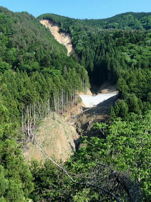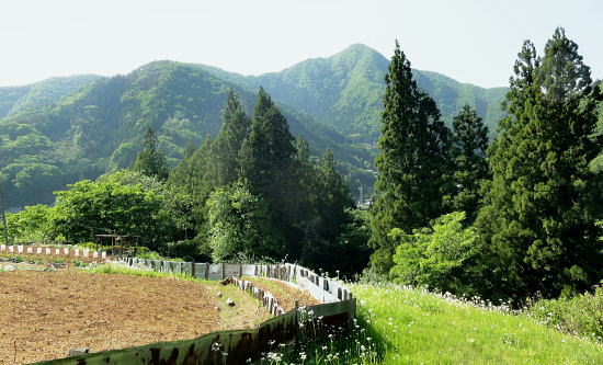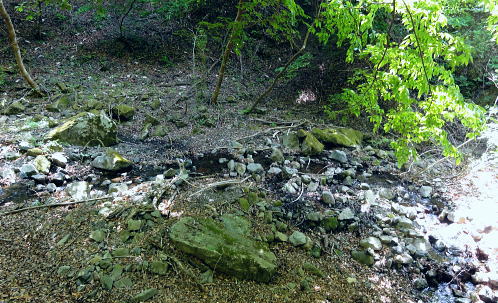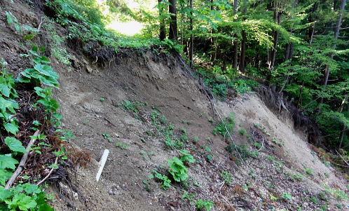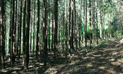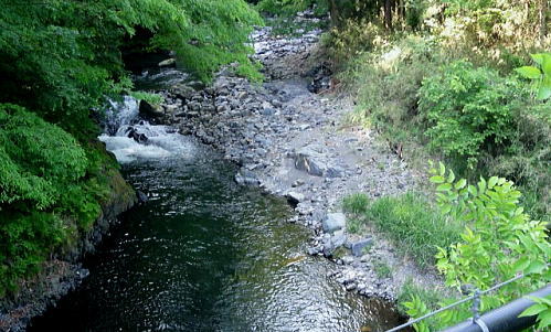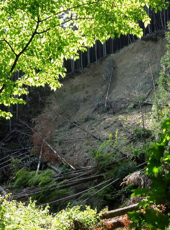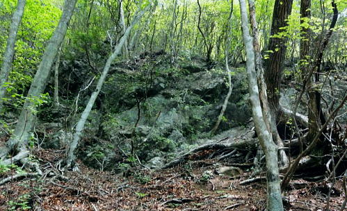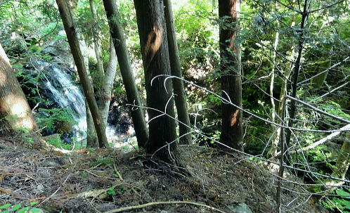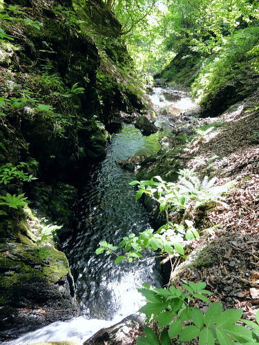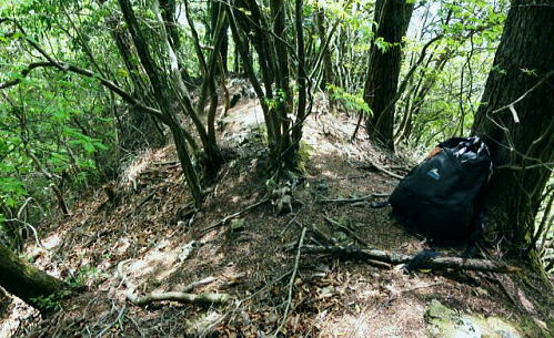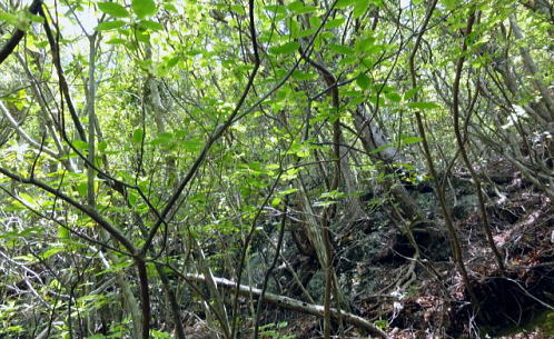 | 三ッ森東峰から西権現山稜端の南面に延びる麻生沢中間尾根を下る 権現尾根を西方へ綴り.三森東峰にでて麻生沢730m圏麻生沢中間尾根を下降―林道.街道駒宮から奈良子入口 bs 大入沢二俣の1240m圏.中間尾根―三ッ森北峰 麻生沢二俣.東峰中間尾根から富岡bs・・県道から望む大ぞうり沢と奈良子入口bs 730m圏.麻生沢中間尾根 見上げている灌木帯のツメ.11:50中間尾根から七久保へ 11:00三森東峰:50⇔11:23北峰:40 一12:35南西の尾根に乗る:45一12:50(1000m台地)一13:18右俣河原 一13:23麻生沢二俣一13:54小ゴルジュ帯一14:25右岸高巻き一14:35右岸崩壊地.ガラ場一14:50林道終点 一14:55林道口.長尾根登山口:15一15:26七久保駒宮入口.富岡bs. 麻生沢は三ッ.麻生山を源となし.北峰鋸尾根(楢尾尾根)と麻生山長尾根に挟まれた河川で葛野川に流れ込む小沢。 三森北峰をピストンし眺望を楽しんだ後.麻生沢二俣の730m圏中間尾根を下降した。 麻生沢中間尾根を下る ハングで細長く横切る露岩帯を見上げると踏み跡はない.12:03尾根のツメ 先程確認した地点に戻り.三ッ森北峰から南東に位置するコブの北側肩から中間尾根に取り付く。 南面のツメは急斜面の壁のような灌木の樹林帯。地肌に体を向け三点確保でこの樹林の藪絡むジャングルを下降した。 立木を利用し這い下る。距離は短いが足元が崩れ.この登りを考えると馬力ばかり必要とするうんざりする所だった。 踏み跡は分からず,露岩の帯の下はハング気味の所にでる。 右手に回り込むところ下り易い左手に回り込んでいる。そこは起伏の起き上がった小尾根上で,尾根を1本間違えていた。 可笑しいと磁石の針を見ると南方を向いていた。本尾根の1本左側の枝尾根を下ってしまったようだ。 右手にやや大きい尾根筋が走っている。今度は急斜面のトラバース.幾らか河原状に窪んだ大地を丁寧にトラバースした。 出来るだけ真横に切り.斜め下へ横切っている。途中でサンショウの茎を掴んだのか? 手に芳ばしい香りが鼻に付く。 そして右尾根に乗り.北西に延びる本来の尾根に乗る。取付きからここまで40分ほど費やしている。 二俣から突き上げる主尾根 西側にトラバースし本来の中間尾根に乗る.12:35ここで1本取る。仄かに流れる風が心地よい。まだ下草は生えず.木洩れ日が差し込み心を休ませる所だった。薄い踏み跡が残されている。 ここからは支えはバランスが中心になり.三点確保の必要はなかった。足だけの動作が多くなり.先は露岩の細尾根に変わる。 1050m付近の広い台地 気を安らげる広大な台地.12:511100m付近で急に尾根幅が広がり.植林された台地にでる。新緑の美しい台地が右手に大らかに広がり.散策的になった尾根筋を歩む。 日の差し込む青葉の清々しさ. 想像できぬ地形に美林が並び.夢見るような明るい大地が広がりを見せていた。 麻生沢右俣 右下の日差しの境が二俣.13:15丸みを帯びた尾根は再び扇状の急斜面を迎える。落葉を蹴り.ずり落ちながら枝木を支えに下るのみ。 二俣の左斜面には緩やかに広がる河原が見下ろされ.新緑の中にただ1本の桜色に染まるミツワツツジが彩りを添えている。 そこを目指し.ガラ場の麻生沢二俣から少し右俣寄りの河原に下り着く。 麻生沢二俣 二俣に立ち老樹を振り返る.13:21麻生沢左俣 右俣は樹林に深く被わている麻生沢二俣中央にはデンと大きなブナの木が君臨するが如く聳えている。森の主のような雰囲気をかもちだしていた。 その木には古い「山火防止」の丸いプレートが掛かげられていをり.新緑の若葉に流水が美しい。一時我を忘れ唯ずむ私。 本流の小さな廊下状 13:50麻生沢はできるだけ高巻きせず.水線の水際沿いに下る。短いゴルジュ帯を迎えても.高巻きせず小滝群をヘズり. 足場の苔むしる濡れた岩場を下る。1ケ所.ロープが垂れ下がった所は少し登り.振り子のスタイルで左岸に渡り助けられていた。 その下の右岸にも針金があるがここは触れなかった。 麻生沢道中最大の滝 右岸の植林帯を大きく高巻く.14:23小さな廊下を過ぎた後の渓谷の一番の大滝は右岸を高巻いている。植林帯の中をヘズっている。 水線を進むこともあるが左岸に踏み跡らしき所が現れ.再び流心に入ってからは明瞭な道形に戻っていた。 崩壊現場・・2ケ所 林道起点より.14:35本流右岸のこの付近は全体的に山腹の傾斜はきつく崩壊現場を幾つか持っている。その中でここはきつい。 左岸に取水タンクを見て.堰堤手前で右岸に進み.再び取水用水道管が現れると駒宮からの林道終点にでる。 渓谷の流心が左に大きくカーブする右岸側が大きくザレた地点。ここから左岸に上がると林道終点がぶち当たっていた。 下流へ綴る峡谷はこの先踏み跡がなくなりカットした。ここからは土道のやや幅広い林道に導かれると駒宮の集落上部に下りている。 渓谷を抜け.極端に変わる左岸の植林帯と林道.14:46地形図「大月」の右上.麻生沢沿いの破線路が本沢沿いから左岸(南)に分かれると大地は開け.ここから幅広い整備された林道が始まっている。 直ぐ左手に林道の支線を分け.枝沢