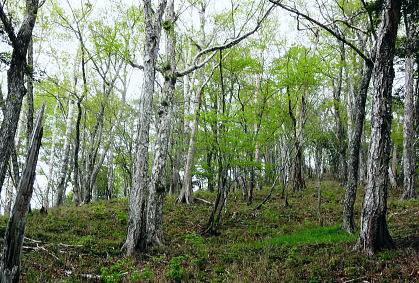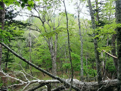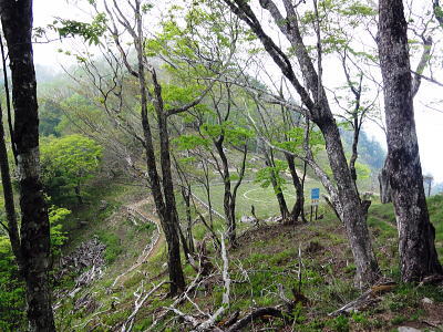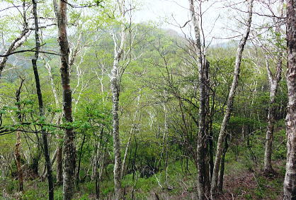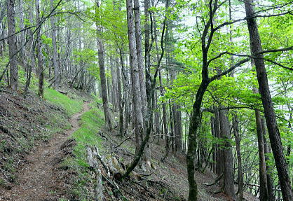 | 長沢脊稜と天祖山・・滝谷ノ頭.岩下谷ノ頭.水松山.水松山.天祖山 若葉にスミレが咲き長沢脊稜に緑の増しだす天祖山へ 滝谷ノ峰脇にでて見惚れたヘリポートから孫惣谷の源流を綴る長沢脊稜―梯子坂ノクビレから天祖山へ タワ尾根の一石山からウトウノ頭を経て滝谷ノ峰 長沢脊稜から梯子坂ノクビレ.天祖山・・脊稜は点々と一輪のスミレと天祖神社 天祖山赤石尾根から楢平・日原林道 長沢脊稜 東京都の最高峰.雲取山からは西方に延びる長大な主尾根が奥秩連山へと連ねる。又東方には長沢脊稜と2つの尾根を分けている。 北側から日原川源流を回り込みながら.東方へ長く都県界尾根を成すのが長沢脊稜。末端では奥武蔵とも境をなしている。 正確な定義はないが長沢脊稜とは天目山付近までを意味するものも多い。江戸時代には天目山稜.又ただ単に都界尾根と呼ばれてもいた。 奥多摩と秩父山地の境として.多摩川の支流日原川と荒川の支流浦山川の分水嶺であり.日向沢ノ峰まで指す人も多い。 私としては芋ノ木ドッケから七蹴山間が未踏で.今回は板小屋沢ノ頭から滝谷ノ峰との間を歩むことになる。 交通の便のよい奥多摩側に比べ.秩父山地は尾根沿いの登山道も整備が遅れ.藪絡みの山々が多い。 私の好むことだが日帰りではアプローチが少々長過ぎる難がある。又日原川を挟み多摩川との分水嶺を成す奥多摩の中心とも云うべき. 山々を流域に従えているのが石尾根で.尾根末端は日原川出合.氷川に没している。 長沢脊稜から会所 11:43長沢脊稜分岐一11:55滝谷ヘリポート一12:16水松山中尾根肩一12:30長沢背脊梁分岐:35一12:58梯子坂ノクビレ 一13:35天祖山一13:42会所14:05. 長沢脊稜.滝谷ノ頭 タワ尾根ノ頭ツメ.巻き径分岐.11:45長沢脊稜 タワ尾根から背後の「通行止」のロープを潜り.長沢脊稜に乗る。右手に10mほど入ると道標「←雲取山.長沢山.19-150,酉谷山.一杯水→」が立つ。 又黒マジックで「滝谷の峰」.タワ尾根ノ頭と書かれ.その柱には「行方不明者に関する情報提供のお願い」が張られていた。 脇には林班界標「奥多摩区分31/27」水道局の標柱もあった。それを確認し.戻る形で西側の板小屋ノ頭へと縦走路を歩みだしている。 ここまで来るとやはり更に深い山域に踏み込んだ漂いを感じ.足元には頂稜をトラバース気味に綴る確りした縦走路が綴られている。 脊稜は程ほどに落葉が重なり.路傍には下草が漸くだが疎らに茂み始めている。今回は下山までの時間が掴めず. 頂稜の踏み跡を敬遠し.縦走路の巻道を選んでいる。その山道には疎らだがアセビが艶の濃い色を添えていた。 滝谷ヘリポート ヘリポートの左脇に手に縦走路が見える.11:50ヘリポート 直ぐ滝谷ヘリポートが現れる。山のヘリポートは今までに何度となく出会っている。臨時のヘリポートを含めると各地方. 各々の山々で幾つもの個性あるヘリポートと出会い見ていた。剣岳では臨時ヘリポートとして.幕営地でテントを畳んだことがある。 会津駒ケ岳滝沢口からの登りでは「必要に迫られ開設した救助用臨時ヘリポート」。そこは細長い空地の尾根筋で着陸できずらい場所だった。 最近では昨年の秋.石尾根ヨモギノ頭下の防火帯にあるゴロ石混ざりのヘリポート。その脇で現役とキャンプしている。そこに比べても. ここは今までとは異なり.時期も相応に.下草が生え始めた台地で.見詰めているだけでも癒さる素晴らしい環境のヘリポートだった。 芝のような下草の台地.手入れが行き届き整備されている。ここから見ると楽園のヘリポートに思えた。 岩下谷ノ頭 縦走路より.12:05標高の高い方が1708m峰.その右脇が岩下ノ頭(ワリ谷ノ頭)。長沢脊稜にも若草色の山肌が漏れるが如く現れだし. 手に添えて見える葉脈にも.その若葉の色合いが繊細な形で見られるようなった。 秩父矢岳方面 長沢脊稜から北面の谷間を望む岩下谷ノ頭を巻き込み.縦走路に導かれ.水松山(あららぎさん)のツメを左手に巻き込んだ所で振り返っている。 ここには酉谷山へ綴る長沢脊稜が右手に回り込み.もろに秩父側の山並が描かれ望まれている。 正確な山域は分からぬものの.この写真の右手に続く山並が昨年同じ時期に訪れた七蹴山からの大平山.大クビルの山々になる。 その時も今回と同じ東日原の集落から入り.ヨコスズ尾根を越え.秩父浦山に下っている。 ここからは方位が違うとはいえ.遠過ぎる山が春霞に浮かぶ連山を築き重なり合っている。近い山々にも思えた。 水松山南東尾根取付 賑やかに標識のある分岐.12:16ここは水松山(あららぎさん)1699.2m中尾根上の肩にあたる所にある.長沢脊稜を横切る縦走路。 裾野の取付きは孫惣谷本流二俣からになる。梯子坂ノクビレへの天祖山裏参道が崩壊激しく通行止の為.この尾根筋が迂回道にもなっている。 ただ一般道ではない。突き上げると水松山に立つ。 道中は常に長沢脊稜の南面山腹を絡んでいる.ハイカー 今回の山行では3人の単独行者と擦れ違っている。最初のハイカーは既に一石山に登る途中で擦れ違っていた。 若い女性