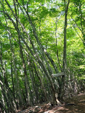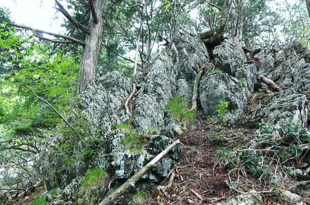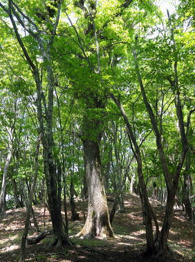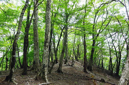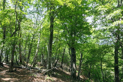 | 奥多摩の都県界尾根最西北部. 長沢脊陵の滝谷ノ頭と天祖山 ・・奥多摩.奥秩父東部概念図.山行表 2012年05月. 東日原から天目山横篶尾根―七蹴山から大平山.峠尾根・・浦山川俣 2018年12月. クラミクボから中段歩道にでてクラミクボ右岸尾根・板形尾根―天目山山腹道から横篶尾根を下り見通尾根・・滝上谷と間違える 2019年09月. 大栗ノ頭大栗尾根から長沢脊稜・ハナド岩―板形ノ頭板形尾根から1160m圏南尾根を経て賀郎橋を周遊・・再び挑む 2013年05月. 小川谷橋からタワ尾根.長沢背稜.天祖山赤石尾根を周回・・旧日原街道.日原林道.日原街道 2016年04月. 細久保橋から仙元谷.グミの滝を経て三ッドッケ.シャクナン尾根―板形尾根.中段歩道からカロー大滝を経て小川谷左岸水平道 2013年07月. 鍾乳洞から周遊.小川谷右岸上段歩道から篶坂ノ丸材木小屋尾根―篶坂ノ丸オロセー尾根・・日原林道.日原街道 2022年11月. 小川谷林道.吊橋から篶坂ノ丸材木小屋尾根―タワ尾根から金袋山・人形山のワイド.ミズナラから旧道に入る・・東日原から周回 2015年05月. 日原鍾乳洞bs⇔一石山を経て小川谷左岸下段歩道から篶坂尾根―オロセ尾根から孫惣谷左岸作業道.林道孫惣谷線.日原線 2015年09月. 旧倉沢集落―倉沢谷山腹道―横篶山幕岩支尾根―一杯水小屋分岐道―ハナド岩,板形尾根―カロー谷中腹道―小川谷左岸中腹道 2018年05月. 日原林道ゲートから天祖山表参道を経て南.中腹道を横切り周遊・・日原林道・日原街道 2016年06月. 高丸山ツバノ尾根の取付きを間違い偵察と渓谷納涼.又久し振り本格的な藪に出遭う 孫惣谷を取り囲む奥多摩源流の山々と尾根群・・タワ尾根.長沢脊稜.天祖山赤石尾根 タワ尾根を詰め孫惣谷の源流部で奥多摩の深みを知り.天祖山から鍛冶小屋窪右岸沿いにミズナラ茂る「楢平の森」に入る 東日原からタワ尾根・長沢脊稜に天祖山南面の赤石尾根を経て最終目的の楢平へ。日原林道.街道と周回し東日原 2013年05月26日.松村 タワ尾根と一石山からウトウノ頭を経て滝谷ノ峰・・金袋山のミズナラとてんぐ巣病 長沢脊陵から梯子坂ノクビレ.天祖山 天祖山赤石尾根と楢平.ガニ沢出合カツラ 奥多摩最奥の山 漸く土.日曜日の時間が取れるようなり.奥多摩.中日原以西の山域に初めて入山する。 初めての山域に入る時は何時もながら歳の割に気をわくわくさせられ意気込んでいる。新緑の若葉溢れる孫惣谷周辺の巨樹の山域に入る。 環境省は巨樹について「地上1.3mにおける幹周が3m以上」と定義している。 平成12.13年の調査では全国で約6万5千本の巨樹が確認され.都道府県別では東京都の3800本が最も多い。 そのうち1000本を超える巨樹が奥多摩町にあり.なかでも日原川上流の左岸域が巨樹の宝庫になっている。と「バリエイションハイキング」松浦本は謳っている。 まずは巨樹を尋ねながら新緑のタワ尾根を登り.周囲の全体像を掴み.長沢脊稜から天祖山に回って.孫惣谷を囲む尾根を周回する積りでいる。 絶好の登山日和を迎えた日曜日.多くのハイカーと出会うだろう。入山は小川谷上段歩道から人形山東尾根を歩み.周りの雰囲気を掴もうと考えていた。 ただ先の時間の掛かりが初めてのことで掴めず.一石山からタワ尾根へと最短距離で登ることにした。 タワ尾根は小川谷と孫惣谷の分水嶺を成し.長沢脊稜の滝谷ノ峰(タワ尾根ノ頭)に突き上げる尾根。「タワ」とは「山の尾根のたわんだところ」とあり. タワ尾根には尾根筋をつかず離れず.まとわりつくよう細道が縦横に走っている。その搦む道を歩む。 天祖山から南面の中腹を横切る旧日原街道.今は水源林巡視路として利用され.支尾根の赤石尾根から楢平に回り込み. ミズナラの巨樹の森を訪れたいと思っている。ただ避難路として旧道から日原林道下る側壁が問題で. 落石防止網が多く張めぐされて下る地点が限られていると聞く。上手く日没前に下れれば良いが。 5月26日(日)快晴後曇 jr御徒町4:49=神田5:00=5:55立川=6:34青梅:35=7:17jr奥多摩.西東京バス¥450. 7:25=7:50東日原bs. 奥多摩駅発の東日原行路線バスは常に満杯の人気コース.今日も増発されている。 先行した路線バスは乗車.終点の東日原まで14人が残り.殆どが川乗橋で降りている。又私を含めた3人が日原街道を辿る。 そして小川谷橋を渡った分岐で林道日原線を左に分け.釣人ともう1人のハイカーとも別れている。 小川谷沿いの街道は晩春の強い朝の陽差しに照らされている。木洩れ日の多くなった頭上には雲1つない紺碧の天空が仰がれている。 日原街道を最後まで1人歩む。一石山神社前のPには既に3台のマイカーが駐車していた。 石尾根.鷹ノ巣山の北尾根群 ![]() 六ッ石山.鷹ノ巣山.稲村岩尾根.ヒルメシクイノタワからの鷹ノ巣山尾根.八丁尾根 タル沢尾根.カラ沢尾根.ネズミサス尾根.稲村岩尾根.稲村岩.鷹ノ巣尾根・・右端は日原街道の中日原の集落 今年の2月にはノボリ尾根から石尾根鷹ノ巣山を横断し.稲村岩の下りで滑落遭難事故現場に出偶わしている。・・中日原上流より撮影.7:56 タワ尾根は水松山と酉谷山の