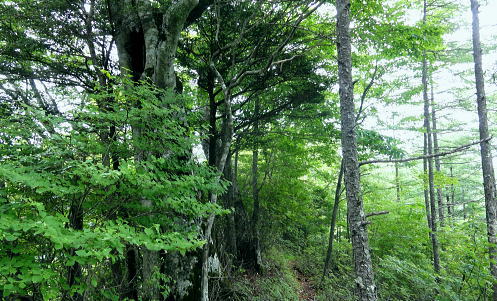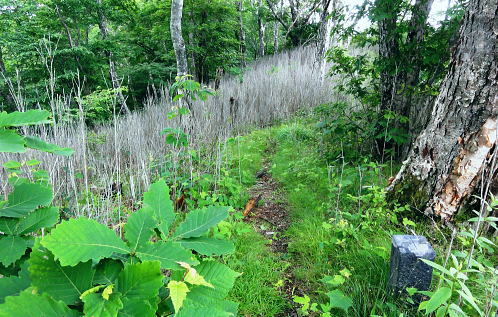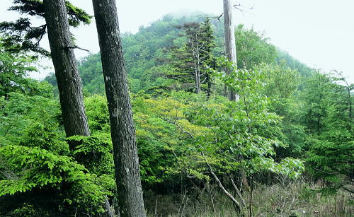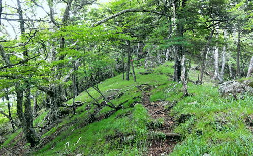 | 楢ノ木尾根の上半を詰める。藪山から遊歩道化が進み.展望に恵まれる尾根 南尾根から背稜に乗り.唐松立.森の大樺ノ頭.雁ケ腹摺山へ・・尾根上の鉄塔巡視路を歩み深城線・葛野川線鉄塔基部に立つ 林道奈良子線から泣坂ノ頭南尾根を詰める 楢ノ木尾根に乗り唐松立.大樺ノ頭へと上半を登り詰めた雁ケ腹摺山・・葛野川流域の展望と小金沢シオジの森 姥子山から奈良子線.真木小金沢線林道を下り桑西 楢ノ木尾根唐松立 泣坂ノ頭下りで.11:06楢ノ木尾根.唐松立〜西沢ノ頭写真・・大岱山分岐の苗場より.2012.01 雁ケ腹摺山楢ノ木尾根 10:55泣坂ノ頭一11:25小コブ一11:52深城線29号鉄塔一12:43唐松立葛野川線5号鉄塔13:00 一13:40大樺ノ頭一雁ケ腹摺山. 泣坂 泣坂ノ頭からナラ.ミズナラの大木がある急斜面を下れば.切り通状の泣坂ノタルにでる。 「甲斐の山山」小林経雄著によると「この急坂を泣坂というがその由来は大樺あたりから狩に疲れて返るとき, この急坂に掛かるとつらく泣きたくなるからだという。」と記している。 現実的なストレートな坂名だった。普通は登り坂なり.石転び・転付など間接的な言葉が多く使われている。 「泣」の付く字は感傷的なものが強く響き伝わってくる。心を奪われ泣く泣く登る.或いは別れ離れなければならない言葉など。 奥多摩には猟場への道として.地形的に「登り尾根」と名ざす尾根が奥多摩湖の北岸に2つある。 2.3年前に新玉川橋から三頭山に登った折.登山道に合流してから「オツネノ泣き峠」の道票を見ている。ここでは現実的な地形ではなく感情的な涙。 若い僧と恋に陥り.和尚は修行に差支えると峠越えの寺に移し.通うおつねは夜明けに別れで泣く泣く三頭の急坂を越えていた。 切り開きの泣坂ノタル.11:12小金沢道 北面一帯が落葉松の若木帯に変わると切り通しのタルには確りした踏み跡径が横切っていた。 岩科氏の著書によると泣坂ノタルは古くからの小金沢中腹林道が昭和8年頃開通した。その名残りだと云う。 矢竹の集落から泣坂ノタルまでを「古い道」としてをり.小金沢側の林道とはこの泣坂ノタルで結ばれていた。 この山道は三ッ石タツマ下の小金沢側の今の巡視路から泣坂ノタルとを並行して結び.今は通う人もなく廃道化されている。 古い道 「古い道」は泣坂ノタルから二階谷と山椒沢との間のコシホネ1370m付近下.即ち泣坂ノ頭南尾根の1250m付近で. 泣坂ノ頭を回り込み,南尾根をその間々横切り山椒沢に入っている。このルートは南尾根の1067mコブ直ぐ北側の枝沢に突き上げている。 出合あたりまで山椒沢を下り.対岸に渡り.ほぼ水平状に小尾根を越え.大サス沢に入り.ハナタテ岩の下の矢竹の集落に至るルート。 北面を望む. 米代長峰と牛寝通り 最初の1360m圏コブより.11:18牛寝通りの大マテイ山と奈良倉山 米代長峰の白草ノ頭とイネツチノ頭 ![]() 最初のコブ.11:28 1409m点コブ手前の登りで.11:37 11:41 11:44深城線29号鉄塔 11:52尾根上を西側に向かう.1409m点コブ先の1390m圏に建つ. 三ッ石タツマ 11:55深城線鉄塔 楢ノ木尾根上の29号鉄塔基部からの眺望はない。頭上は幾らか更に薄暗くなってきた。 高雲の空の中層に黒い雨雲らしきものが漂い始めている。午後になり降らなければよいが? 深城線29号鉄塔から僅かで巨石が2つ。そしてと離れてもう1つ.尾根筋を塞いでいた。 その脇の立木の幹に黄色いテープに「ここは三ッ石タツマ」とマジックで書き添いがあった。 更に10mほど進むと東電の「29号.28号に至る」の古い鉄塔巡視路標柱がある。 南側に延びる用グラツリ尾根には深城線鉄塔が幾つもが建ち.巡視路が綴られている。この送電線はナラ立1205mからセイメイバンへの尾根を下り. 大月市街地に建つ笛駒線120号鉄塔から分岐された送電線。この深城線は一般的な発想と異なり里から山へ.発電所へと送電されている。 1つ先の枝尾根にも北側に下る巡視路標柱があり.「30号.31号鉄塔に至る」の葛野川線の巡視路標柱があった。 ここは踏み跡径を含め全てが送電線の巡視路になっている。29号鉄塔からの楢ノ木の尾根筋は更に歩き易い踏み跡になっている。 この送電線は里に向かうにつれ鉄塔番号は弱番となり.里から葛野川揚水式発電所へ送電されている。 前途したように里から発電所へと.トンチのような形態になっている。夜間の揚水用に用いられているようだ。 11:58 12:12 12:26葛野川線5号鉄塔 ![]() 平頂の唐松立に建つ.北西を向く鉄塔.12:43 葛野川線鉄塔 深城線に続き再び鉄塔基部に立つ。唐松立1597m.地名からすると伐採により落葉松林が剥ぎ取られたのか? 興ざめする風景だが.その上に500KVの巨大な葛野川線5号鉄塔が建てられ.笹子の新山梨変電所内で西群馬幹線220号鉄塔と結ばれている。 超高圧の電力は後のリニア中央新幹線の開通に伴い.その動力供給を担っているようだ。 山頂,基部からの眺望はすこぶるよい。前方に雁ケ腹摺山. 足元には奈良子林道が刻まれ.S字に回り込む山並を望んでいる。 北側は葛野川二俣で分れた本流は土室川と川名を変え.米代長峰と牛ノ寝通りを隔て
