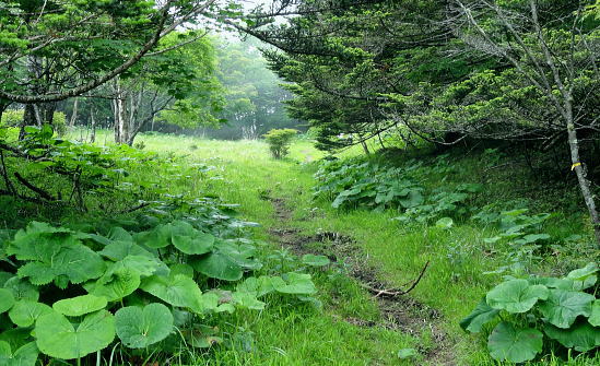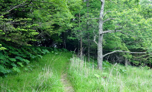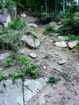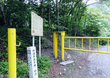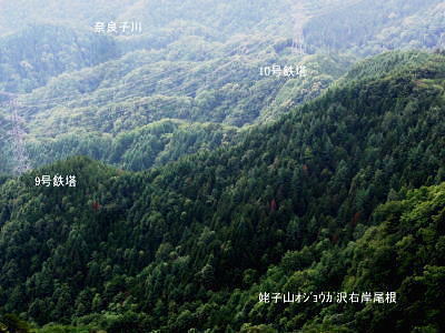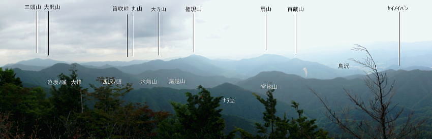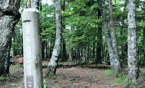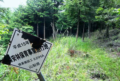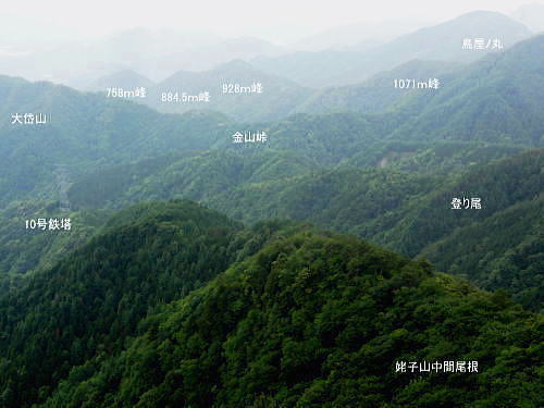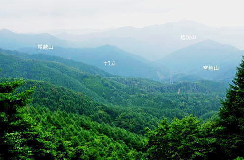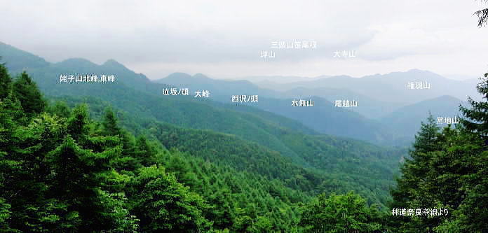 | 奈良子林道から始まり.真木小金沢線林道に繋がる長い一日 黒木覆う雁ケ腹摺山から登り尾で姥子山―夕暮れ迫り吹切峰真木川左岸尾根は諦め.2つの林道を繋ぎ桑西へ 林道奈良子線から泣坂ノ頭南尾根を詰める 楢ノ木尾根に乗り唐松立.大樺ノ頭へと上半を登り詰め雁ケ腹摺山 姥子山にでて林道奈良子線から真木小金沢線へと繋げ桑西・・鹿と野猿 雁ケ腹摺山 頂はブナ.黒木のコメツガの森雁ケ腹摺山・・雁ケ腹摺山の頂の北側はコメツガの黒木に覆われている。 それに反し南斜面の草付きは眺望に恵まれ.五百円紙幣の裏面に印刷された富士山の原画にもなっている。 (1942年11月.名取久作氏によって撮影され.製造は1985年まで。) ただ今日は今にも降りだしそうな重い雨雲に覆われていた。期待した五百円紙幣と比べ望むことはできなかった。 又この後.綴る南東側にある姥子山と共に「大月市の秀麗富嶽十二景」の1つに選べられている。 つい数年前までは「大月市の秀麗富嶽十二景」の標柱はよく目に付くも,全く関係のないものと考えていた。 それが一昨年の春に表道志に初めて訪れ.気に掛かりだし.集計してみると残りは高川山だけになっていた。 看板には「熊よけに幹にロープを巻く」とある姥子山から林道を繋ぎ桑西へ 14:25雁ケ腹摺山一15:18奈良子林道登山口15:55⇔15:38姥子山. 林道登山口15:50一16:51吹切峰真木川左岸尾根取付き17:15一17:35真木橋 一17:45林道奈良子線終点一17:45林道焼山沢線の起点一18:19林道桑西線の起点一18:50桑西bs. 雁ケ腹摺 雁ケ腹摺山の西側.黒岳との間には大峠と呼ばれる大きく窪んだ鞍部がある。 この峠越えは真木小金沢林道の開通に共ない.雁ケ腹摺山周辺の山々を目指す.多くのハイカーには気楽に訪れることができるようなった。 ただタクシー料金は¥9000弱になる。私にとってはキツイ懐になっている。 大峠は渡り鳥.雁の鳥道を創り.タルミの意味で雁ケ原摺と呼ばれている。この周辺にはそれに類する山や峠が多くある。 雁ケ腹摺山以外に牛奥雁ケ原摺山.笹子雁ケ原摺山.もう1つ大和町の雲母山の支尾根に日影雁ケ原摺山(岩崎山1150m)がある。 雁ケ腹摺山の名を冠する山が近くに4座が聳え.それだけこの周辺は渡り鳥の山越が多いということだろうか。 大菩薩嶺から連なる小金沢連嶺の黒岳から東側へ派生した尾根は雁ケ腹摺山を起こし.三方に支尾根を延ばしている。 東側に延びる尾根は今綴って来た楢ノ木尾根. 正に大樺尾根で.大峰で南に向きを変え.瀬戸境として奈良子川の出合で終えている。 南東に延びる尾根は姥子山に至り.南に延びる吹切尾根で.野分ノ頭を経て花咲山へと続き.笹子川に没している。 又吹切尾根にある野分ノ頭から東方へ分岐した尾根は大岱山で更に二分し.東は宮地山.南東はセイメイバンを経て大月の岩殿山に至っている。 振り返るとこの1年.年末までの間に.どの尾根をも少しだけでも齧り始めるほど.大菩薩の南東部に通い続けたことになる。 今回は雁ケ腹摺山の南面.姥子山に登り.吹切尾根に掛かる林道を横断している。 登り戸 明るい南面の草付広場.14:48草地の広場の右上が雁ケ原摺山 姥子山への径に入る.14:48 姥子山への径.14:56雁ケ腹摺山南面の明るい緑豊かな草原を下り.直ぐ大峠への登山道を右手に分け.南東に延びる姥子山への登り尾を下る。 道標がよく整備され穏やかな高原のような登山道に変わっていた。35分ほどで更に広く開かれた。 未だ下草の生えぬ裸土の台地の白樺平にでる。ここは真っ平だった。 白樺平 白樺平(石ノネカ)で右手(南)に金山峠への登り尾の登山道を分け.少し離れた先の道標には姥子山への道しるべがあり. 直進すれば5分ほどで鞍部にでる。楢ノ木尾根南面の山腹を大きく回り込んできた奈良子林道で.今朝泣坂ノ頭南尾根を登りつつ望んだ林道。 この林道は朝方の起点から歩んできた奈良子線の丁度鞍部に当たり.裸土の林道を横切れば向かい側が姥子山への登山口が現れる。 県営奈良子線は起点.大月市七久保町大字奈良子と終点.大月市大月町大字真木を結ぶ林道で.県営真木小金沢線と繋がれている。 林道の延長は22.286m.奈良子側はダートで真木側12.179mが舗装されていた。 幅員3.6〜4.0m.標高のピークは約1480m.登り始めてからの標高差は約1200mになる。 林道奈良子線・・鞍部の西脇 姥子山登山口からピストン.15:18林道から頂への距離は16分ほどと短いが以外と手強い山径になっていた。 露岩混ざりの岩峰を縫い登るようなる。細長い稜は南北共に切れ落ちた痩せ尾根を示していた。 まずは振り返ると下ってきた雁ケ腹摺山を頂点とした楢ノ木尾根が緑深く望まれる。そこには雨雲が追い上げ頂へ 近づく様子が伺える。降りそうで降らぬ雨粒.もう降るぞと留まっている。又遠くに雷鳴らしき響きを聞いてもいた。 雁ケ腹摺山.大樺ノ頭 姥子山々頂.15:34姥子山は双子峰. 東西二峰からなり.西峰はミズナラ.モミ.ツガなどが生え.尾根状の峰で眺望はない。 それに比べ東峰は南面に断崖をもち独立峰的で.三方の眺望に優れている。 姥子山ルー