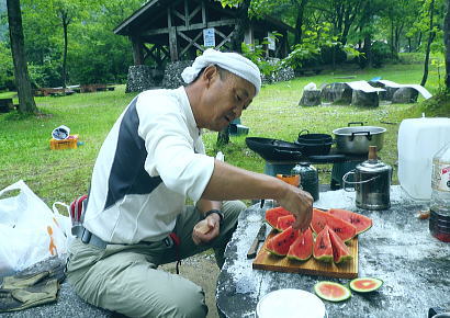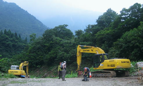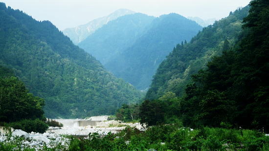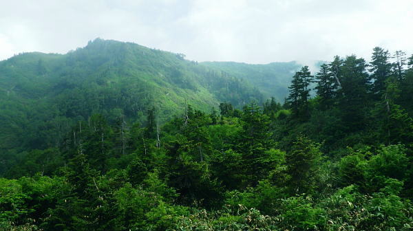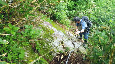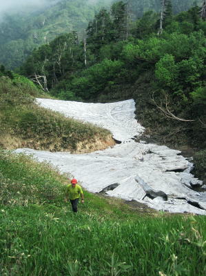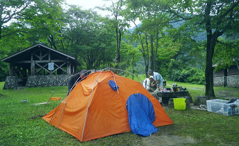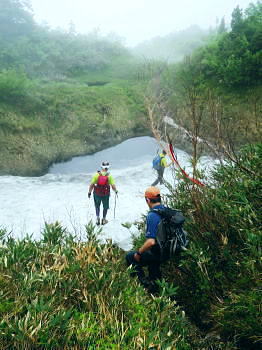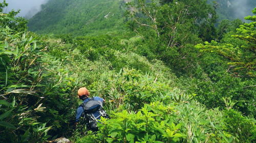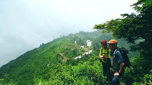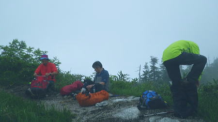 | 剱岳北方稜線.大猫山・・剱岳周辺Top 梅雨末期の豪雨に遭遇. 北方稜線猫又山に入山したものの.途中までも進むことができず断念していた。 最短でもよいからと北方稜線の肩に触れることだけでもと馬場島bcから大猫山を直登でピストンする 2013年07月26〜28日. L松村(s43卒)m見城(s41卒)滝島(s42卒)鈴木(s43卒)加波(s53卒) 北方稜線 北方稜線とは剱岳から北方へ宇奈月まで延びる長尾根を呼び.中央部に毛勝三山(毛勝山.釜谷山.猫又山)が聳えている。 狭義では南部の池ノ平山から剱岳山頂までを指していようだ。学生時代は真砂沢をベースに剱岳剣岳東面の尾根と谷を集中的に登り. 卒業後には早月尾根から八峰・チンネを回り込み.長次郎谷へ下っている。その意味ではほんの一部を齧っているだけだった。 今回は踏み跡が確りしていると聞き.地元滑川町に住む後輩.加波君と共に馬場島からブナグラ峠へ辿り.北方稜線にでて猫又山に立つ。 更に東芦見尾根から大猫山に抜ける周回するルートを選んでいた。 28日朝東京を発ち,馬場島にベースを設け.翌日猫又山に登り.最終日は里山の中山に寄り.立山杉の巨樹と北方稜線から 連なる剱岳や猫又山の展望を楽しみ帰京する予定でいた。それが連日の猛暑と蒸す暑さは前線を更に刺激し不安定な気象状況を生んでいた。 梅雨前線 まだ梅雨明けを待つ北陸,東北地方は日本海にある梅雨前線を境にして.大陸の湿舌と太平洋高気圧に挟まれていた。 刺激を受けた梅雨前線が各地に局地的なゲリラ豪雨をもたらしていた。気象庁泣かせの天候は更にPポイントを狂わしている。 明日は北方稜線猫又山に登る。その日さえ持ち堪えてくればよいのだが。 金沢では2週間続いた好天が18日頃から崩れ始め.翌日からは陽射しが漏れる天気雨模様になっていた。 20日は40%と湿度は低くなるも不安定さは変わらなかった。 特に日本海側各地で局地的ゲリラ豪雨が乱発し.記録的短時間大雨情報が気象庁から発表された。 豪雨で大ブナグラ谷の枝沢は増水で渡渉ができず.逆コースに変更し.ほぼ予定タイム通り大猫山に立っている。 この先は頂稜満歩になる筈だった。ただここから猫又山までは往復4時間半を費やすこと。 梅雨末期の天候不順はその後の行程全てを狂わしている。大猫山での霧雨は周りを真っ暗闇にさせ始めていた。 遅い下山を避けて先を諦め戻るも途中から激雨に叩かれた。大猫山から戻っている。 7月26日(金).高曇 jr御徒町¥160 5:45=東武池袋.\500快速6:30=7:11若葉.集合=鶴ケ島IC¥6400=9:00東部湯ノ丸PA =11:25北陸道滑川IC=滑川.買出し13:00=上市北馬場島線=14:00馬場島bc1 馬場島キャンプ場 馬場島にベースキャンプ設営.14:36 若葉集合 7時11分.全員が東武若葉駅前に集合. 休む間もなく高速道に入り上信越道を下る。今回は北側の上越方面も.又南側の西上州の山々も 鉛色の重い層雲に覆われている。疎らながら高みに雲の切れ目を見るも.すっきりした山並を眺める気分はなくなっている。 碓氷峠を越え東部湯ノ丸PAで一息し.上信越道を一気に抜けている。峠越えが空に明るさをもたらしていた。 それも一時の風景. 飯縄山.黒姫山は厚い雨雲から薄れているものの.何処もが同じような丸みをもった山容にしか眺められなくなる。 その奥が高妻の山並だった。 妙高の長い裾野を横切り.北陸道に入ると上越市も真近に迫り,日本海沿いではトンネルが多くなる。 潜り抜け黒部市に入いれば.滑川ICはもう直ぐ.丁度4時間でICを降りている。薄日が照り付け真夏の陽射しに戻された。 ここ滑川町常光寺は後輩の加波君が住み.明日朝.馬場島で合流し一緒に登る手筈にもなっていた。 滑川 一般道にでて買い出しと昼食を摂ろうと「ほたるいかミュージアム」に寄る。この時期.観光客目当ての賑やかさは欠けている。 周辺の寂しさは平日と云うことだけではなさそうだ。裏側に回ると砂浜の長い防波堤にぶち当たり.日本海の海岸線にでる。 薄日が射すも淡い灰色に染まる空が海原を覆い.白雲が湧き煌めく真夏の水平線は望められなかった。 凪の海.砂浜の明るさは控えめに海面までもが淀んでいるよう思えた。 ホタルイカ ホタルイカの産卵期3〜5月を除けばミュージアムは閑散としている。富山湾のホタリイカは普段は水深200〜600mの深海に生息し. この時期の夜になると大群をなして浅場に集まり.ホタルイカの美食を味わえる。 富山市成願寺河口から魚津港までの沖合1.3kmまでの海面は「ホタルイカ群遊海面」として.国の特別記念物にも指定され. 神秘のホタルイカとして「富山県のさかな」に指定されていた。 海抜0m. 数年前に大雪渓から白馬岳を越え.栂海新道を同期大川と日本海を目指し北上していた。 そして親不知の絶壁を下り.ヒスイ海岸の小さな丸石が敷き占められた海岸で.素足を海に浸けている。感無量のひと時だった。 山行中は一度も望めなかった日本海. 国道にでて初めて海の香りを嗅ぎ.素足で波打ち際から盛夏の地平線を当時仰いでいる。 日本海から上高地まで.この歳になり繋がった。今回は反対に日本