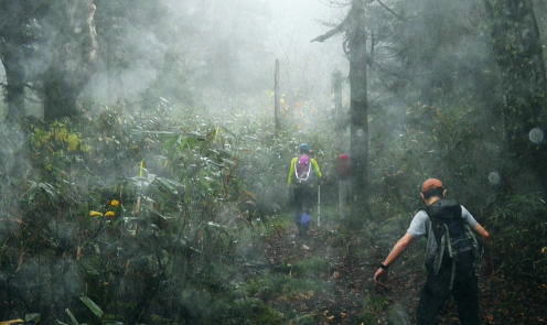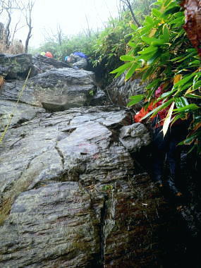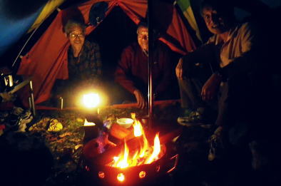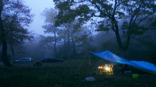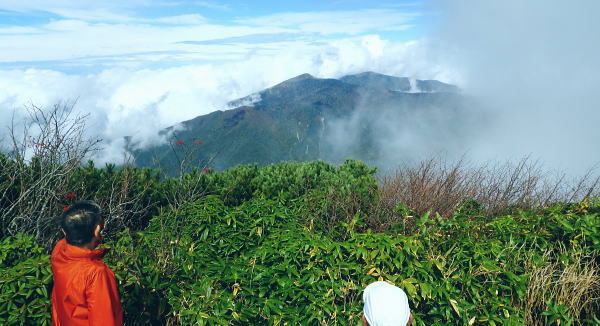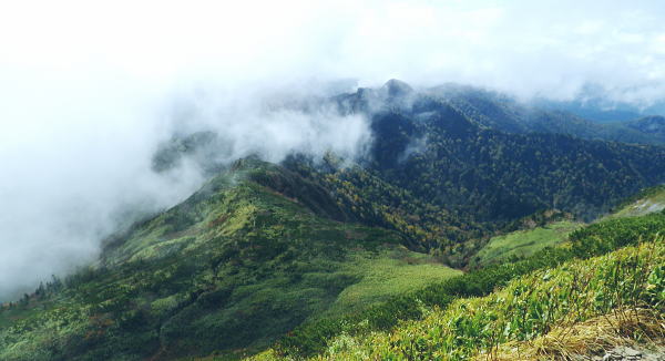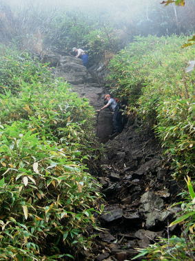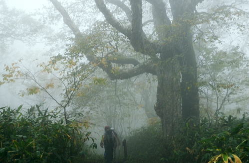 | ゆけむり街道を綴り.再び奥利根の晩秋の「水源の森」を起点にを田代湿原から.上州武尊を山ピストン 2013年10月10〜12日 L松村.m見城.滝島.鈴木 「水源の森」から濃霧の上州武尊山・・突然ガスは途切れ頂から望む至仏山 日当たりの復路.翌日は更に奥利根へとゆけむり街道へ 上州武尊山は上州片品村沼田市.みなかみ町.川場村の4市町村に跨る独立峰で.古くから山岳信仰の山として崇められてきた。 又武尊山の裾野を取り囲む街道を繋ぐ道路は現在「ゆけむり街道」として親しまれていた。 昔は金精峠や尾瀬口として武尊山の表側の街道として.沼田駅から路線バスに揺られ.沼田街道を通るのが常だった。 2010年10月.会津浅草岳からの帰路.三国街道から猿ケ京に入り.「ゆけむり街道」を綴って.奥利根「水源の森」に寄っている。 今回はその逆ルートで入山し.中秋のブナの森に囲まれた「水源の森」にベースキャンプを設け.上州武尊山の頂を目指す。時期も丁度同じ頃だった。 1974年12月に木賊から薄根川川場谷遡行している。尾根まで登れず.氷雪に閉ざされ.造林小屋で野宿し中退していた。それ以来の本峰登山になる。 奥利根「水源の森」キャンプ場.14:13曇天の山 前日9日の午前中に台風24号は温帯低気圧に変わり.10日は本州一帯は移動性高気圧に覆われ,晴れ間が多くなる。 暖かい南風は全国的に9月上旬〜中旬並みの気温になり.西日本では真夏日も多かった。 前線が本州南岸を抜けるも日本海には高気圧帯が残り.下層は南風の暖湿気が流入している。 朝方出発時.自宅前では下層に積雲が南風に乗り.上層は北よりの筋雲が共に強く流れているのを見上げている。 台風後の好天は長続きしなかった。関越道を取り囲む山々は層雲に覆われ.山々の頂を望むこともできなくなっている。 沼田のスーパーで買い出しを済ませ.道の駅で昼食を摂るまではよかった。「奥利根ゆけむり街道」に入ると完全に雨雲に覆われた。 奥利根ゆけむり街道 川場尾根.背嶺(花咲)峠の隧道を抜け.武尊山の南面の裾を横切ると幡谷にでる。そして大きくUターンし沼田街道に入る。 片品(鎌田)で金精峠への街道を右に分けている。左前方には武尊山が眺められる筈だがもう低い雨雲に覆われ望められず。 又この辺は針葉樹が多いこともあり.紅葉は疎ら過ぎていた。車は戸倉から坤六峠へ一気の登り詰めている。 鳩待峠への分岐, 看板には「車の規制は15日まで」と記されていた。人気の尾瀬も連休を過ぎれば終わりを迎える。休まず「水源の森」へ。 ジグザグにハンドルを切ると雑木林に囲まれ.山肌は次第に赤.黄葉の賑やかさが増し.細久保沢を渡れば.出合の「水源の森」にでる。 今回はここにベースキャンプを設け.上州武尊山をピストンする。 焚火用釜を囲みキャンプが始まる10月10日(木).曇後霧雨 jr御徒町¥160+5¥00. 7:26=7:55池袋東上線急行8:00=8:42若葉.全員集合9:06=T邸=9:31鶴ケ島IC =10:30沼田IC=スーパー「ベイシヤ」.買い出し11:10=道の駅「川場田園フラザ」.昼食12:10=13:05坤六峠(こんろく) =13:35奥利根「水源の森」キャンプ場. 沼田ICを降り。「ゆけむり街道」を綴り上州武尊山の裏側に当たる目的のキャンプ地「水源の森」にでる。 キャンプ場から望む武尊山は位置からして南西に聳えている筈だがここからは牛首山の山腹に阻まれている。 その上まだ昼下りだが層雲は厚さを増し.周りを薄暗くさせていた。 それでも明るい台地. この先直ぐ下流には照葉峡があり.今旬の紅葉美が渓谷を絨毯の如く被いを飾り立てている。 陽さえ射していれば自然林の混合黄葉が煌めき.樹葉の一枚.一枚に新たなうぶきを与え.鮮やかさ錦絵の紅葉を増させることだろう。 ただ天空は更にどんより落ち始めていた。 ここ「水源の森」は標高1400m. 西山(1898m三角点峰)西麓周辺に広がるブナの森林帯。 林野庁が選定したブナの森にあり.木ノ根沢源流の細久保沢.左ノ又沢.右ノ又沢.マキバ沢の各出合が絡まっていた。 流水は利根川水系湯ノ小屋沢木ノ根沢で奈良俣ダム直下にあり利根川に合流している。 緩やかな河原状の台地が広く開かれ,ブナの森には幾つもの遊歩道があり,整備されていた。駐車場に天幕使用可.無料.無人 新緑.黄葉の景勝地. 5/下旬〜11/上旬.紅葉は10/上旬〜11/下旬が見頃。 昨年7月から周遊道路は一方通行になる。又下流は直ぐ雑木の渓谷になり.色彩豊かな樹葉が覆い照葉峡の絶景を創っている。 その沢沿いに走る県道水上片品線は別名「ゆけむり街道」。 霧雨.日没前にシート掛けテント口へ移動 ![]() シート下に釜と照明器を並べる 天幕は夏に馬場島で使用した5人天.30年前のテントだが確りしている。今回は前回は馬場島のキャンプ. 反省から雨シートとブルーシートを共に大き目のものを使用した。そして幕営には雨を覚悟して設定場所も考慮している。 最近は山と山生活を主に.滝さんが炊事道具を多く持ち込み。テント生活を楽しく盛り上げている。 アルコール類も考慮.ビールに焼酎.ウィスキーに地酒「谷川岳」を購入。ビールは半ダースほど残る程度