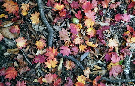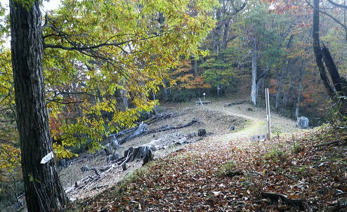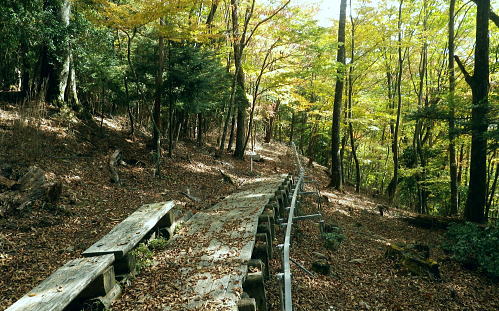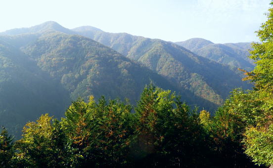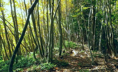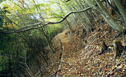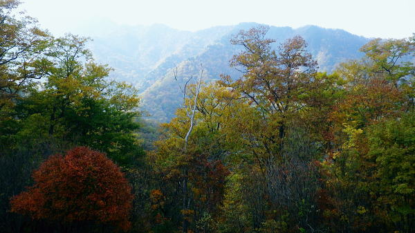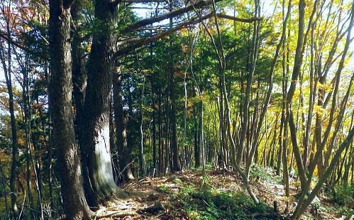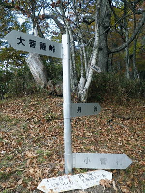 | 丹波川源流の南岸の山々. 小菅川.小室川谷.大黒茂谷の流域・・大菩薩嶺北尾根周辺Top ・・多摩川小菅川流域Top 丹波大菩薩道を経て大黒茂谷の源流の水源林巡視路を歩む 川久保.中指山南東尾根を経て小室川谷を横切り.大菩薩嶺北尾根を横断。大黒茂谷上流では夕暮れが迫り踏み跡を失い野宿する。 翌朝はコースを変更し高度を取るため最短ルートで大菩薩嶺手前の北尾根1980m圏コブを詰め大菩薩嶺を越えている。途中で小屋番と連絡が取れホッと。 頂からは予約していた丸川峠.丸川荘に直進し「大菩薩の湯」バス停に下山した。 2013年11月01〜02日.松村 川久保から中指山南東尾根から丹波大菩薩道・・分水嶺を越え ノーメダワから小室川谷.三ノタルを横断し大黒茂谷上流で野宿 北尾根1980m圏コブ北西尾根からダイレクトに大菩薩嶺.丸川峠 大菩薩嶺連嶺にはこの数年通い続けているものの.殆どが南大菩薩連嶺に入り.北部に入るのは2009年09月の大菩薩嶺北尾根以来になる。 今回は北尾根.三ノタルを十字に横断し.大黒茂谷の源流に入る積りでいる。丸川峠の「丸川荘」に宿をお願いし. 翌日は小菅川源流から右岸中腹道を下り.入山時の川久保に戻り周回する計算を立てている。 10月31日(木)の予定が小屋主の都合で休業. 小屋としては無雪期最後の連休で紅葉もよく.買い出しに走り回り.翌日の2時半か. 3時までには私の為に山小屋を開いて頂けると無理にお願いした。後は天候のみ.一人歩み静かな山旅を期待していた。 しかし大黒茂谷源流で黄昏が迫り.エレキで泉水十文字へのルートを探すも.自分の踏み跡で分からなくなり.早めに野宿する。 翌日は改めて早朝からルートを探るも先が分からず.時間だけが過ぎ.圏外で丸川荘への連絡が取れず.夜半.考えた末.早く携帯電話の繋がるルートに変更する。 遭難騒ぎになってはと。早く高みに出なければと足元の大菩薩嶺.最短な北尾根の最上部位置する枝尾根を詰め. 高度を稼ぎ.漸く朝7時に電話が繋がり,まずホッとした。「丸川荘」の主人只木貞吉氏からは携帯の記録によると4度連絡を頂いている。 大騒ぎにならずホッとし.自宅に電話してから先を考える。 まずは枝尾根のツメから大菩薩嶺に立ち.小菅川源流を下る訳にもいかず.諦めて丸川荘に寄り.「大菩薩の湯」回りで下山した。 11月01日(金)快晴 jr御徒町5:00=5:04神田:12=6:08立川:10=7:27奥多摩.小菅行西東京バス¥950. :33=8:22川久保bs. 高指山南東尾根から村界尾根.丹波大菩薩道 川久保bs8:22一8:41中指山南東尾根上祠一8:56橋立林道横断一10:25中指山一11:09「51/52」林斑界標 一11:50追分「52/2」一12:05ノーメダワ「65/61」林斑界標.大12:50. 丹波川南岸の暮秋に彩られた尾根 丹波川南岸には柳沢峠から北東方へと鶏冠山から大菩薩嶺.サカリ山.大丹波峠.鹿倉山,大寺山と繋がり.奥多摩湖に落ちる長大な尾根がある。 今回は丸川峠から今川峠の間の山域を山行の対象に選び.重川芦戸沢.日川と小菅川北面に挟まれた流域を目指した。 サカリ山は丹波川南岸の鹿倉山から続く尾根上にあり.小栃山とも呼ばれている。丹波大菩薩道が追分からマリコ川沿いに 丹波へ下ってしまうため.踏み跡はある程度の不遇な山となっている。小菅の川久保からダイレクトに中指山南東尾根を狙い取付くことにした。 まず中指山から追分.ノーメダワを目指しす。本来なら川久保から今川峠にでて.峠の北側から尾根に取り付くところ.省き.中指山に乗ることにした。 中指山南東尾根末端 旧青梅街道.川久保地区より.8:23手前が小菅川支流宮川宮川橋. 旧青梅街道は正面方向に進めば橋立地区へ.小菅バス停に至る。 今年の春にも,奥多摩湖北岸から青梅街道を辿っている。深山(みやま)橋を渡り.小菅川沿いの旧青梅街道に入るのは2度目。 一昨年の2月には小菅川を齧り.新玉川橋から入小沢ノ峰北西尾根を登り.牛飼尾根を下って三頭山を横断し.長作から鶴川を下っていた。 入山 晩秋になると甲信越地方は移動性高気圧の影響を受け.広く晴天に恵まれた。 裾野の紅葉はまだ先のように思えるが.澄んだ大気が集落の隅々まで行き渡り.朝の陽光が大地を暖めだしている。 狭まった谷間の渓流にも朝陽は注ぎ込み.沢沿いは何処も流心を煌めかせ輝いていた。仰ぐ天空は深く蒼い。 今日の路線バスは乗客10人と久し振り多かった。ハイカー7人がjr奥多摩駅からに乗り込む。 途中で降りたのは地元の人だけだった。終点小菅の1つ手前. 川久保で私を含め.2人組の女性が初めて降りている。 この周辺は小菅川の河原段丘にあたり.河原段丘の窪地から「川久保」と呼ぶようなったらしい。 若い彼女達は地元の人に道を尋ねている。牛ノ寝通り.大マテイ山への登山口に入るようだった。 中指山南東尾根 中指山南東尾根は中指山の頭から南東に延びる尾根で.西沢と宮川に挟まれた小菅川の川久保に没している。 宮川右岸尾根に位置し.詰めた村界尾根は又丹波川と小菅川の分水嶺をなし.共に川沿いに青梅街道と旧青梅街道が綴れていた。 尾根の西側,追分分岐からは丹波大菩薩道が延び.昔は盛