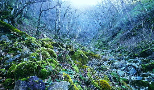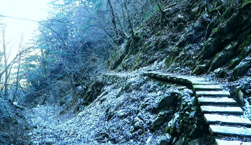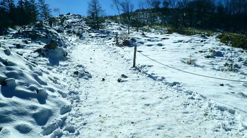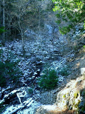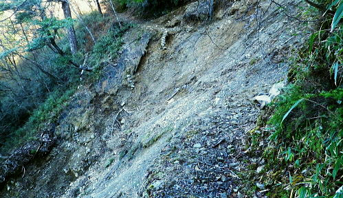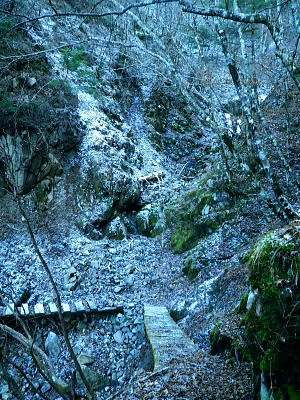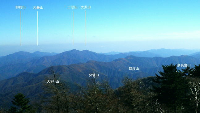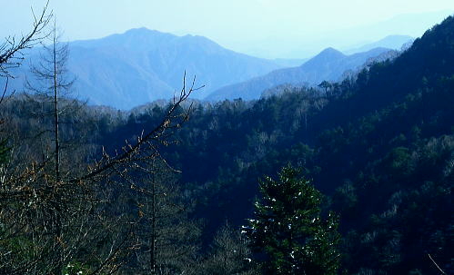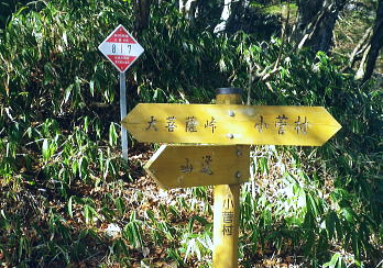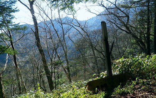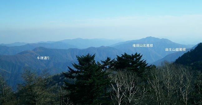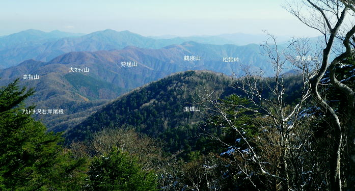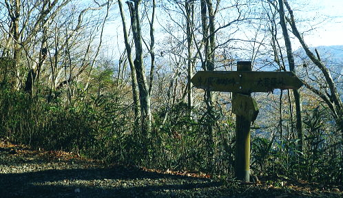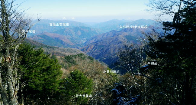 | 丹波ぢ菩薩道を下り荷渡し場の分岐から牛ノ寝通りへ.小菅川源流経路伝いに回り込む 甲州裏街道・丹波山道から小菅川源流経路 旧大菩薩峠に立ち.丹波山大菩薩道の荷渡し場から新雪に埋まる熊沢山南山腹の経路を綴り.牛ノ寝通りへ 上日川峠から富士見新道.旧大菩薩峠 丹波大菩薩道から小菅川源流を横断・・新雪被る経路 牛ノ寝通りから小菅川上流右岸と左岸道 親不知ノ頭 旧大菩薩峠から大菩薩峠へ.11:30![]() 小菅川源流 10:55避難小屋.大11:30一11:40大菩薩峠一12:05荷渡し場一12:33棚沢一13:03ガレ場一13:17天狗棚沢 一13:21牛ノ寝通り1530m付近. 入山の道中.バスの運転手から「昨日は三鷹駅の事故で.定刻を40分遅れて上日川峠に向い.頂は前日の新雪が積り. 昼まで煌めき輝いていた。」と教えて頂いた。私も本来なら頂で今季初めての処女雪を踏んでいる筈だった。事故で諦め戻り帰宅している。 その一日遅れの残骸が斑に雪塊を残していた。 僅かに登り返すと親不知ノ頭にでる。ここに残雪があることを考慮すると東側の山陰. 小菅川源流は残雪に埋もれていることだろう。 不安が募る。まだ見ぬ巡視路の難易の程度も分からず.又川久保まで周回できぬのではと案じていた。 横断するには予定より時間を掛かりそうだ。その場合の下山ルートを考える。 地図を読むと牛ノ寝通りを1時間ほど下った所に狩場がある。そこから狩場沢左岸沿いの巡視路を下れば白糸滝P下の小菅林道にでられる。 この巡視路は確りした石垣道のようだ。その上尾根歩きと違った枝尾根と裾野では紅葉美が味わえるかも。 万が一の場合は走れる。17時15分発のバスに十分間に合うだろう。ホッとし分からぬ源流に入ることにした。 親不知ノ頭からの大展望・・小金沢連嶺と日川尾根 親不知ノ頭から大菩薩湖.11:35賽ノ河原の南側コブ. 親不知ノ頭までの斜面は以外と快い雪面に覆われていた。そして立ったコブからは壮大な展望が開かれる。 今日,幾度も見渡している山並は少し違った場所から眺めると新たな新鮮味を味わっている。 又横断.縦断を重ね合わせる内.見る目の立体感も養わされていた。 小金沢連嶺と日川尾根に囲まれた大菩薩湖 大菩薩湖は葛野川揚水式発電所の上池にあたり.500KV送電線葛野川線で笹子川上流の新山梨変電所に送電されている。 ダムで水没する前の小金沢はまれに見る美しい渓谷だった。昔は黄金沢とも呼ばれ.落葉松林の樹林帯に囲まれていた。 遥か昔になるが50年前の3月.高校時代に同級生が集まり裂石登山口から小金沢連嶺を越え初狩駅に下りている。 浅いラッセルを築き湖のなかった雪原を見つつ南下し.湯ノ沢峠から初狩駅へ下りていた。 ここから見える巨大鉄塔群は全て西群馬幹線の送電線鉄塔で西丹沢の新富士変電所に送電されている。 上湖の大菩薩湖と日川尾根上半 中景・・大菩薩湖アップ中央が源次郎岳. 南下すれば徳並沢ノ頭. 西方へ派生する尾根は恩若ノ峰へ。 右の土色が上日川峠.その上の鉄塔は2週間振りに見る西群馬幹線192号鉄塔。 日川尾根下半・・甲府盆地と恩若ノ峰 右景・・遠方は南アルプス奥中央はは源次郎岳から派生した尾根. 恩若ノ峰から甲府盆地の東方.塩山に突き出し落ちている 熊沢山と新大菩薩峠 左景・・(新)大菩薩峠.11:38(新)大菩薩峠に建つのは介山荘. 左手が小菅川源流で.右下が今登り詰めた大菩薩湖に流れるヒンマワシ沢源流。 左遠方が葛野川左岸尾根・・正面の頭は権現山 圧倒的な大きな山容を誇る熊沢山. その東面の葛野川流域の山々は樹林に閉ざされ望めぬが小菅川源流の山々を足元に望む。 これから進むルートは小菅大菩薩道(丹波大菩薩道)から牛ノ寝通りへ.源流を横断する。そのルートを見で追うことができる。 贅沢な眺望だ。先程は稜に出て富士見新道のルートを追い。今は下るルートを追っている。知らずして満足感を味わっていた。 旧大菩薩峠からの東方・大展望・・源流と小菅川流域 左景・・旧大菩薩峠より.11:49左上が雲取山石尾根. 小菅川に隔てられた左下が丹波大菩薩道.むかし道。右手が牛ノ寝通り.中央が鹿倉山. 牛ノ寝通り・・榧ノ尾山1429.4mは玉蝶山の山陰になる。左奥が奥多摩三山 雲取山石尾根と丹波大菩薩道 左上アップ旧大菩薩峠北側コブよりサカリ山と1327m圏峰との鞍部が追分 大菩薩峠から丹波大菩薩道.むかし道が尾根筋を綴り.追分(サカリ山と1327m圏コブの間)から北側の丹波へ抜けている。 追分から先は中指山から今川峠へ続く村界尾根で水源林巡視路が尾根伝いに下りている。 牛寝通り全景 小菅川源流町界尾根と牛ノ寝通り 中景.11:40御前山,大岳山〜三頭山 牛ノ寝通り末端は葛野川左岸尾根を下り.権現山手前で分れ中央東線の扇山.百蔵山にでる。 更に目を左へ向かれば小菅川を隔てた奥多摩の山々が広がり.雲取山石尾根から奥秩父の山並が開かれていた。 葛野川左岸尾根と支流浅川川左岸尾根 右景妙見ノ頭から少し先の丹波大菩薩道に入った地点より これからのルートは丹波大菩薩道に入り.荷渡し場から小菅川源流を横断し.榧ノ尾山手