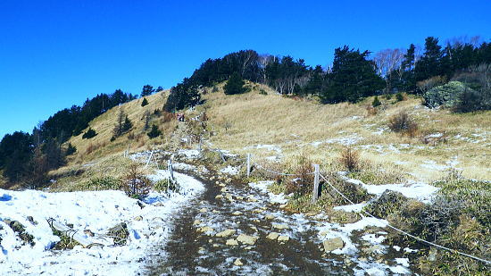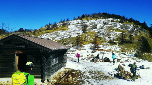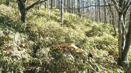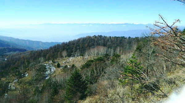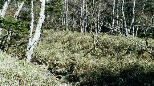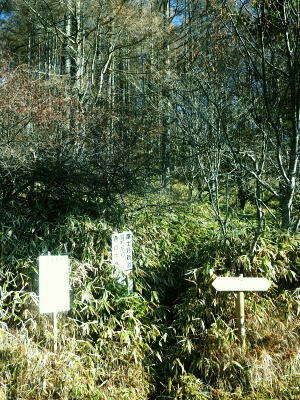| 大菩薩嶺南. 初冬の富士見新道から旧大菩薩峠.牛寝通り・・多摩川小菅川流域Top 上日川峠から富士見新道の岩場を経て旧大菩薩峠―荷渡し場から小菅川源流経路を綴り牛寝通りへ 下りはアカドチ沢右岸尾根を経て.林道雄滝線・小菅線で白糸ノ滝により小菅林道を橋立下へ降りる 2013年11月17日.松村 上日川峠から富士見新道.旧大菩薩峠・・jr事故で2日続き4時起床 小菅大菩薩道.荷渡し場から小菅川源流 牛ノ寝通りから小菅川上流右岸と左岸道 2週間前の山行では後半で大菩薩嶺北尾根からは大室川の支流.中沢の桟橋が豪雪により大崩壊し小菅川流域には入れなかった。 その為.改めてリベンジするべく.富士見新道を経て旧大菩薩峠にでて.小菅川源流の作業道から牛寝通りを経て.小菅川に入渓する。 小菅発一日4本のバスは午後2便.14時半と17時15分。平日は更に2本と間隔が長く.日没後の待ち時間を考えると土.日.休日の山行に限られていた。 秋の移動性高気圧に恵まれ.16日の早朝に出掛けたが三鷹駅で交換機の事故に遭遇し.中野駅で電車は動かなくなった。 諦め一度帰宅している。そして翌日に再びチャレンジした。小先を挫かれたような勇み足になるも.もう一度出向くしかなかった。 笹藪から冬木の岩稜を詰めている。私にとっては初雪を踏み.小菅道からは紅葉蘭欄たる渓谷美に触れ.その多彩な色合いを味わいながら下山した。 南アルプス 上日川峠より.8:27西側の樹間より・・白銀被る白峰三山と千丈ケ岳. 手前は笛吹川.重川流域 11月16日(土)快晴 jr御徒町5:11=神田5:20=中野.=御徒町・・三鷹で事故が起き.諦め帰宅した。・・2時間費やし運賃返却 11月17日(日).快晴 再びjr御徒町5:11=神田5:20=6:22八王子:30=7:35甲斐大和.臨時バス:45=8:25上日川峠bs 甲斐大和駅発の路線バス.大菩薩上日川線は昨日の中央線事故の影響で.40分遅れて発車したとのこと。 今日も登山日和に恵まれ.一列車でバス1台分のハイカーが集い.定刻時間前に臨時バスはでている。 5年前の師走.裂石から牛ノ寝通りを縦走し下山した折.甲斐大和駅発の上日川線が開通したことを知らされた。それから3度目の利用になる。 以前.上日川峠から重川左岸尾根を南下し.jrぶとう郷に下りている。又牛ノ寝通りと並行する長峰を下りた時は矢坪で車に拾われた。 それ以来の乗車で運が悪いのかよいのか.気儘な道中になろう。今回は北東部の小菅川に入渓し.奥深い渓流の紅葉美を味わう積りでいる。 バスの車窓から頂稜を見上げると一昨日の斑雪と霧氷が見られた。既に紅葉を終えた源流は樹葉を落とし.冬木の姿に覆われていた。 後半は逆に小菅川の源流を下るにつれ.次第に紅葉に満ち.蘭欄たる紅葉美に迎えられる筈である。それを期待し望む山になる。 勝緑荘の庭先より.8:56日川左岸の尾根に建つ紅白の西群馬幹線198号鉄塔 上日川峠bs78:25一8:51富士山荘一9:35右岸へ一9:45河原口一9:52雷岩の稜線を望む一10:15岩稜取付き 一10:41稜線一10:55大菩薩峠避難小屋.大11:30. 上日川峠から大菩薩峠への登山道の小径に入り.「福ちゃん荘」にでる。ここが雷岩にでる唐松尾根の取付き分岐. 更に林道で富士見平にでれば富士見新道の取付きにでる。旧富士見山荘の台地で名前の如く.遥か彼方に常に秀麗たる富士が望まれていた。 富士見新道 勝緑荘前の取付き.9:00その向かいの勝緑荘前には「お知らせ.クサリ腐食の為撤去しました危険です」.「富士見新道落石あり危険」.「←上日川峠.富士見平.大菩薩峠→」. 「富士見新道.富士見山荘分岐」と新道の取付きで.色々な注意を促す看板.道標が立てられていた。その間を抜け熊笹帯に入る。 隙間なく密なる熊笹帯を横切る取付きの熊笹の窓から入り込むと笹丈は低くなり.東面へ平坦な笹薮帯を綴ってゆく。 落葉松の地床はビッシり熊笹に埋められ.何か嬉しい気持ちをもたらしていた。そこを綴る踏み跡は確りしていた。 程よい茂みの笹原が足元の谷間に広がり.明るく開かれる大地が心地よい。 最初は涸れ沢を横切る.9:11 小尾根に乗る.9:34右下に沢が現れ.左岸沿いに回り込み.尾根をUターンする形で更に高みの右岸沿いへ回り込む。 1つ窪溝を横切り.涸れ沢を渡ると左岸の細い立木に「富士見新道」の古い小さな道標が立木に掛けられていた。 やや広い小尾根に乗りる。その沢を渡ると赤テープがあり.左岸沿いを歩むようなる。 確りした踏み跡に導かれた先では左岸に渡るようなった。右岸を見つつ進むが斜めに傾いた壊れた擬木の手摺りは. 何処にあるのか.分からなかった。樹林の密生で周りは幾らか薄暗い。周りを探すも道標を見付けることができないでいる。 沢筋から離れ南側の高みに回り込む.9:37 賽ノ河原分岐点より少し西側に寄った模様.9:46次第に疎林になり.左奥には明るい河原が望まれる所まできた。賽ノ河原への分岐はもう少し手前の右側にあった模様。 疎林を抜け草原状の明るい大地にでる。河原状の溝沿いを辿る。左上方に延びる唐松尾根寄りで1本取った。 左の河原沿いに出たようだ。下調べした道しるべのケルンもなければ「