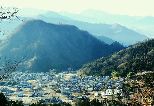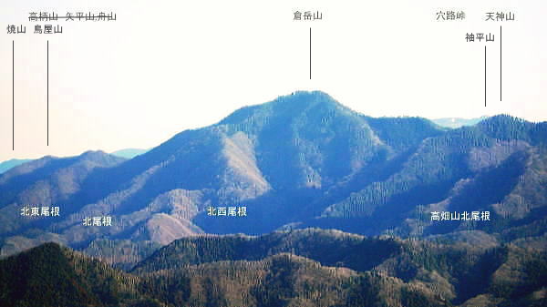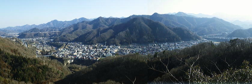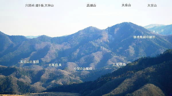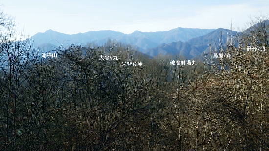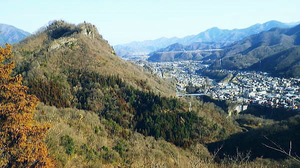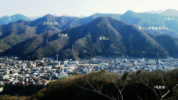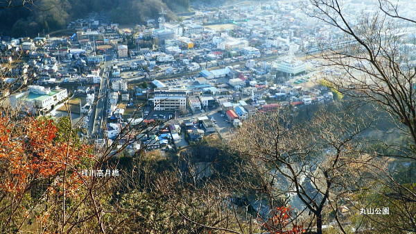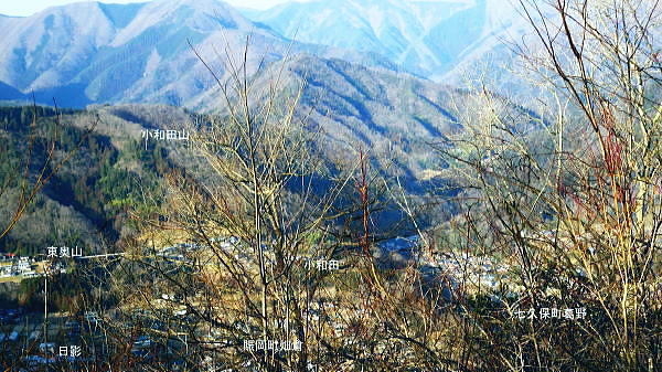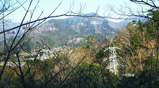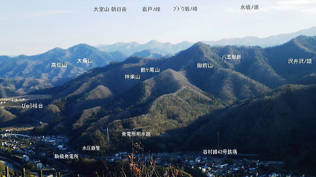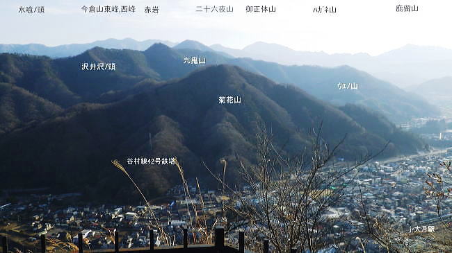 地形図「上野原」には新矢ノ根峠の北東方.直線距離にして1kmの所に御前山がある。このほか桂川に沿って2つの御前山が記されてをり. 通称四方津御前山.斧窪御前山と呼ばれている。「甲斐国志」巻之五十四に「御前山と称する山処々ニアリ恐ラクハ烽火台ノ跡ナリベシ」と 書かれているが.なぜ烽火台を御前と称したかは分かっていないとある。 ・・中央東線沿線の案内板・・梁川駅から笹子駅間,駅.街道 岩峰と480m圏コブ 2つの岩場ルートを越え岩殿山から振り返る.15:07岩殿山から東北方面のパノラマ・・大月市街 ![]() びゅう桂台の左上のコブは猿橋城山(武田氏の烽火台).右端は高川山東尾根の末端でむすび山にやはり烽火台がある。・・菊花山からの展望 前道志.西北端山稜・・対峙する菊花山 右景・・物見台より.15:23神楽山676.9mと駒橋御前山(厄王山)730m 中景手前の裾野は強瀬. 上流側の送電線谷村線鉄塔近くに駒橋発電所がある 前道志.秋山山稜・・大桑山と高畑山 中景の左アップ高畑山北尾根・・大桑山からは猿橋城山に至る北西尾根と3つの北尾根がある。 倉岳山と3つの北尾根 左景の左景高柄山733.2m.矢平山北尾根860.2m.舟山818m. 中央は倉岳山北東尾根・北尾根・北西尾根が延び.穴路峠を下り返せば高畑山. 北面の展望・・宮地山の奥が楢ノ木尾根・瀬戸境 15:30葛野川右岸大沢川沿いの山並 背に高く聳えるのが宮地山タカザス沢右岸尾根と南東尾根。重なる右奥が楢ノ木尾根と.更に葛野川左岸尾根になる。 手前がセイメイバン南東尾根と今回取付いた東尾根が末端にちょっと望まれた。東尾根は林集落から入山. 中央下の小和田にある東光寺裏が南東尾根の取付きで.小和田の集落をよく見ると5.6軒並ぶ真中に.若草色の屋根がある東光寺見えた。 大沢川沿いに集落が点々と群がり.東奥山.小和田と畑倉と下り.葛野川対岸が葛野地区になる。 上の写真を見て.この2年間で6つのコースを歩んでいる。楢ノ木尾根.奈良倉山以外はみな冬期に限られていた。 この流域付近では猟師や獣達ともまだ出偶すことはなかった。鹿以外では丹波.笹子周辺で猪,熊に何度か遭っている。 それに比べ奥多摩地区では確率が高く.入山の都度猟師に遇うほどだった。猟師に遇えば猟場を聞き避けて登り返している。 瀬戸境・セイメイバン南東尾根の末端部 右景アップ写真.15:30瀬戸境・・水無山と尾越山 葛野川支流の小俣川奈良子川出合付近と大沢川流域・・下瀬戸・葛野・畑倉地区 天神山と笹平 岩殿山より.15:31笹平から浅利川左岸尾根(深城線鉄塔尾根)の尾根末端.天神山に回り込み.終着の岩殿山に立っている。 見納めの大月南側に回り込んだ桂川本流流域 最後の丸山公園遊歩道より.15:32逆光の田野倉と足元の大月市街地 大月市街地 丸山公園分岐より見下ろす駅前通り.15:39向かいが菊花山の裾と岩殿山との狭い間に密生する大月の市街地。 中央右上のタワービルと通り向かいのビルが東電の大月支社.その斜め上にjr大月駅ホームが見下ろせた。 右下,足元直下が丸山公園・・「岩殿山ふれあい館」と上部の盛り上がりが丸山444.4mで桜の宴は見事らしい。 手前の植林帯の林相の境を下り.丸山公園を経て市街地に降りている。 丸山公園の石段 岩殿山からの下りはピストンのよく整備された丸山公園遊歩道を下る。下り始めて直ぐ.珍しく右ヒザを痛めている。 硬い石段を下ると足に掛る反復が強く伝わり.動けなくなる。坂道ではまだ痛みを感じないが階段は疲れが顕著に現れた。 道幅広く立派な階段も傾斜が強過ぎ.できるだけ階段の狭い側縁の坂を歩くよう気を配る。 又里から長い階段は飽きぬよう色々工夫して造られた節がある。一般の石段とは別に長めの階段だったり.舗装された坂道に裸土の坂道. 又路面に点々と浮石を埋め込み.ステップ替わりにした変化も考え.時には緩い歩道も造られていた。それでも足は降参していた。 中腹にある丸山公園にでる。この下には中央道の岩殿隧道が走り.台地には中世の城をイメージした「岩殿山ふれあい館」が建てられていた。 丸山をぐるりと一周し.頂から30分ほどで岩殿隧道を跨ぎ.最後の石段から国道139号線.通称大月線の岩殿城跡入口にでている。 国道を右に入ると直ぐ.右上に無料駐車場があり.左には桂川(相模川)高月橋が架かっていた。渡った南詰の信号で高月橋.右折している。 直進すれば大月橋入口交差点から甲州街道R20にでて.更に右折を繰り返せば大回りして大月駅の玄関口にでる。 橋から右折後は道なりに進むと左手に東電大月支社があり.通りの右斜め前には高い鉄塔と並ぶJRと東電の変電所がある。 深城線1号鉄塔に繋がる笛駒線202号鉄塔が目の前に見上げられた。斜陽した陽射しを受け.鉄塔群は赤味を帯び共に煌めき輝いていた。 夕日を浴びる岩殿山 jr大月駅上り線ホームより.16:24高尾山・スカイツリーと同じ高さの岩殿山は標高634m,。右奥は百倉山. 右裾の大きな建物は東電の大月支社で.隣りに変電所がある岩殿山をの手前を横切る笛駒線。鞍部を越すのがjr上-大線の送電線。 東電