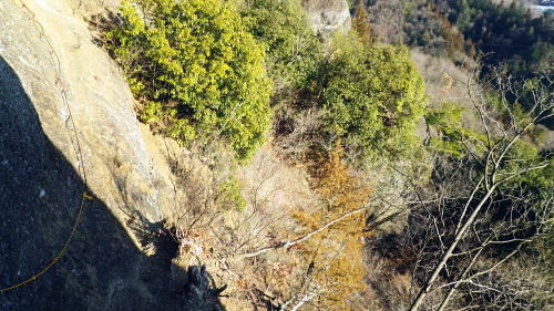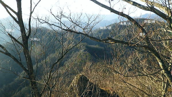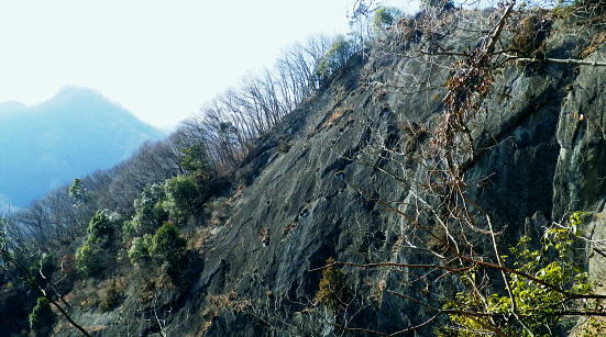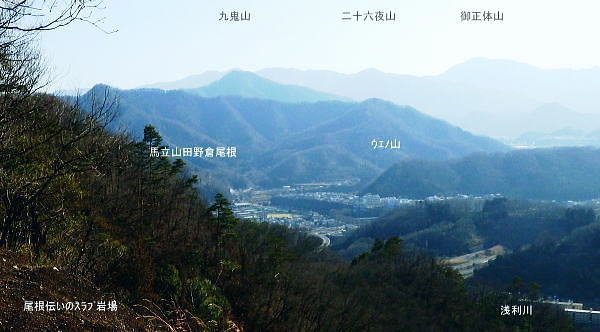 | ・・武田氏陣営の御前山と道志山塊の展望 大月市街地を中心として四方に対峙する山々 2013年08月. 梅久保山・・雁ケ腹摺山吹切尾根末端の低山 2013年09月. 菊花山・・九鬼山北尾根末端の低山 2014年01月. 岩殿山(天神山)・・大垈山から南下する深城線鉄塔尾根末端の低山 2015年02月. むすび山・・高川山東尾根末端の低山(御前山) 戦国史と伝説の台地 大垈山から南方へ派生する鉄塔尾根を南下―末端の天神山から兜岩.鎧岩.ツリガネ岩を経て岩殿山.丸山公園・・大展望と眼下.大月の街並 林地区からセイメイバン東尾根を経て深城鉄塔尾根 葛籠峠から更に南下し笹平・稚児落とし 稚児落としから尾根末端の天神山と岩殿山・・伝説と御前山.南半球の大展望.深城線鉄塔全線 稚児落し〜天神山 花咲山から浅利の下りで花咲山南東尾根の末端の浅利に下り展望台より撮影・・2013.03.30/10:43 浅利川 稚児落としの東脇に深城線の2号鉄塔が建ち.天神山山頂には1号鉄塔が建てられている。 背には百蔵山.扇山の大きな山容が構え.目立つ手前の岩峰が岩殿山。天神山から左に折れ.岩壁を攀じり.筑坂峠を経て岩殿山に立つ。 右下を貫くのは中央高速道の浅利川に架かる大月橋. 渡って天神山の下を隧道で潜り.岩殿山へ抜けている。 稚児落し 浅利川沿いのスラブの岩場より.13:54天神山側からの伝説では「呼ばわりの谷「稚児落し」.13:58 更に南下し岩殿山へ 13:58稚児落し一14:15天神山一14:25兜岩分岐一14:50築坂峠一15:17丸山公園分岐:35⇔15:20岩殿山. 一15:50丸山公園一16:00登山口一16:15jr大月駅. 稚児落しと葛籠峠 よく知られた伝説に岩殿山の西北西1.5キロに屏風のような絶壁を三方にめぐらした「稚児落し」があり.ここで談話すると四方に響くため. 村人は「呼ばわり谷」と呼んでいた。天正10年(1582年)3月に岩殿城落城の時.城主小山田信茂の千鳥夫人は家来の小幡弥三郎を呼び. 「お前はこの葛籠を背負って.子供2人を連れて.私と一緒に落ち延びてくれ。私はこの藤丸を背負っていくから」と申し伝えた。 千鳥と弥三郎が「呼びわり谷」の上にたどり着くと脊中の藤丸が泣き出し.泣き声があたりに鳴り響いた。 敵兵に見付かることを恐れた千鳥は「私はここで自害するが.お前は2人の子供を連れて.首尾よく落ちてくれ。 ただし背中の葛籠には大事なものが入っているので粗末しないように」と申し伝えると泣いている藤丸を谷の底に投げ落とし. 自分も喉を切って自害した。 弥三郎は2人の子供を手に取って尾根伝いに北へ向かったが子供とはぐれ.重い葛籠は肩に食い込みついに思いあまって投げ捨てた。 地元では千鳥が乳飲み子を投げ捨てた「呼ばわり谷」を「稚児落とし」.弥三郎が葛籠を投げしてた峠を「葛籠峠」と呼ぶようなる。 葛籠の中には」何が入っていたかは謎の間々である。・・「バリエイションルートを楽しむ」松浦本 鉄塔尾根末端と天神山 右下は浅利川出合と大月市街地.13:50鉄塔尾根の末端に建つ深城線2号.1号鉄塔。背は道志西側の山々・・左は高畑山と大桑山. 右上は馬立山田野倉尾根に乗る九鬼山 右端中央は高川山から繋がる末端のむすび山(武田氏の烽火台) 桂川右岸流域・・道志の山々と九鬼山北尾根 右に切り開かれたスラブの岩場より.13:55右端奥がはハガネ山. 反対に右手前は花咲山の東裾に当たり浅利の集落になる 深城線2号鉄塔基部 基部より振り返る3号・4号鉄塔.14:04天神山 浅利川左岸沿いに高く切れ立った尾根伝いを下り.2号鉄塔基部を過ぎると最南端にあたる天神山590mにでる。 登山道がL字状に左に折れる角には浅利天神様のコンクリート製の堅牢な祠があった。 中には菅原道真公が納められ.大月の市街地を向き祀られている。 この急稜の台地の近くにはもう1つ山越えの道があったらしい。「通りの天神」と云っていた乗越が? 現在中央道が通り.地形は全く変貌してしまっている。岩殿地区に.その頃の峠道らしき一部が残されていた。その登り口に天神がある。 足元には稚児落しに続くガレ落ちる絶壁が連なり.藪絡みの茂みの下に浅利隧道を潜る中央道が見下ろされた。 ここからは鋭い土壁の藪で落ちている。 丁度浅利川の対岸. 花咲山から岩殿山の下を貫く中央道を見下ろした風景が対面になる。・・2013.08 「大雪警報」 下山して10日後.2週間続きて関東甲信地方は豪雪で大荒れになった。低気圧(8日3時.1002hpa)が発達. 本州南岸を北東進し.東京23区に「大雪警報」が発表され.45年振りの積雪27pを記録した。 又14日には再び南岸低気圧の影響を受け「大雪警報」が関東甲信地方に発表され.甲府の最深積雪は114pを記録する。 今までの倍以上の積雪で山形を抜き.秋田.新潟に迫る勢いの新記録を樹立。 国道20号線大月インター前の国道は完全に積雪に埋もれ.中央道から出られず.関東では珍しく延長40kmにも及び車数百台が立往生する。 国道では大月警察のパトカーが遭難.レッカー.除雪車も進めず.自力で逃れる他なかった。・・山梨日日新聞.東京14時で1002hpa. 15日17時のテレビニュースでは雪に埋まる中央道大月橋外側の上