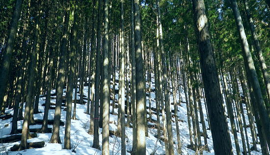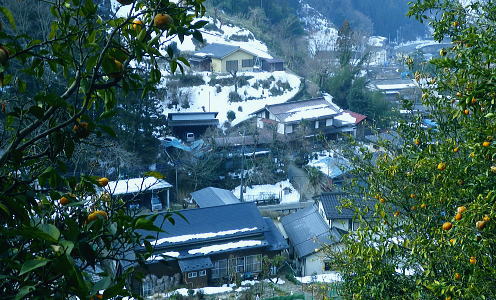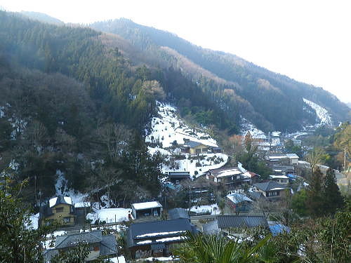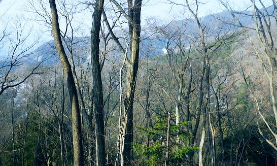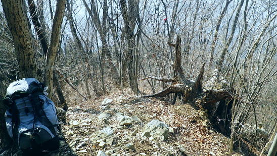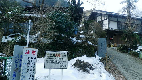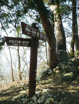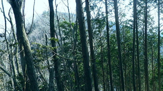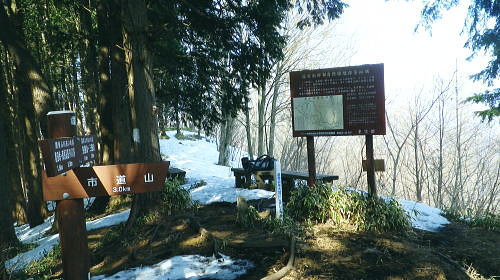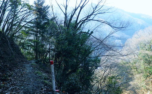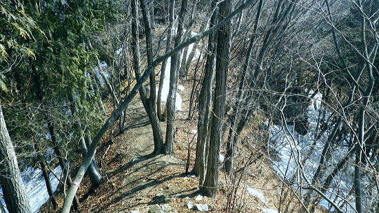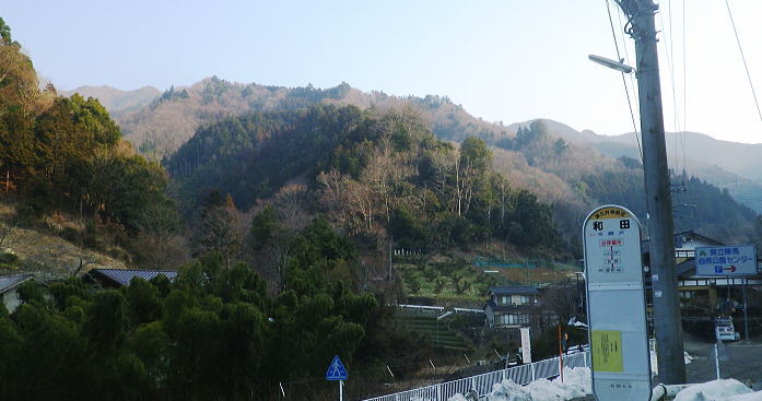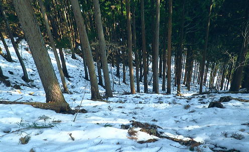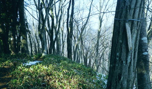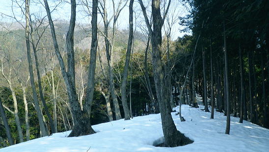 | 続.雪山低山の戸倉二山. コの字形の主稜と支尾根上に乗る日陰本田山の珍しい形の地形・・笹尾根鶏冠尾根Top 沢井川.和田から草木尾根を詰め大蔵里山.醍醐丸.市道山.臼杵山と吊尾根から戸倉山の残雪を南北に縦断する 和田から鶏冠尾根に乗り醍醐丸から雪原に覆われた吊り尾根を綴り.市道山から臼杵山グミ尾根。荷田子峠から荷田子の里にでる 2014年03月12日.松村 和田から草木尾根を詰め鶏冠尾根に乗る・・柚子と取り付きの獣仕掛け 醍醐丸からウルシガヤノ頭と旧醍醐峠.峰見通り分岐から市道山 ぬかるんだ残雪の臼杵山グミ尾根から荷田子峠 前回は東京近郊の低山にも拘らず積雪1mの豪雪.高尾山に入り城山から南高尾山稜へと武相尾根を一日中ラッセルし.強い日差しを浴びていた。 それから2週間経ち更なる残雪を求め.北高尾山稜の北側に面する醍醐.戸倉山区に初めて入山した。残雪低山の山歩きを味わう。 今回は北側に面する八王子市とあきる野市の市界尾根の吊尾根を綴り.戸倉二山を目指すことにした。 前半は草木尾根から醍醐丸にでて.吊尾根に踏み込むと伐採帯を覆う広大な雪原が開.れた。後半は植林帯の雪道を最後まで綴っている。 この山域に入るのは初めて。豪雪から2週間経ち積雪量が掴めぬ間々.雪原化した吊尾根からの未知の山並に好奇心を抱いていた。 南面に当たる陣馬街道.和田から最短のルートを取り.草木尾根の木洩れ日を浴びながら.鶏冠尾根へとまず醍醐丸を目指す。そして吊尾根を北上した。 豪雪から2週間が経ち.積雪の具合を見計らいながら雪粒を蹴り.戸倉の山々をのんびり歩む。 北側の斜面には踏み固められたトレースが築かれている筈である。又コースを外すことも考え輪カンジキを持参するか? 最後まで悩む。 流域としては相模湖北岸の沢井川から入り.北秋川の支流盆堀川の流域の低山を抜けている。 草木尾根から鶏冠尾根 和田bsから草木尾根を目指す.7:42左端に並行する連行峰の鎌沢尾根は先程バスで通過した鎌沢バス停で下車すれば尾根末端に取付ける。 又バス停から右に折れれば栃本林道に入り.草木尾根を横切り.栃本川を渡って古橋から踏み跡を南下すると鎌沢尾根に乗れるルートが取れる。 右奥が大蔵里尾根になる。和田bsからの取付きは手前になり.草木尾根末端の560m圏で尾根を2つに分けている。 その右尾根の杉の樹林帯からまず取付く。 jr御徒町¥1.110. 5:36=5:40神田:45=6:24高尾6:46=7:18藤野.津久井神奈川交バス.¥240. 7:23=7:37終点和田bs jr藤野駅発7時23分の始発の路線バスに合わせ.ゆっくり自宅をでる。 高尾に入ると残雪と云うより残り雪が路肩や北側の日陰に見られる程度。列車内は久し振りのラッシュで.立席をも見ている。 初めてjr藤野駅に降りたのは一昨年.猛暑トレーイングで草木尾根の左隣りに当たる連行峰鎌川尾根を詰め.笹尾根から横切る形で万六尾根に乗り. 万六ノ頭北東尾根を下っている。猛暑が続き.人影は少なく始発路線バスは平日でも土.日の休日便に変更されていた。 それを知らず.駅舎前広場で8時半まで待つ.罰の悪さを体験している。今回は私を含め3人の単独行者がバスを待っていた。 和田までの路線沿いの残り雪は谷間が深まれば増すのの南面の山麓。除雪され.雪塊は路肩の日陰にほんの少し見られる程度だった。 それに比べ日当たりのよい街道沿いの杉林は花粉を黒赤色に染め.今にも飛び散ちらせそうな構えを林全体が見せていた。 気象庁によると急に気温が高まり.東京など南関東ではスギ花粉の飛散がピークを迎え.今週末には多く飛ぶだろうと発表されている。 陣馬街道と和田の集落.7:48直ぐ上流側の登山口は一ノ尾ノ尾根620m点コブに突き上げる和田第二尾根コース. 草木尾根から鶏冠尾根 7:37和田bs一7:53草木尾根末端取付き一8:07作業道取付き一8:13尾根に乗る一9:34笹尾根に乗る一10:24醍醐丸 終点の和田バス停は和田の集落の一番下流に位置し.陣馬自然公園センター前にある。乗客3人が降り.それぞれの道を歩む。 出発間際.「陣馬から高尾山に抜けますか?」と尋ねられ.「五日市」に降りる積りです!」とお先に失礼した。 20年ほど前.子供達と何度か陣馬高原に遊びに来てをり.和田の里にも降りていた。ただ殆ど記憶は薄れている。 底沢峠から美女谷温泉.奈良子峠からは板谷川の陣渓園と湯舟を尋ねたのは覚えているものの.道中の風景は記憶から飛んでいる。 一ノ尾ノ尾根の登山口のもう1つのコース.7:49和田バス停から180mほど上流に進むと地図看板があり.沢井川を渡ると程なく林道標識のあるT字路にでる。 看板から更に180mほど歩むと右手に陣馬山一ノ尾ノ尾根中程の620mコブに上がるナシノキ尾根(和田第2尾根)の登山口を右に見る。 左に回り込めば和田尾根コースとも合わさっていた。 草木尾根末端の沢井川.木橋が取付き地点.7:53草木尾根末端 街道を和田峠に向かい集落の中を歩む。左手対岸に和田八坂神社を見ると街道は急に細くなり.沢井川を何度も渡り返して. 「やさか橋」.「下和田橋」と渡りと陣馬山一ノ尾ノ尾根への登山口を右