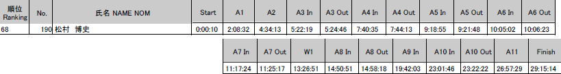 ULTRA-TRAIL Mt,FUJI 2014・・・息子が参加 2014.04.25〜26.富士山山麓一周.地元2県と10市町村の協力により開催 世界最高峰ウルトラトレイル・モンブランとウルタラトレイルの精神を共有する世界初の姉妹大会 スタート4月25日15:00.富士河口湖町八木崎公園.ゴール八木崎公園 距離約169km.累積標高差9.500m.制限時間46時間.参加料¥36.000 ![]() UTMF男子190. 68位(外国人.前22名). スタート00:00:10. トータル29:15:14. ![]() 完走率.UTMF男子69.5%. 全体59.7%. 参加者順位表 応援伴走する彼女とゴール山を下り自宅でライブ中継を見る。