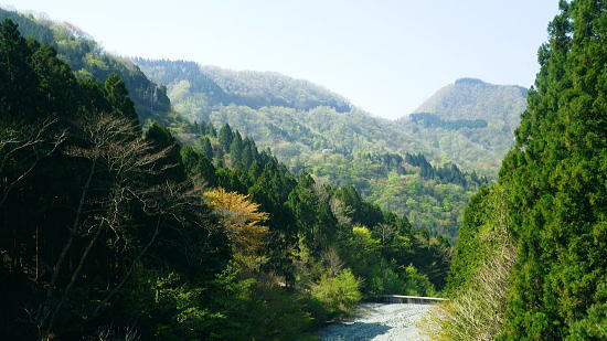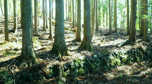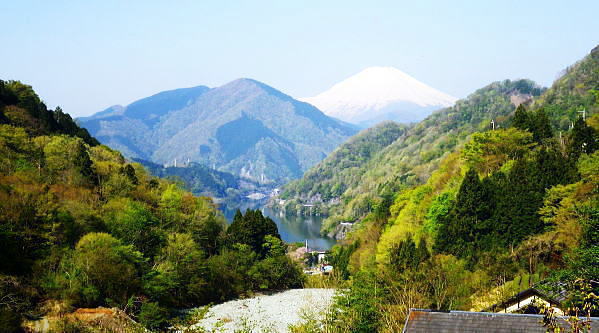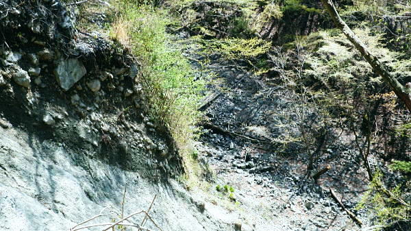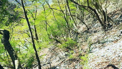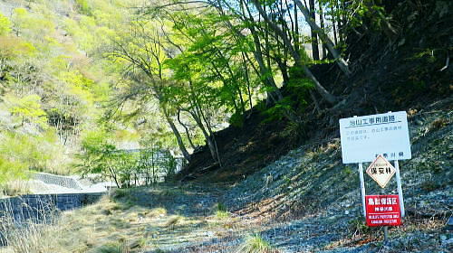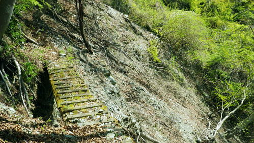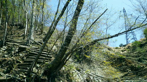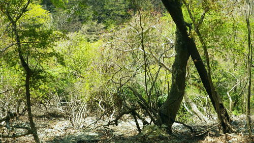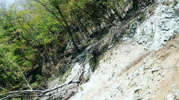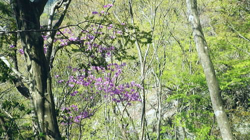 | 西丹沢.丹沢湖から中津川の源流を取り囲む尾根と峠路. 玄倉山神峠から雨山峠へ ・・丹沢山塊Top 玄倉から小菅沢を詰め.山神峠から中津川の源流の幾つもの支尾根を繋げ寄沢後沢を降りて中津川.宇津茂へ 秦野峠林道.玄倉経路.山神峠.檜山山稜.雨山峠.茅ノ木棚山稜.鍋割峠から鍋割山南山稜.後沢中間(左岸)尾根に回り込み寄沢林道を下る 2014年04月27日.単独 玄倉から秦野峠林道.玄倉径路を繋ぎ玄倉山ノ神峠・・新登山靴と肉離れ・巨樹の落木崩れ 檜岳山稜から茅ノ木棚山稜へと幾つもの峠路を越え鍋割峠 古い峠路.鍋割峠から鍋割山南山陵―後沢中間尾根からやどぎり森林遊歩道 鍋割山稜と茅ノ木棚山稜.檜岳山稜 箒杉沢のコルより.2008.11玄倉山神峠 玄倉林道は今だ崩壊が激しく閉鎖が続き.如何にか人だけは通行可能になっている。林道を横断してから既に1年の月日が経っている。 今回は小菅沢から旧玄倉径路を経て.山神峠に立つことを第一の目的でとし.中盤は玄倉川中流の左岸山稜を綴り.雨山峠越えし鍋割山南山陵を下る。 昨年は同角山稜からユーシンを経て南北に雨山峠を越えている。同じ時期を迎え.当時の雨山峠越えが私の脳裏に今まだ余韻として強く残されていた。 それ故後半は南山陵から後沢中間(左岸)尾根を下り.寄沢林道から宇津茂・寄bsにでることにした。 玄倉林道が完全開通する前に如何しても玄倉山神峠に立ちたく.もう懐かしくなった雨山峠と鍋割山稜を繋ぎ鍋割山にでるルートを考える。 それを踏まえ.玄倉から桧岳山稜を経て.雨山峠を横切り.茅ノ木棚山稜を詰めて.鍋割山南山稜から後沢乗越に回り込み.寄沢中間尾根を下る。 雨山峠を2つ目のポイントとし.周辺を取り巻く.4つの古道・旧峠路をも訪れてみることにした。少し欲張り過ぎたかも. 玄倉ノ野 玄倉集落と秦野峠林道.8:124月27日(日)快晴 jr御徒町¥170. 5:00=5:04神田:07=5:25小田急新宿.急行小田原行¥900. :31=6:51新松田.富士急湘南バス7:20 =8:05玄倉bs. 新松田駅発.西丹沢自然教室行のバスは増発された。5月の連休に先かげ.さすが丹沢だと思ったら30名もの団体さんが含まれている。 今回は丹沢湖東岸にある玄倉バス停に下車。快晴無風とまでは行かぬが予報では丹沢湖で正午に19℃になる。長閑な陽気の山行になろう。 不老山と富士山 小菅沢橋より丹沢湖東岸.8:26丹沢湖南岸を綴る小さな鉄塔は落合発電所と結ばれる落合線鉄塔群. 湖畔手前に建つのが18号鉄塔であり.玄倉の集落の中に建つ。 落合林道から山神峠への旧経路 玄倉bs8:05一8:36秦野峠林道ゲート一8:53(38号鉄塔)一9:18蕗平橋登山口一10:10大ガラ場一10:50玄倉山神峠. 落合林道(秦野峠林道.神縄神山線) 丹沢湖ビジターセンターの角から山北秦野線と分かれて.湖畔から右に折れ.道幅広い舗装された林道秦野峠線(落合林道)に入る。 玄倉集落手前縁から小菅沢左岸沿いの高台へ。枝沢の向沢橋を渡ると右脇に林道の標柱「起点から14km.終点1km」が立てられていた。 本流の鉄橋.小菅沢橋からは足元に玄倉集落が見下ろされている。丹沢湖の湖畔越しには世附権現山の姿が映し出されていた。 その先が西丹沢の西に当たる世附川流域になるのだろう。源頭を越えれば山中湖の湖畔にでる。 権現山の右肩には純白たる富嶽が鏡に反射したが如く眩しく望まれている。余りにものその山容の大きさにも驚かされている。 秦野峠林道ゲート.正面が富士.8:3624号鉄塔.後方に25号鉄塔が建つ 送電線落合線 右岸に移ると林道はジグザグを切り.右上高くに白いガードレールが横切るのを見て.このカーブを回り込み林道を省き.直登した。 出た所に閉ざされた林道のゲートがあった。その脇には落合線24号鉄塔が建ち.挟むよう25号鉄塔がある。 この送電線は丹沢湖.永歳橋付近の湖畔にある(新)落合発電所を起点とし.神奈川県企業局玄倉第二発電所を結ぶ66kV.1回線の送電線。 ビジターセンター裏に18号鉄塔が建ち.21号分岐鉄塔で第一発電所からの玄倉線と結ばれ.このゲート上を抜け山神峠の41号鉄塔に至り. 終番の45号鉄塔で玄倉川第二発電所と結ばれている。 送電線の名称は,古くは現在丹沢湖の湖水に沈む東電の旧落合発電所の送電線を利用しているためで.鉄塔番号も電流の流れに対し 逆番鉄塔になっている。そして湖底の発電所からはもう1本の送電線があり.秦野峠を越えていたと云われていた。今は撤去されている。 最近PCで玄倉川上流に更なる発電設備か? 増設する噂を聞く。林道の長い改良工事にはそれに係り合いがあるのだろうか? 玄倉第一.第二発電所で発電された電力は発電機からの出力6.6kVを変圧器で昇圧し.66kVで東電の落合送電線に送電されている。 保安林区域図 基部右下の看板.足柄上地区行政センター農林部林政課ブッシェ峠と日影山北東尾根 小菅沢右岸.塔ケ平手前より峠の左山腹の刻みは林道秦野峠線でブッシェ峠を越え.林道秦野峠にでている。 林道落合線・・秦野峠線 林道秦野峠線は丹沢湖東岸の玄倉を起点に小沢の右岸沿いに蕗平橋にでて.対岸の山腹に入り.ブッシェ峠越えをしている。 そこから