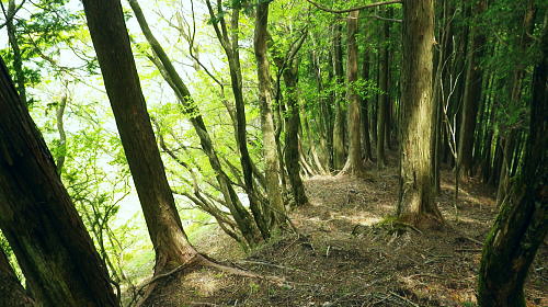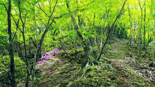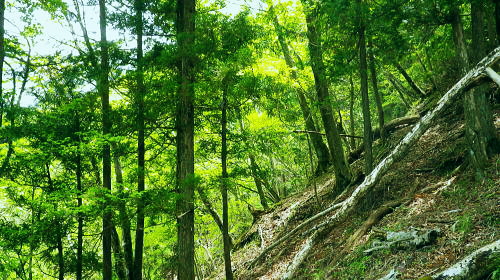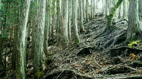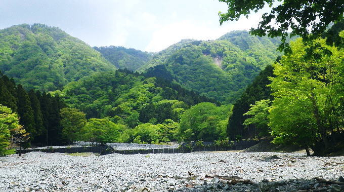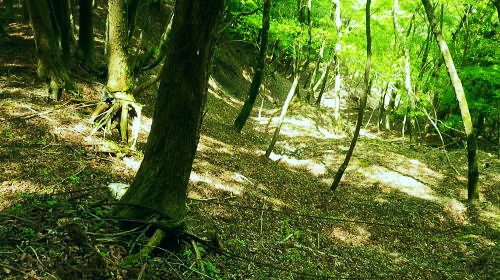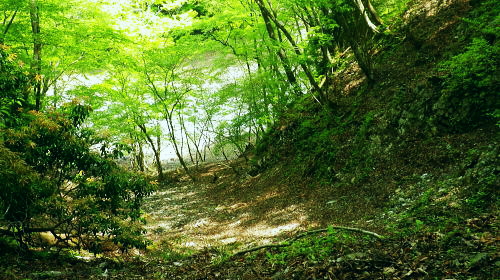 | 玄倉川上流左岸流域の尾根と谷・・小丸北尾根 四十八瀬川二俣から鍋割山稜を越え.小丸北尾根を下り.玄倉川上流の鍋割沢の広大な河原.尊仏ノ土平を周回 大倉から西山林道を抜け丸萱尾根から鍋割山稜 小丸北尾根からの玄倉川の源流へ下り尊仏ノ土平・・最奥にある広い河原 鍋割山北尾根を越え栗ノ木洞南西尾根から寄大橋 玄倉川箒杉沢出合付近の鍋割山稜の北尾根群 竜ノ馬場と丹沢山の鞍部.アザミ平からの遠望後山乗越から甲相尾根へ縦走の折.箒杉沢が突き上げる出合には鍋割山稜の北尾根群が朧に見え隠れしていた。 その山稜のブナの森で当時.昼食を摂っている。・・2008.10.30/14:30 谷間下流正面は玄倉川の尊仏土ノ平付近に没している。左岸沿いには玄倉集落からの玄倉林道が綴られているが今だ荒廃が甚だしく. 人も車両も今だ通行止になっている。河原の突き当りの終わり.左岸奥から落ちているのが塔ヶ岳西尾根。 小丸北尾根 小丸北尾根は鍋割山稜の小丸から北北西に延び.高木の檜林に広く覆われる支尾根で玄倉川源流の鍋割沢左岸枝沢と中鍋沢を隔てている。 下調べ以上に薄暗い植林に覆われていた。尾根末端では幾らか明るるみが現れたものの.尾根筋は深い林相に被われ殆ど眺望はない。 鍋割沢側の一部分だけしか望めず.河原に降ると急に明るく開かれた感じを持っている。 又楽なルートだった。ポイントは2ケ所だが明瞭に分かり.間違えれば危険だが直ぐ分かる地形になっていた。 赤ペンキやテープ類のマーキングはやや多く.予想を遥かに超えた早さで.鍋割沢左岸沿いの河原に下りている。 鍋割山稜の小丸北尾根 尾根筋の鹿柵を潜る取付き地点.10:42小丸の手前.西側の鹿柵脇より北尾根に入る 小丸北尾根 10:35鍋割山稜一10:42小丸北尾根取付き一11:05(1070m)左枝尾根一11:29西に延びる尾根分岐一11:36残置ロープ 一11:42尾根末端一11:44中鍋沢出合一11:54尊仏ノ土平.大 北尾根を下る.10:49左側が中鍋沢.右側が鍋割沢の枝沢になる。予想していたより大らかで下枝もない林床で高木の樹林帯寄りに踏み跡が続いている。 陽を閉ざす薄暗い檜の植林帯.10:52 林相の境になる鍋割沢側の斜面.10:55 大らかな尾根の迷い易いポイント.11:08この尾根のポイントは1170m地点で北北西へ.1120m地点では左の支尾根に乗る。 尾根後半は一時.自然林を抜けた.11:16不動ノ峰南尾根と塔ケ岳西尾根 右手鹿柵越しの鍋割沢.11:20この南尾根の樹部には「不動の清水」があり.甲相尾根に縦走した折.翌日の飲水を求め,過ってK先輩と訪れたことがある。 塔ケ岳西尾根に乗る1234m圏コブ 右奥が塔ケ岳.11:20 鍋割沢左岸のガレ場かより.11:27この枝沢は左岸で一番大きな枝沢で本流.鍋割堰堤の直ぐ上が出合になる 尾根末端近くの木材運搬用の残置ロープ.11:36尾根末端は最悪の壁で鍋割川の河原に落ちていた。西側のルンゼより尾根に接続し.下れば250mほどで河原に降りられた。 途中に残置鋼製ロープがあり.尾根を横にに張ったまま横切り残されていた。前方を見ていれば転ぶことはないと思うが跨ぐので要注意。 踏み跡は確り踏み固められていた。下枝の絡みに.下藪はなく.思いのほか歩き易い。 尾根末端は中鍋沢出合少し上 下降地点・・右手が直ぐ出合850mになる.11:42尾根末端から中鍋沢側に降りている 中鍋沢出合 ゴーロ状の河原出合.11:47中鍋沢と小鍋沢との中間尾根 出合から望む中鍋沢.11:44二俣右俣が小鍋沢になる。 玄黒川の河原を見下ろす 河原のゴーロ帯を歩む.11:50中鍋沢出合から玄黒川の河原下流を望む。ここから望む左正面が鍋割山北尾根で.向かい合わせの右の尾根末端が塔ケ岳西尾根になる。 玄黒川左岸.越場沢第二堰堤と第一堰堤の中程手前.写真の中間の茂みの境が待望の尊仏ノ土平。 塔ケ岳へは鍋割沢を渡れば塔ケ岳歩道(西尾根)を辿りことになる。この「付近を尊仏ノ土平」と呼ばれ.「尊徳仏」とは塔ケ岳を指し. 「塔ケ岳の登り口にある平坦地」という意味を持っている。又ここまでのアプローチは玄倉川の最奥の箒杉沢出合にも位置し. 長く時間を要する玄倉林道起点からは小丸北尾根か.塔ケ岳西尾根が日帰りルートになる。 蛭ケ岳 尊徳仏の河原から下流側を望む左手は鍋割山北尾根末端の山ノ神. デン平942m峰.その左方のコルは昼食後に登った鞍部。 下の緑の濃い方が針葉樹で.若草色が自然林.その境の涸沢を詰めてみた。 中央右が棚沢ノ頭南東尾根.その手前に箒杉沢出合があり.玄倉林道を下れば右に箒杉沢出合を過ぎて. 山ノ神を左へ回り込めばオガラ沢出合にでて箒杉沢出からユーシンへ。オガラ沢出合から遡れば源は鍋割山。 出合直ぐ左のルンゼに入れば鍋割山北尾根に取り付き.鍋割山西に山稜乗る。 玄倉林道沿いに更に下り右手に熊木ダムを見ると手彫取りとりのトンネルがある。ここも北尾根谷ルートの尾根末端になる。 更に林道を下ればユーシンにでて.その先で古道寄ユーシン線と合わさっている。入れば雨山峠越で寄沢を下り宇津茂.寄バス停に至る。 又玄倉林道を起点まで下れば丹沢湖々畔にでて玄倉バス停へ。 