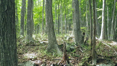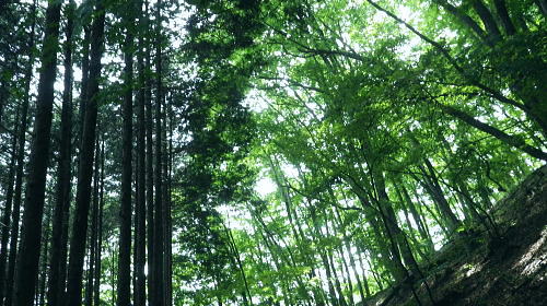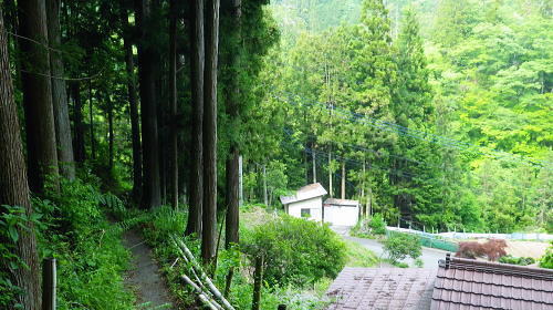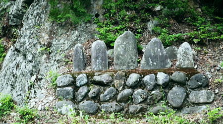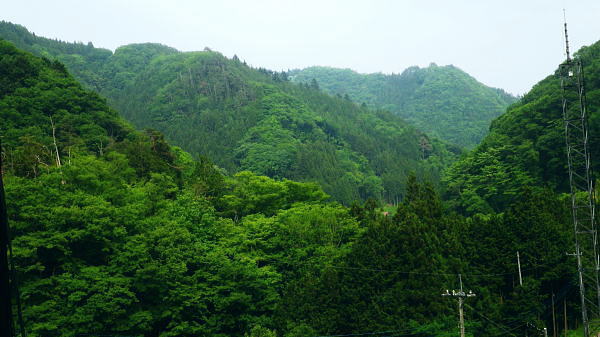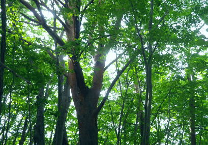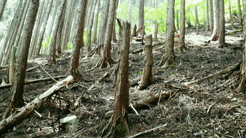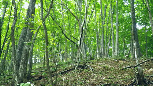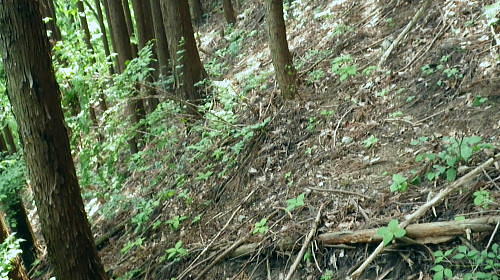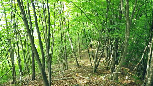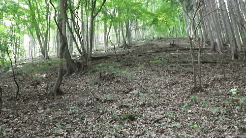 | 猛暑の藪ルート.汗滴る藪山 尾名手川左岸道を諦め尾名手尾根1098mコブに逃れ.尾根筋を阿寺沢へ下る。阿寺沢入口バス停と県道擁壁新設工事現場 初戸bs.腰掛林道から藪ルートの左岸の尾名手峠道へ 尾名手尾根.1098m圏コブ南尾根から平野田へ中退.少し高みを探り迷う。・・阿寺沢入口bsに回り込む。完了した阿寺沢バス停前の擁壁工事V 13:26尾名手尾根1098mコブ南尾根から阿寺沢 12:37竹林一13:26綺麗に手入れされた植林帯一13:34下草生える植林帯一13:50自然林帯一14:15(1098m圏コブ):41.大 一15:12尾根分岐一15:29腰掛林道一15:31阿寺沢橋一15:48阿寺沢入口bs. 竹林を抜けると踏み跡は怪しくなり.灌木や藪を潜るようなる。やや登り気味に先を探って.先が分からなくなる。 ここだけは水平に先を見定めるよう気を配った方がよかったようだ。 尾名手尾根1098mコブ南尾根 884m・・13:26 915m・・13:34中退 探索をするうち高度を上げ過ぎていた。時間を使い過ぎ.更に時期的な急な暑さに体が追い付かずバテ始めている。 今回は峠越えは2次的なもので.青葉を求め.地形図で想像した廃屋と比べることを主に考え入山していた。 再び峠道を探し河原に向かい下るか? それとも明るいうちに下るか? 阿寺沢に下ると最終バスは4時28分発になる。 汗を吸収するタオルは汗を掻き続けているにも拘らず.乾きゴワゴワになりだしていた。それほど暑さは強く気は参りだしている。 焦燥したような雰囲気でもないが更に探る意欲を失い.暑さも加わり諦めだしていた。 又来た径を戻るのは詰らないと尾名手尾根にルートを取った。 南尾根を200mほど詰めれば尾名手尾根1098mコブにでる。中半山腹は植林帯.それほど時間は掛からぬだろう。 尾名手尾根1098mコブ南尾根 諦めた地点,.3:40 尾名手尾根の右山腹は植林帯に 左側は林層の境1098mコフ南尾根を詰め北上する。 植林帯から素直に殆ど同じ傾斜で延びる南尾根。低地は倒木混ざりの植林帯。やや傾斜が増し地表は雑草にと小枝混じりの根土になる。 登りだして直ぐ植林が切れ.自然林に変わっている。大きな障害物もなくなり.落葉に枯れた大枝.小石混ざりで.踏み跡はないが歩き易い。 周りを臨むと程なく左手は林層の境を迎え.自然林に。右手は更に檜林が密生し重なり合い.整然と高木林が天高く伸びている。 その間の斜面を一歩.一歩踏み締めて高度を稼いで行く。 喬木帯974m.13:501098mコブ手前の尾根筋 灌木帯1059m.14:07蜘蛛 途中で70pほどの大きさの蛇が足元を横切る。種類は分からぬが前回丹沢で見たのと同類で.比べればやや小さく思えた。 そう云えば今年は蜘蛛の巣に掛かる機会が少ない。前半は誰も歩まぬ藪の作業道をトラバースしてきたが.そこでも何度かだけだった。 蜘蛛の仲間には夜間だけ網を張るものがいるそうだ。夕方に網を張り.明け方には片付けてしまう。 この時網を張る手順のほぼ逆の手順で.規則正しく蜘蛛は網を片付けている。その種の蜘蛛ばかりいるとは思えぬが。 何か条件があるのだろう? 蜘蛛の巣が群がる尾根をよく歩んでいる。その場を抜けるのが大変だった。 それに比べ今回のルートは余りにもすっきりし過ぎている。 灌木帯の中を歩み傾斜が落ちだすと尾根のツメが見上げられ.更に樹間を通し蒼空を覗むようなる」。 右奥には更にコブの頭らしき起伏の頂点があるようだ。傾斜が落ち付くと.びっしり詰まる落葉松帯に囲まれた。 距離は短いが抜けるとブナが現れ.尾名手尾根に乗る。 右奥がやや高みの1098mコブにでた。溢れる陽光が若葉の樹葉を透し.若草色に輝く淡色のカーテンに引き占められる。 尾名手尾根1098mコブ 14:15大休止1098m.14:41広い大地のコブに立ち.改めてゆっくり昼食を摂る。 蜘蛛に変わり頂では蠅が多い。蠅が何匹もまとわり付き煩かった。手で払っても.その手前から回り込まれまとわり付く。 蠅除けに煙草を吸うと蠅の群は遠ざかる。それを見て落葉を払いのけ.煙草を風上に立て.紫煙が流れ込むようにした。 群は私の周りから少し離れ.如何にか食にあり付けた。ただ残る1匹の小さな蠅が煩く.払っては戻ることを繰り返す。 尾名手尾根を下る 坦々下る.14:43下山は思いの外早かった。先が読め,腕を大振りして自然の歩みに任せている。前回は権現山稜から走り下っている。 最終バスと時間を競っていた。乗れなければ大変なことになる。ただどうしようもない状態になると意が通じるのか走れるものである。 バス停手前の鶴川の登り200mほどが一番苦しかった。 15:00赤松.落葉松.ブナの巨樹 尾根末端上750mの分岐 阿寺沢と腰掛との分岐.15:12尾根上の分岐.右前方の小尾根の取付きには赤字の×の印がある。下れば入山時.別れた尾名手沢左岸の踏み跡と合流し腰掛の集落に戻る。 左(北)側に入る尾根の取付きには2本の小木立に赤.ピンクに黄色のテープが幹に幾つも巻かれ.目立つマーキングだった。 そこを下ればテレビアンテナを見て.平野田の畑を抜け.阿寺沢の集落に下りている。 平野田休暇村.15:28右下は腰掛林道 平野田への尾根末端で直進せず右寄りに下りてみた。