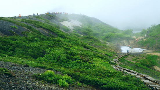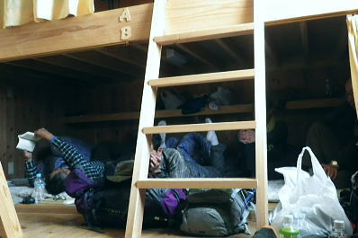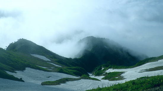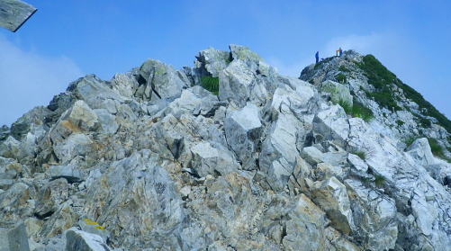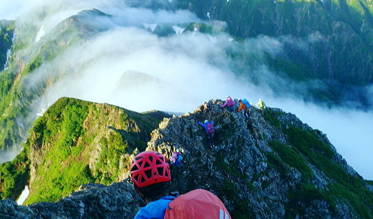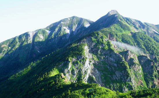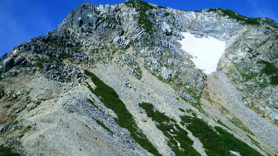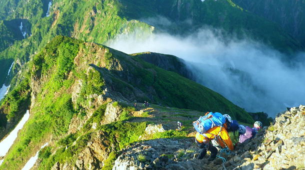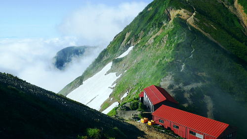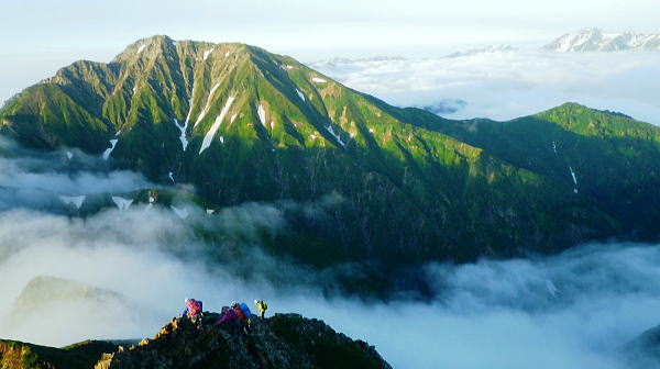 | 回想の後立山連峰. 唐松岳から五龍岳.鹿島槍ケ岳.爺ケ岳・・後立山連峰Top ・・後立山連峰概略図 後立山連峰の唐松岳から爺ケ岳へ南下・・初日は本降りの八方尾根に泣かせられ.翌日は後立の雲海満歩を満喫する。 込み合った八峰キレットと爺ケ岳の小屋.最後も満杯の山小屋.慌ただしさを避け.柏原新道から一日早く下山する. 2014年07月26〜29日.松村 風雨に荒れた白馬八方尾根・・沈痛と危険な職業ガイド 好天に恵まれ五龍岳から八峰キレット 快晴の鹿島槍だが爺ケ岳を越えて下山 今年の夏山は体力的に同期鈴木が抜け.見城先輩の希望を含め.7月下旬に後立連峰.五龍岳を中心とした山を選んでいる。 吾妻に続き彼女も参加したいとの希望を受け.遠見尾根から五龍岳を南下し.鹿島ケ岳.爺ケ岳の山稜を綴り.柏原新道を下る積りで企画した。 それが何と! 先輩のトレーニング不足を理由に急に中止。折角企画した山行を無駄にしたくなく単独で歩む。 コースは八方尾根から入り.唐松岳から南下するコースに延長し.下山は未定とした。背稜は過って1968年9月下旬に白馬雪渓から針ノ木雪渓まで 縦走している。当時を想い.北アを北上せず.昔のコースをそのまま南下する。どれほど昔を想いだせるかがポイントになった。 過って縦走したのは後立の雪山に備え.直接足で地形を呑み込むのが目的の山行だった。そして正月山行として餓鬼ケ岳に続き.爺ケ岳東尾根に. 南尾根.岩小屋尾根に鳴沢尾根と年毎に挑んでいる。卒業後の正月毎の山行だった。今回はそのルートを足元から覗き込む積りでいる。 小屋泊りになるが混雑せぬことだけを願い.山に入る。 出発はK先輩の不参加から天候を見定めて入山。7/16日九州地方が梅雨明けし.20日には中国.四国地方.21日は東海と。 そして22日甲信越が梅雨明けをした。更に台風10号が23日沖縄に接近.そのまま北上するか.本土に向かうか20日までは知することはできなかった。 その後台湾を直撃すると米軍の進路予想がでたため.7月26日に入山を決め後立に入る。アプローチとしては夜行列車は完売.夜行バスに乗り換えていた。 五龍岳〜唐松岳八方尾根 栂池展望台より・・2015.05.14/9:14長野中条の新津邸で「終の棲家の古民家で囲炉裏を囲む会」を催した翌日.新津邸→奥裾花自然園から大町温泉郷「織花」へ。 その折途中の栂池展望台からの遠望. 爺ケ岳〜鹿島鑓ケ岳 右手が鹿島鑓北峰.南峰3日目解散後は独り高瀬川左岸道を常念山脈を仰ぎながら歩み.大糸線の安雲追分駅にでている。 7月26日(土).晴 隅田川花火大会.秋葉原ロータリー21:55=竹橋毎日新聞社.毎日アルペン.¥6200. 22:25= 7月27日.雨.稜線にでて風雨強くなる =5:44白馬八方一6:00八方尾根ゴンドラ兎平=リフト×黒菱平.八方池山荘7:17一第3ケルン.八方池:32一8:55小9:00 一9:50雪渓末端10:00一10:20唐松岳頂上山荘(旧唐松小屋). 第3ケルン八方池 7:14池塘には残雪.大池は融雪するもガスが強く舞い、逆白馬の姿は見えず 八方尾根 八方山荘にはスキー等で何度か訪れているが八方尾根からの入山は初めてのこと。 12年前,妻と福光で昔の家系を探った旅の帰路.白馬岳の夕日.朝日を妻に体験させるため.八方山荘に宿っている。 又大分昔だが黒菱平からjr白馬駅前までスキーで滑った経験のある。当時の駅名は旧「国鉄信濃四谷駅」だった。 八方ゴンドラも何度か改良.新台に変わっている筈。そのゴンドラには小さな空気口が天井に備えられていた。 その穴から雨粒が1つ.2つ頭上に落ちる。麓では薄曇りだったが.兎平に着く頃には小雨になり.上のリフトではカッパを着る始末。 乗場脇に置かれたテレビ雨雲レーダーは雨の到来を告げ.前線が幾つも並ぶのが映し出されていた。 天候ばかり気にしていたのが仇となる。前日は日本各地で猛暑日を記録していた。富山38.8℃. それが大陸高気圧が張り出し.前線の南下が梅雨明け後のゲリラ豪雨に見舞われる。歩き始めて久し振り.雨らしい雨に打たれていた。 山麓からの標高差1060mを30分ほどで詰め.歩き始めに上下雨具を着て傘を差す姿は久し振りだった。 夏シーズンに入り八方尾根と遠見尾根を周回するハイカーは多い。又昨日.今日は信濃大町若一王子神社の例大祭が行われる。 奥社は蓮華岳にある。祭日でゴンドラは早朝運転6時.普段7時.¥1550. 荷物代15kgから¥440.私の荷は13kgに留まる。 上樺付近.8:18標高1830mまではゴンドラ.リフトと便乗した。降雨に見舞われた雨雲のガスが尾根にどっぷり覆っている。八方尾根に登っている実感が 起きたのは八方池のみだった。ただ水面に映る白馬三山を眺めることも見ることもなかった。雨雲の中を歩んでいる。 登るにつれガスは深まり.飛び散る雨粒は額を叩き.風もでてきて痛い。眺望を得るどころではなかった。 下樺から灌木帯を登り.上樺の扇の雪渓末端で1本取っている。停まると見る見る体温は奪われ.手はかじかみだしていた。 コース的には楽なのだが丸山のケルンに鎖場を抜けて.足元を見詰めているだけの登りが続く。 避けることのできぬ頂稜は勢いに乗る暴風雨で