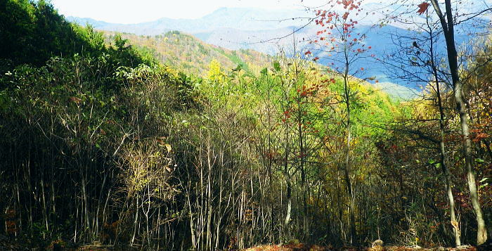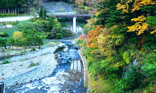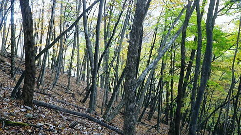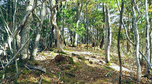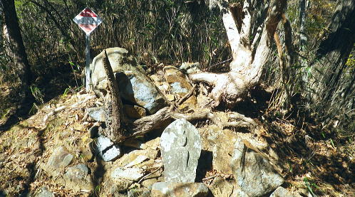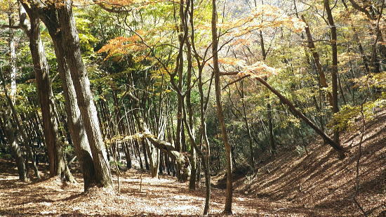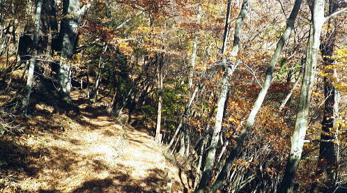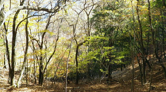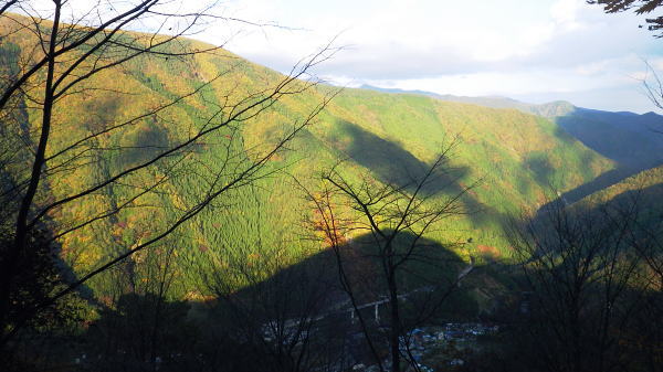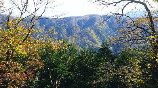 | 暮秋に彩られた華麗なる水源林巡視路から更に北面の寂びの利く作業道を経て北側の丹波の里へと降りる。 ノーメダワから丹波大菩薩道・追分を経て.サカリ山大指尾根の末端.高尾天平へ・・丹波山温泉「のめこい湯」 中黒茂沢から小菅川左岸中腹道ノーメダワ 丹波大菩薩道からサカリ山大指尾根と藤ダワ.越ザワ・・思い深まるノーメダワに立ち.「のめこい湯」へ 丹波大菩薩道 ノーメダワ側を振り返る.12:5311:56ノーメダワ.大12:45一13:11石仏一13:30追分:40 丹波大菩薩道 丹波大菩薩道は古くは甲州と武州を結ぶ街道で.今は水源巡視路として.又登山道として活用されている。 私の歩んだルートとしてはまだ荷渡し場からノーメダワの間が途切れている。今回も変わらず.戻り気味にノーメダワから前回の逆尾根を歩む。 赤沢ブドウ沢源流 丹波大菩薩道.12:55牛ノ寝通り北側の山腹 南方に並行する牛ノ寝通り.13:00ノーメダワから歩んで10分ほどの距離.倒木が大きく径を塞いでいた。倒れた枝絡みを巻いて.元に戻っている。右手に垣間見る 牛ノ寝通りが小菅川を隔て対峙し並行して望まれた。大ダワ.ショナメ.狩場山.1352mコブの頂稜が連なり.右奥が米代長峰になろう。 右後方に下る.13:09丹波大菩薩道からE地点へ下る分岐 路肩の改修工事.13:08道肩の改修工事. 道脇には丸太が何本も積み重ねられ道を塞ぎ.測量棒にハンマー.ツルハシ.バール等小道具が纏まり備えられていた。 その100mほど先には超小型の運搬機が置かれている。モノレールで運ばれたものだろう。丹波大菩薩道はそれだけ幅広く. 馬の通う古道だったことが伺える。 花ノ木沢からの分岐.13:11C.D地点へ下る白糸沢左岸尾根沿いの下り口 石仏と林班界標柱.13:11奥に林斑界標「小菅分区3|2」が立つ 白糸尾根沿いの分岐.13:12上の分岐と同じルートになる 白糸沢源流.13:31追分 巻道から尾根沿いに戻ると追分にでる。小菅川上流の左岸域や追分付近は山道が縦横の走り.枯葉の舞い落ちるのがこの時期。 足に優しい落葉道を歩む。追分には林斑界標丹波区分「52|小菅2」があり.その前の道標には「大菩薩峠」.「山道」.「丹波」.「小菅村」とある。 標柱には丹波村十文字とあった。「大菩薩峠」は今通ってきたノーメダワへの径. 奥へ綴る山道はここから下る水源巡視路. 泉水谷出合にでている。 「丹波」へは山葵谷を下り藤ダワにでて.更に丹波に続く丹波大菩薩道に導かれる。 「小菅村」へは村界尾根になる。前回は川久保から中指山に立ち.ここ追分を経て.小室川へ下っている。 又境界尾根に入ると直ぐ下流の中腹道が合わさり. 朝方のA.B地点からのコースと結ばれ.下れば小菅林道にでる。 この周辺の山腹は作業道が網に目のように多く縦横に綴られていた。更に先へと延びる境界尾根の東方は 中指山から大丹波峠を経て.林道化して鹿倉山.大寺山へ至り.末端は奥多摩湖の西端に没している。 遥か雲取山石尾根 北東を望む.13:31三ッ山,雲取山.七ッ石山.千本ツツジ.高丸山.雲に霞む日陰名栗山.頭を隠す鷹ノ巣山.水根山.離れて六ッ石山 サカリ山大指尾根 13:30追分:40一14:05大指尾根鞍部林斑界標「52|53」一2つの1370m圏コブ一14:39(1246m圏コブ) 一15:25藤ダワ:30一高尾天平一16:06越ザワ一16:20丹波山「のめこい湯」 南面からのサカリ山大指尾根 追分十文字より.13:351370m圏コブ.1350m圏コブ.離れて1300m圏コブ. 手前がマリコ川山葵沢. サカリ山は幾つもの呼び名を持つ山. 小菅川の今倉沢の頭でもあることから今倉山。マリコ川の山蓌谷につめであるため山蓌谷山。 北面からのサカリ山大指尾根 大菩薩嶺北尾根を下り丹波の集落で振り返る.2015.10.18/14:20翌年の晩秋に中沢の桟道に再び訪れるも,崩壊した間々で下れず。再び大菩薩嶺北尾根に戻り.大丹波川・甲州街道へ下っている。 その時は丹波の街道の北面からカカリ山大指尾根を見上げていた。高尾天平と芦沢山に挟まれた貝沢川からの撮影 ・・1246m峰.1300m圏コブ.1350m圏コブ.サカリ山1510m 追分で3本目の休みを取る。トマトに塩粒を掛けほうばると肉汁が溢れ美味かった。日差しは見た目より弱く寒い。 薄日も隠れ勝ちになり.既に高い台地でも陰り始める気配が見えていた。道標「山道」へルートを取る。 山陰の山葵谷源流を回り込む.13:47 2つ目の小尾根を越え.13:50葉が落ち残り少なくなった紅葉 3本目の小尾根を乗り越え.14:00追分から綴る巻き道は山陰に入り.薄日も遠のき黄昏だす。以外に長い距離.時折小石片が混ざり. 被さる落葉に足を取られ勝ちになるが楽なコース。カリ山の東側を巻く径は山葵谷に落ちる小尾根を綴る水源巡視路の径。 山葵谷の源流は既に冬木に覆われ見通しはよかった。 サカリ山大指尾根取付き ![]() 肩で丹波山分区の林班界標柱.14:05 1370m圏コブ.14:13 サカリ山1541.7mの山名は小室川のサカイ沢の頭なのでサカリ山と呼ばれ,南側の今倉沢のツメにあたることから今倉山とも呼ばれている。 又山葵谷から山葵谷山とも呼ばれていた。地形図「丹波」ではサカリ山と表示されている。貝沢側とマリコ川を隔て. サカリ山の北側の小