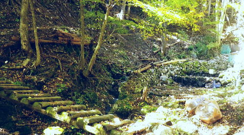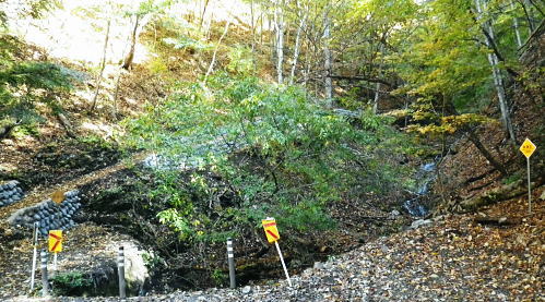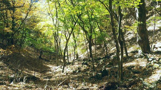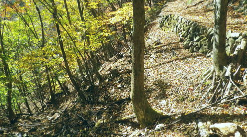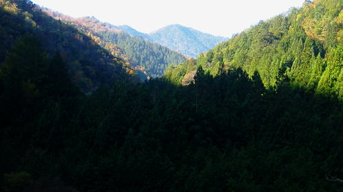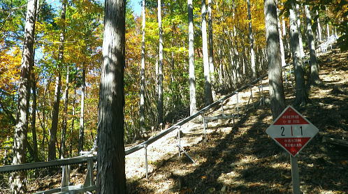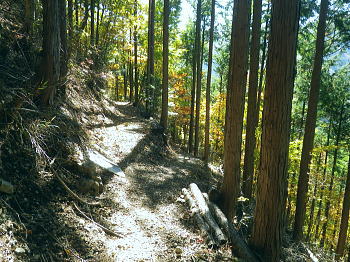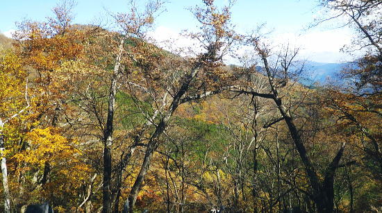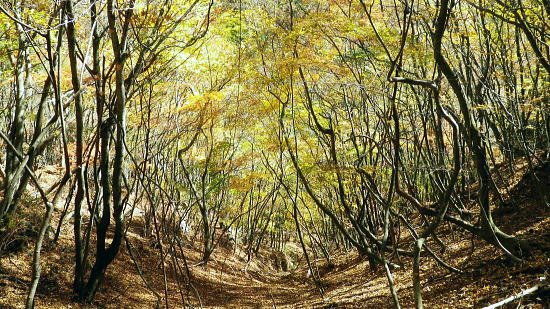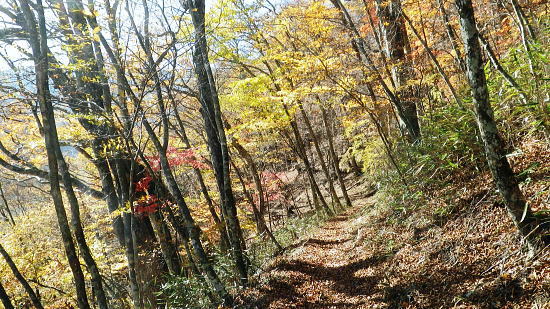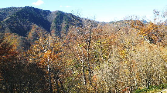 | まだ紅.黄葉が満っる丹波川の小菅川の分水嶺のノーメダワとサカリ山 ・・多摩川小菅川流域Top 晩秋の丹波大菩薩道南側の山腹道に延びる小菅川左岸と北面の作業道を綴る 橋立上バス停から小管川左岸中腹道を経てノーメダワ―丹波大菩薩道.追分からサカリ山大指尾根を絡め丹波山「のめこい湯」へ 2014年11月03日.松村 中黒茂沢の小菅川左岸中腹道からノーメダワ・・バス路線の開通と改正 丹波大菩薩道からサカリ山大指尾根 過って左足首を痛めたこともあり.夏以降の単独行は控えめにしていたものの.動かなければ体がうずき.昨年の同じ時期に合わせるよう小管川周辺と 三窪高原に絞り入山する。10月に入り小管川流域に入渓する積りでいたが小菅線バス時刻表改正により.足踏み状態になっていた。 初めて入る山域でもあり.それに伴う村営バスの改正もあり.初めての入山でアプローチがやや不安だったが.それらを踏まえて出向く。 小管川の右岸から左岸の山腹道を周回する方がよいか? 山越えをして丹波に抜ける方かよいか考える。 山あっての渓と暮秋に彩られた山腹道を縫い丹波へ。小菅川左岸中腹道から晩秋の残り少ない紅葉.落葉を求め.ノーメダワから丹波大菩薩道にでて. 少し戻る形を取り.カサリ山大指尾根に乗り.丹波の里に降りることにした。出だしは奥多摩駅から金風呂で乗換え.小菅村営の橋立上バス停にでることから始まる。 村界尾根(丹波山村・小菅村) 小菅役場前より.8:31聳える山稜は小室川右岸側からのサカリ山から始まる1500m圏コブに1327m峰と1330m圏コブ.中指山. 峠越えのウズモ山1066m。この山稜は東方の尾根末端へ綴ると鹿倉山・大寺山を経て.末端は東側の奥多摩湖に没している。 奥多摩駅から路線バスは奥多摩湖北岸沿いの青梅街道を分け.小菅川左岸の旧街道に入り.小菅地区を抜けている。 そして旧小菅バス停.1つ先の小菅村営バスの橋立上バス停で降りている。 途中の小菅の十字路を左折すれば南側の上野原丹波山線・国道139号線に入るようなった。今は松姫峠から大月に抜けるコースと 鶴峠から上野原にでるコースが選ばれるようなった。又この交差点は小菅村唯一の信号がある。 11月03日晴寒し jr御徒町4:44=4:50東京.中央線始発:58=5:55立川6:04=6:34青梅:35=7:15奥多摩.西東京バス:25 =8:07金風呂bs.小菅村営バス=8:30橋立上bs. jr東京駅 神田駅を乗り過ぎ.初めて東京駅発始発の中央線に乗車した。赤レンガの東京駅は駅舎復元大改修を終え.今年12月で100周年を迎える。 既に横須賀線と総武線快速線の直通運転が運行され.来年3月には北陸新幹線も開業される。現在の御徒町駅ではホーム東よりの留置線を利用し 宇都宮線・高崎線・常磐線の快速が東京駅に乗り入れることになり.その為の工事が行われていた。 更にオリンピックの東京開催の決定は成田.羽田空港から私鉄の相乗りや東京モノレールの延伸.つばくろエクスフレスの当駅乗り入れ等の構想かあり. 中央駅として「0キロポスト」の路線は更に増えるのだろう。東京駅はこれから先も巨大駅とし更に進化の一途を辿ってゆく。 この処夜明けが大分遅くなり.国分寺辺りで白みだし.立川付近で夜明けを迎えている。青梅線は寒さが強まり列車の開閉は 手動に変わる季節になっている。車窓に陽光が射し込むも,天空は覆う雲の方がまだ多い。山並だけではなく. 天空には低い層雲が切れ出すも.高みには幾つも高雲が筋をなしている。予報では快晴を謳っているが頭上はまだ雲の中だった。 西東京バス 奥多摩駅発「小菅の湯」行路線バスは10人ほどが立つ乗車.奥多摩湖を過ぎると立つ人もいなくなる。 10月01日からバス路線は新バス停の新設と時刻の改正が行われた。 始発の路線バスは直接旧青梅街道から小菅にまで入らず.深山橋から青梅街道小留浦まで往復するようなる。 新設田元から小菅役場前まで往復した後し.「小菅の湯」が終点に変更されている。 又バス停の「小菅」は「大菩薩峠東口」と改名され.大菩薩峠東口までは2番車以降が往復線として運行されるようなった。 朝焼けの小管川流域 妙見ノ頭と大菩薩嶺.8:37小菅川右岸側が牛寝通り.左岸側が丹波大菩薩道の通る市界尾根. 橋立集落より 小菅村営バス 昨年の暮れは金風呂まで初めて村営バスを利用したので.その接続を利用してみる。乗車は私一人. 運転手によると時間的には役場前から歩いた方が早いかも? 金風呂=田元間を村営バスは大きく南側を回り込むルートを取っている。 金風呂から白沢沿いに遡り.上野原丹波山線(県道18号)で先程の西東京バスと擦れ違い.「小菅の湯」にでている。 この間15分.大回りして戻る形を取っていた。乗って初めて分かったこと。 田元集落から役場前.川久保.橋立下を通り.終点橋立上まで金風呂から正味23分で着いている。ちょっと絡んだルートだが 村営は¥100均一で.運賃は¥170安く.その上.「大菩薩峠東口」より1つ奥のバス停「橋立上」が終点になっていた。 松姫バイバス 運転手によると今月17日には待望の路線バスが国道136号線で松姫バイパスを潜