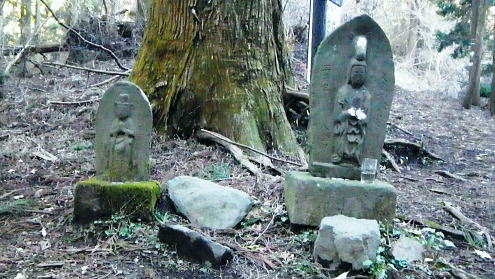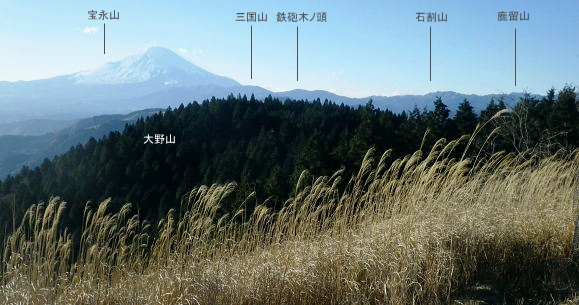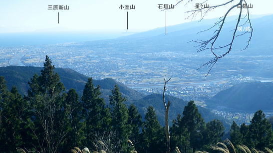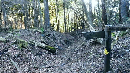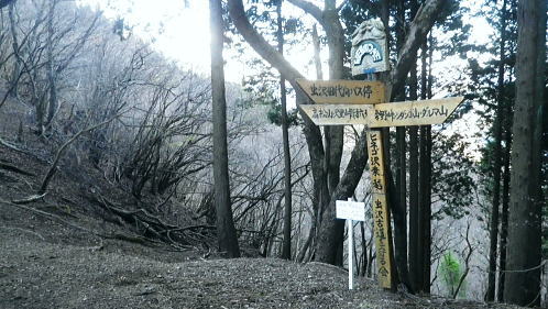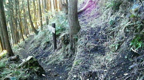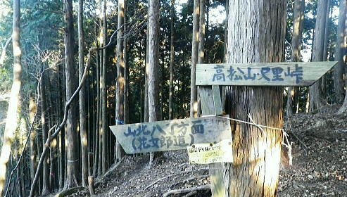 | 滝川流域の送電線田代幹線の旧巡視路から分かれ.南斜面を下る 西ノ尾.高松山南西尾根―田代幹線356号鉄塔の旧巡視路から南西尾根を分け.滝沢林道・・藪の旧ルートの北枝尾根を探索 日没を迎えた滝川林道から滝集落に尺里・堂山を経て闇ふけるjr御殿場線山北駅 玄倉から日影山北西尾根を詰め゙プッシュ峠・886m点コブから幡野峠分岐 林道秦野峠から高松山北尾根に立ち.新秦野線29号鉄塔から西ノ尾 ヒゴネ沢乗越から高松山南西尾根からビリ堂.南西の経路から田代幹線357号鉄塔.旧巡視路を抜け滝沢林道へ・・jr山北駅 ヒネゴノ乗越から高松山を越えて南尾根のビリ堂下から南西尾根に入り.直接山北駅に降りず.滝沢の源頭手前で引き返している。 送電線田代幹線356号鉄塔の旧巡視路を選び.谷沿いの右側に回り込みながら尾根状を南下.複雑に蛇行を見せる滝沢林道に降りることにした。 旧巡視路の起点を過ぎ林道終点前で日没を迎え.夜道を探りながら林道から里道.街道を歩む。 ヒゴネ沢乗越 花女郎道の中間峠(八町峠).14:07ヒゴネ沢乗越から高松山南東尾根を経て旧巡視路の藪を漕ぎ.滝川林道を下る。 13:59西ノ尾一14:25ビリ堂分岐:40⇔高松山. 一15:07ビリ堂一15:25分里バス停分岐一15:39車道にでる 一16:06田代幹線巡視路分岐一16:38滝川林道一16:50滝集落.尺里一17:00県道一17:25jr御殿場線山北駅. 乗越 ヒゴネ沢乗越には古来から古道としての「花女郎道」が跨っていた。県道725号.玄倉山北線.八丁から尾根を詰めヒゴネ沢乗越にでて. 下りはヒネゴ沢沿いに虫沢・宮地にでて中津川対岸の田代向バス停に至る「花女郎道」。 その後登山道として.昭和30年代から登山ブームに乗り.今は改めて衰退の兆しをみせていた。 ヒゴネ沢乗越には四方に方向を示す立派な道票が立てられ.これから向かう「←高松山,尺里峠(第六天)」に「↓虫沢田代向バス停」。 歩んできた方向には「今野峠.シダンゴ山.ダルマ山→」。道標の裏側へは「↑はなじょどう道.八丁」とあり.又標柱には「ヒゴネ沢乗越.虫沢古道を守る会」とある。 頭には対の兎とその下にWEICOMと木彫りがあり.又峠の虫沢側には2羽の兎にリスが乗る。 その上には鳥が道標と同様に木彫りのオブジェがあった。白板には「標高720m.←高松山801.4m.西ノ尾805.1m→」とあった。 又峠中央には古い熊の糞を2盛り見付けている。 花女郎道の東側は虫沢ダルマ沢ヒネゴ沢沿いに虫沢,宮地.寄へと下るコース。 又西コースは尾根沿いに八丁にでて県道725号(玄倉山北線)から人遠.皆瀬川沿いにjr山北駅にでられる。 県道沿いの八丁.人遠の地名は「足柄乃文化」31号には「沢を上流に詰めて行き止まりになる所をハッチと呼ぶことがあり。 「新潟,秋田,岩手などでは山の稜線から分岐する支脈と支脈との間に生じた山中の窪地をヒド(肥土.比土など)と呼び. 人遠もそれが転訛したものと思われる。」との説明がある。 近年は「虫沢古道を守る会」がこの古道に手を加え.昭和21年から間伐材を利用し.花女郎道として復活する。 ヒネゴノ頭 シダンゴ分岐.14;17高松山西峰.ここから必そり陰る茂みの中を綴る。直接「花女郎道」へ下る道があり.又高松山西尾根の取付き地点でもある。 道標に従い密つる樹林をコの字に左へ回り込むと.鹿棚沿いの薄暗い植林帯に高松山とビリ堂とを分ける分岐があった。 その奥に聳えるのが高松山. その暗闇の反動か? 空身になり高松山をピストンすれば想像を超えた広大な明るい台地の草原が現れる。 高松山 広大な草原と展望の頂.14:34高松山(山北).二等三角点標石801.4m.基準点は「皆瀬川村」. 人影のいない.極寒の旋風が巻き上がる頂とその展望幾つもの球場が取れそうな草原にベンチが点々とあるが,座るのは私ただ独り。足元から又テーブルを這うよう隙間を見付けるよう 冷風が吹き付けている。今回の山行の欠点と云えば風にある。風の息があれば日向ぼっこに都合のよい所だった。昼寝に炊事もできる。 ただ写真で見る限り長閑に見える風景も異にしている。頬を刺す鋭い冷風に襲われ.ジッと我慢するも後が続かず。留まれば震えが起きている。 如何に寒波が強くとも.風さえ弱く抑えられればこの時期.陽の恵みを受けられる筈だった。何処に居ても諦めざるえなく.空腹感はない。 南面に裾野が広がり.別天地のような頂台地を造っている。展望も楽しめる筈が長居は出来ず.名残り欲しいく後にしている。 草原を横切った反対側.右端には尺里峠へ下る登山道と道標があり.尺里峠.第六天から尺里へ.又は最明寺史跡公園を経て小田急松田駅にでられる。 「松田駅」の道標は魅力ある言葉で誘われるが.今日は御殿場線の山北駅に直接でる予定がある。 高松山西南の展望 酒匂川の扇状河口駿河平野 御殿場方面から鮎沢川が流れ.西丹沢から流れる河内川が山北谷峨で合流し酒匂川となり.jr御殿場線沿いを下り.駿河灘に抜けている。 河口には広大な駿河平野を創り.関東四大平野の1つとして.扇状に広大に開かれた河川丘陵に.河川が流れる街並みが見下ろされている。 駿河灘は1時間