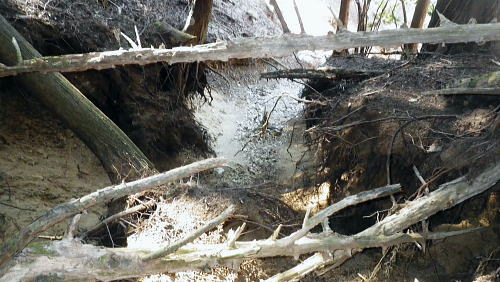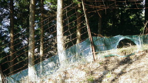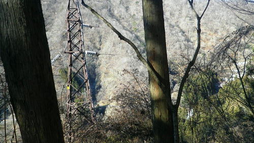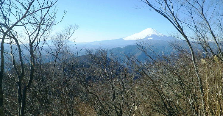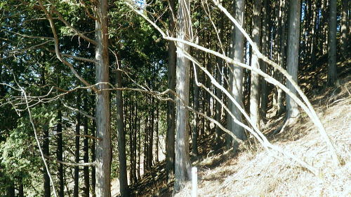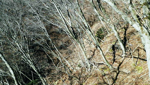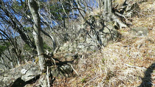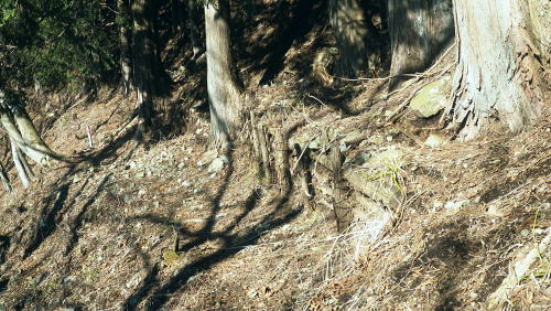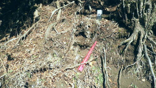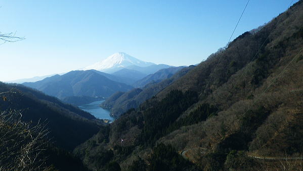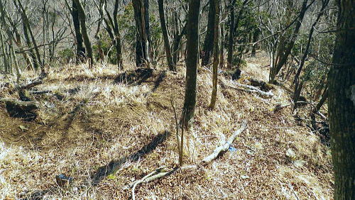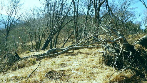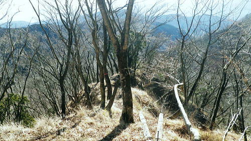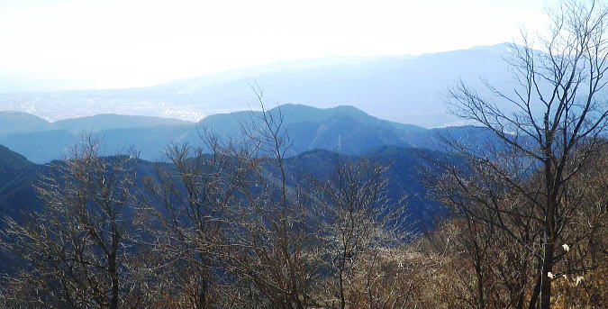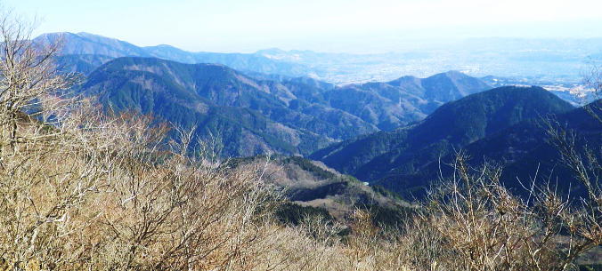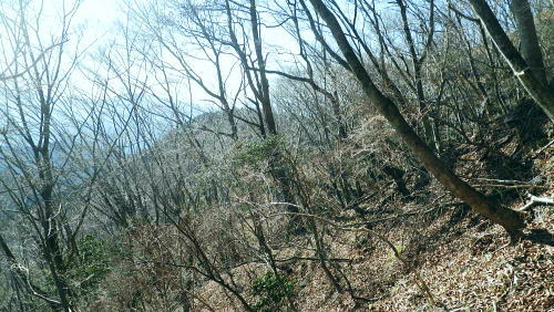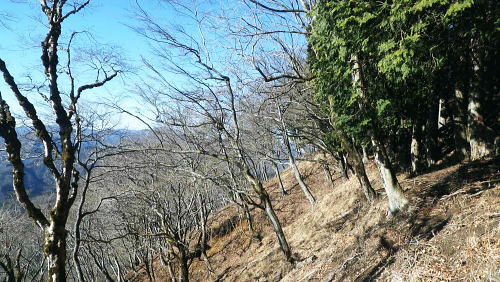 1086m点峰をV字に越える 田代沢ノ頭西斜面経路から1086m点峰南尾根を越え.田代沢ノ頭西斜面経路へ―後は小豆畑沢左岸尾根の山林管理道を下りた。 杉ノ沢経路から1086m点峰・・東尾根から南尾根 田代沢ノ頭西斜面経路から1086峰西尾根・・森林管理道・ヘリコプター 小菅沢の旧経道(落合線鉄塔管理道)を下る 中津川.杉ノ沢に隔てられた栗ノ木洞とシタンゴ山 1086m峰より.11:42シタンゴ山以外は過って歩んだ山並が続く 奥に連なる鍋割山稜.その先は塔ケ岳と木ノ又大日. 右に延びて大山から伊勢原.鶴巻.秦野. 中央は鍋割山南尾根が横切り栗ノ木洞から567m三角点峰・・横切る送電線は酒匂線.裾野は松田町。 手前は伊勢沢ノ頭南東尾根.720m圏コブ. 今回は右下の茂みに隠れたオンバク沢中間の南東尾根を詰め1086m峰に立っている。 御殿場線沿いの山々 山北町の山並高松山北尾根と町界尾根 暮れの22日には松田町と山北町との町界尾根と高松山南西尾根の山々を歩んでいる。・・後半 右上は箱根神山と明神山.左に長く延びる尾根の裾野が駿河平野・・肉眼では大島三原山.猿島に真鶴岬が望まれていた。 第六天.尺里峠.高松山と西峰.手前が西ノ尾と中央に見える新秦野線29号鉄塔。更に手前はシダンゴ山から連なる町界尾根になる。 1086m峰の南尾根 緩やかな南尾根の起伏.12:101086m峰南尾根から田代沢源頭経路を経て西尾根を下る 11:40(1086m峰).大21:10一12:34田代沢源頭北側経路分岐一12:52伊勢沢ノ頭南尾根分岐 一13:19(1086m峰西尾根上分岐)一13:50小豆畑左岸尾根取付き地点. 日影山,不老山世附権現山,重なる菰釣山 伊勢沢ノ頭南尾根より.12:23左遠方は盃牌岳と御前岳.右奥は南アルプス. 富士の前衛が不老山から続く三国尾根と右に綴る甲相尾根 日影山から秦野峠の稜 左下をアップ暮れの22日に歩んだ山北の山々・・前半 866m圏コブから920m圏コブに繋がる尾根で左下は秦野峠。尾根を隔てた左手.手前の谷が中津川杉ノ沢. 峠を越えた奥が皆瀬川ヘイソ沢。手前の谷間が小菅川田代沢。 トラバースを綴る分岐点 田代沢ノ頭西斜面経路分岐.12:34田代沢ノ頭西斜面旧経路分岐 伊勢沢ノ頭南尾根. 960m付近で田代沢源頭の北側経路に入る取付きを見付ける。 そして1086m峰から直進する登山道を分け.右後方に折れて細い荒れた経路に漸く入ることができた。 経路取付きはよく見定めると尾根筋の右側に薄青いテープが短く何点も枝や露岩.根に付けられていた。標柱類はない。 高度計を確り見定め.探せば分かる分岐. 踏み跡は右後方に綴られている。初めての人は探る気持ちをもたねば分からないかも知れない。 径路取付きから見下ろす南尾根田代沢本流右岸の源流流域 取付から急斜面のトラバース 幾度となく抉り取られた山腹道.12:38 12:43トラバースの要点・・今回は途中でルートを失いはしたが南尾根から径路にでるまでのトラバースは今回の一番険しい踏み跡になった。 薄い踏跡の上.土砂は何処も崩れ気味にあり.手でバランスを取る所も多い。枝沢なり窪地の横断は必ず先のルートを 見き分けてから横切ること。又要所にはテープが先を導き非常に助かっている。 分岐・・田代沢源頭からの旧経路 遠方は高松山.2:50秦野峠から田代沢ノ頭にでて北上する径路.痩せた岩稜で高度感あり. 分岐・・田代沢西斜面旧経路 水平径路の分岐.12:52田代沢ノ頭西斜面旧経路 分岐にでる。右に折れれば1086m峰西尾根の径.或いは伊勢沢ノ頭西斜面に続く経路.左は田代沢ノ頭から秦野峠分岐に繋がる南尾根。 今来たトラバースの踏み跡が伊勢沢ノ頭南尾根から秦野峠にもでてる。その先の秦野峠分岐を越えれば林道秦野峠にでる。 分岐・・北側は植林帯の境 森林帯が現れる分岐の境が又林層の境になっていた。植林帯の角地,山腹径路も自然林との境を綴っている。 分岐にでて.ホッとするほど確りした水平径路になっている。 林層の境を行く散策的な径路.12:52 抉られた溝窪.12:581086m峰西尾根にでるまでにある1ケ所の難場.この窪地は深く抉られていた。左側から右に移るが対岸正面は登れず。 窪底を少し奥に入り,這いでる木の根を利用して突き上げる。危険はないがやらしい所だった。 後は西尾根まで明るい眺望と自然林の境を楽しみながら歩む。 山北山地と西丹沢 13:00丹沢湖東岸が手元に見下ろされる。今回の山行の下山地点になる 古い昔の丸太の土留め.13:03小豆畑沢左岸尾根 1086m峰西尾根に乗る分岐.13:09西尾根分岐 この尾根の尖っ突き分岐.950m付近で左に折れ.小豆畑沢と田代沢に挟まれた尾根筋を末端まで下り林道秦野峠線に乗る。 鹿棚を潜り.そのまま伊勢沢ノ頭西斜面の旧径路を綴れば山神峠にでてる。ただその直前のガレは崩壊し.迂回を強いられた。 高巻きか.鉄塔管理道にでて峠に立つことになる。私には初めての地域,高巻きは浪費が多く.下るルートは難度が分からず外している。 本来は山神峠に回り込み.鉄塔管理道から蕗平橋を見下ろしながら林道へ降りたかった。 尾根を綴る山林管理道 分岐より下る西側の尾根筋.13:13尾根伝いに右脇に鹿柵の連なるのを見