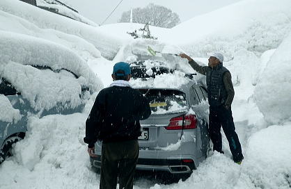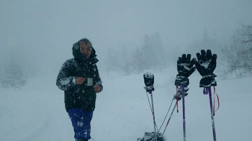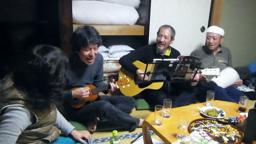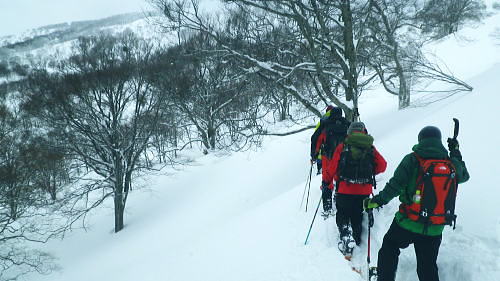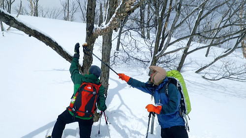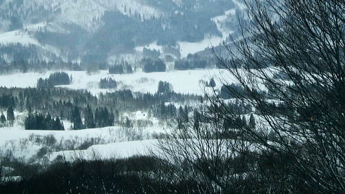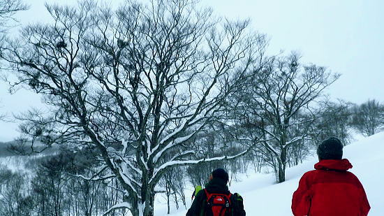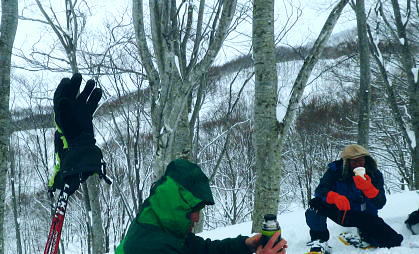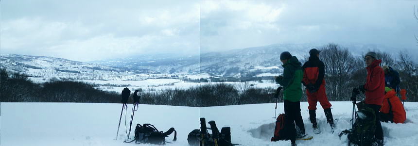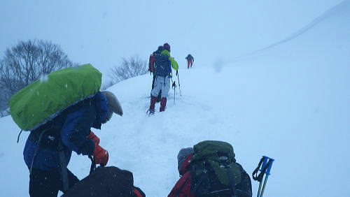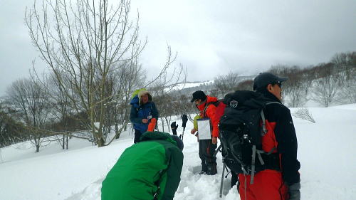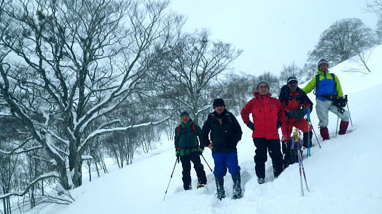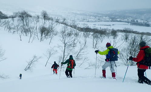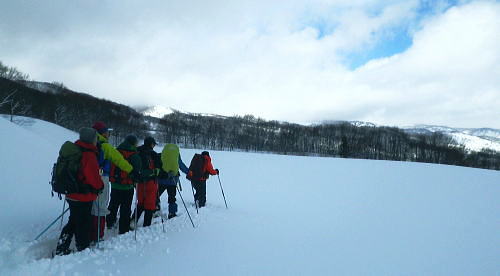 | ・・戸狩冬期スキー合宿 北信の山々Top 46年振りの戸狩温泉.旧二十一番荘(現メーブルハイム)と鬼ブナの森ツアー 春季OB会親睦会とスノーシュで鍋倉高原.牧峠のブナ林を周回する。戸狩スキー場. 2015年02月13〜15日 13日. m見城.池田.滝島.鈴木.松村.立松.小原夫婦.加波 14日. m工藤.田島.石戸.剣持夫婦.児玉.鈴木.河原.松戸・・参加者17名 昨年の鹿沢OB親睦会は南岸低気圧の影響をもろに受け.甲信越地方は史上稀にみる豪雪に襲われた。各交通機関は不通が続出し. 高速道は孤立し.親睦会は中止に追い込まれている。それに代わり昨年秋の親睦会は55周年記念行事として五色温泉「宗川旅館」で催された。 それに続き戸狩五荷の旧二十一番荘を回顧の宿として集う。鹿沢から変更されている。 現役時代.冬季スキー合宿で何度も通った宿. 46年振りに旧21番荘(現メイブルハイム)に.当時の仲間達が集う。 1966年12月.初めての戸狩スキー.準強化合宿行が戸狩温泉旧二十一番荘を起点に行われていた。 私は2日目にして転倒. 前かがみに転び.右足の足首上.外腿を自分のエッジで16針分切っている。 合宿終了まで通院を重ね.炬燵にも入れず.毎日何もせず過ごしていた。先輩の指導で「転べば停まる!」が合言葉だった。 その後.翌日から新人はスキー教室に入会するようなる。この宿右は部活動として4年間通っている。 2007年11月に訪れた「21番荘」は「メイブルハイム」に改名. 何度かOB親睦会を催し.最近で2006年02月に行っていた。 今回は私も参加. 戸狩に入った当日は滝島先輩とスノーシュで仏ケ峰へ。翌14日はガイドによる鍋倉山のブナの森を散策する計画を立てた。 又後輩の小原夫婦の成染めは共にクラブに入部しながら旧二十一番荘のアルバイトが発端だったと.ここにきて主人から聞かされた。 県道95号を分け.みゆき野ライン 吹上隧道を抜けると一面の雪国へ.13:382月13日(金).晴後雪 jr御徒町6:33=6:51東武池袋.急行7:00=7:43若葉.全員集合.標高33m=8:11鶴ケ島IC=佐久平PA =豊田飯山IC=道の駅「ふるさと豊田」蕎麦10:35=11:16戸狩温泉「メイプルハイム」. 雪国へ 東武若葉では晴天に恵まれる。上信越道に入ると周りの山々は薄いベールのような霞雨に覆われた。 秩父.西上州の山々に疎らに被る新雪を見て.藤岡ジャンクションが近ずくと正面に純白に染まる浅間山が雄大な姿で眺められている。 やや霞み気味.その右手前衛の山々の奥に1つ.白銀に煌めく四阿山の頂が小さく突き上げて望まれた。今回はその裏側の北信州へ向かっている。 佐久を抜けても信越道沿いは全く残雪が見られなかった。薄日に変わったせいか.上信国境.烏帽子岳に被る新雪も. 白みが幾らか薄いらいでいる。昨年の「平成26年豪雪」が嘘のような大地がここかしこに見られていた。 上田の市街地を過ぎ雪雲の薄いベールに包まれるも.周りの裾野に残雪は全く見られなかった。須坂から信州中野へと抜けている。 晴天ならば白根から志賀に至る山並に白銀が見られる筈だが裾野の台地を見ても.その姿を想像することもできなかった。次は豊田飯山ICになる。 沿線の田畑も.畦道も.路面も乾き.残雪の姿は一向に見られず.後30分強で戸狩に入る。積雪3mは超すと云う。信じられぬ道中になっている。 それがIC手前の隧道を潜ると一挙に雪国に変わった。見慣れた上越の清水隧道と同じような状況で.隧道を境に雪国に入る。 大地は全て新雪で被われ.樹林の枝々も.樹葉にも薄ら雪を乗せ.ICが近ずくと見る見る積雪は増してきる。路肩に積もる積雪も高い。 IC隣りの道の駅「ふるさと豊田」で昼食を摂る。既に小雪が舞い.窓際に積る新雪の白さが神々しい。 途中.3台の除雪車と擦れ違う戸狩五荷 国道117号に入ると路面が見えるものの.積雪で道幅も狭まり.周りの雪は本降りになる。 頭上に雪雲の雪線がのさばっている。見る見る降雪は激しさを増し.路面にも雪のわだちを作りだしていた。 雪雲が視界を閉ざし.濃さを増す中.滝さんの新車は走る。千曲川を右岸に渡ると川底の谷間を走るようなった。 立松君から電話が入り.後20分ほどで宿に着くと見城さんが答えている。舞う雪に吹き込む渦が谷間を支配し始めていた。 降雪が激しく一時視界が途切れる。走る車から数m先が臨めなくなった。0mに近くなる。路面も路肩も空も.白一色の大地が迫り. ホアイトアウト近い視界は.擦れ違う車も殆ど確認できぬほど。2年前八ケ岳白樺湖の湖畔で.0の濃霧に遭い.五里霧中の世界になった。 現役時代では一切経浄土平で現役最後の合宿でホアイトアウトに遭遇している。 車が渋滞しだし.そして停まった。4台前の地元の車が追突した。波打つ風雪が河原の車を襲っている。 距離にしては短い。漸くして風雪の吹き溜りを抜けた。柏尾橋を左岸に渡れば飯山線戸狩野沢温泉駅に入る。 戸狩駅右脇の踏切を渡り.雪降る中.車窓から見上げる道脇の雪盛りに.豪雪地帯を感じ.積み上げられ続く雪道を更に綴っている。 ここから戸狩スキー場口前に建つ「メーブルハイム」は直ぐだった。RHCの56周年の集大成のため.