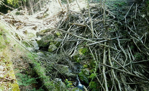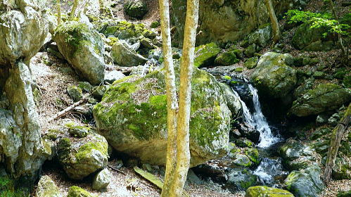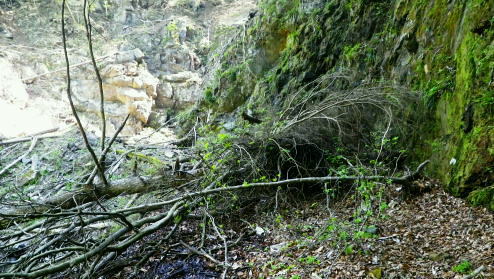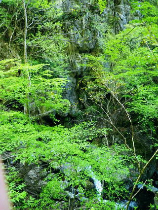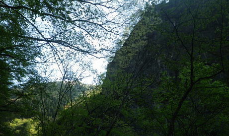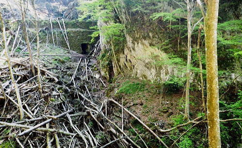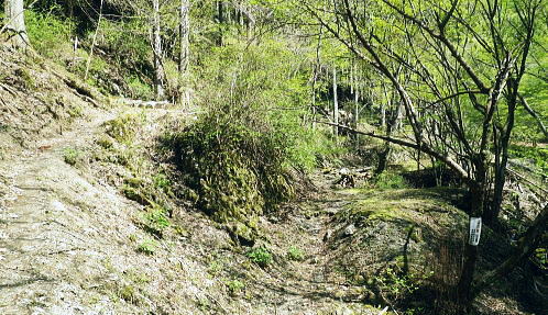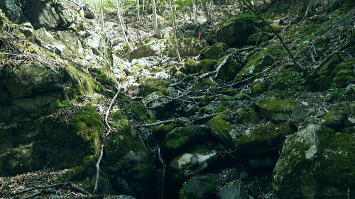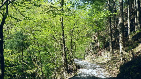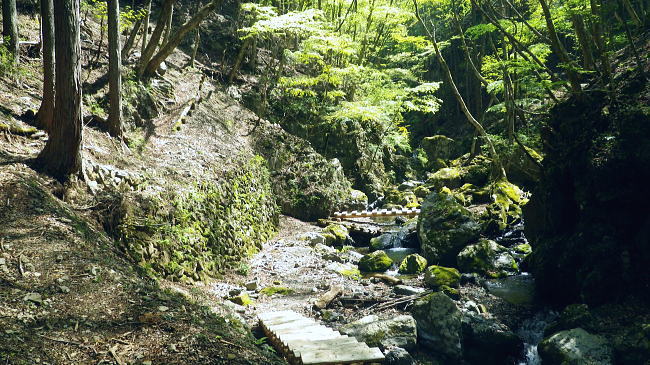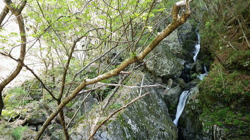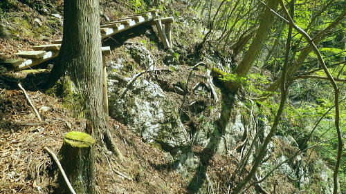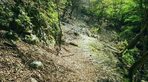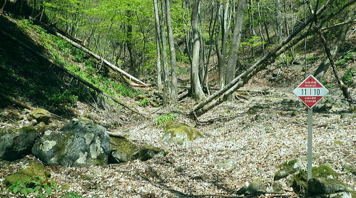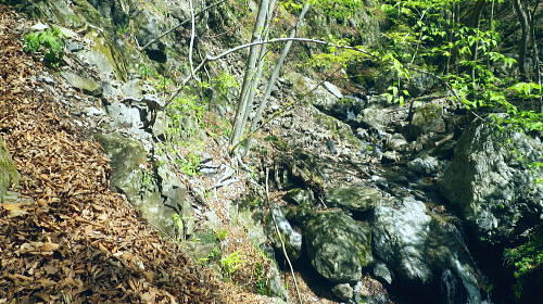 | 倉沢谷流域概念図 奥多摩.奥秩父東部概念図 日原川倉沢谷 2015年09月05日. 横篶尾根を周回・・見通尾根から倉沢谷右岸歩道から幕岩南東支尾根―ハンギョウ尾根中腹道を経て小川谷左岸水平歩道 2018年12月08日. 小川林道クラミクボを遡り支尾根から板形尾根―三ケドッケ山腹道から横篶尾根を下り見通尾根 2015年04月27日. 倉沢谷林道から右俣長尾谷左岸歩道を経て左又窪右岸尾根―棒杭尾根から左俣塩地谷に回り込む 2016年04月16日. 棒杭ノ頭南尾根から蕎麦粒山鳥屋戸尾根を周回―松岩ノ頭松岩尾根から山伏沢を経て川苔山登山口 2016年12月03日. シオジ窪右岸尾根から鳥屋戸尾根を経て神庭尾根を南下―諦めた里の白妙橋右岸歩道と平石橋左岸歩道 2021年11月06日. 倉沢bsから倉沢谷右俣.長尾谷右岸歩道を経て浅間前窪右岸尾根―仙元峠仙元尾根を下り秩父浦山大日堂 参考として・・倉沢谷右俣の長尾谷の各支流の沢名はHP「樵路巡游」氏の古地図を利用させて頂きました。 奥多摩明細図(東編)とは「左又窪」が異なり沢が1本ずれて名付けられています。棒杭尾根の1360m圏に突き上げる尾根の出合は 970m圏の作業終点付近の二俣980m圏から延びる尾根で.又窪右岸尾根は浅間前ノ窪との出合からの棒杭ノ頭南尾根。2021.10訂正. 新緑の倉沢谷右俣から背稜の長沢脊稜の棒杭ノ頭に立ち.棒杭尾根から左俣へ回り込み.魚留橋に戻り周回する。 倉沢谷林道から右俣長尾谷左岸歩道を経て左又窪右岸尾根―棒杭尾根を下り左俣塩地谷から二俣に戻りよう周回する 2015年04月27日.松村 倉沢林道起点から右俣長尾谷の右岸歩道・・ICカートの差額 左又窪右岸尾根から長沢脊稜へ 棒杭尾根を下り左俣塩地谷を下り二俣へ 久し振りの奥多摩. 初めて日原川左岸の支流倉沢谷流域に入る。林道に入るも登山道はない。 常に日原へ出向くバスの車窓から見詰めるも.降りるハイカーの少ない谷間だった。鳥屋戸尾根と横篶尾根とに隔てられ.源頭は都県界尾根に接している。 V字状に狭まれた中流の倉沢谷には中間尾根の棒杭尾根が延び.長尾谷と塩地谷と2つの流域を隔て. 尾根伝いには.過って秩父に抜けている。古道が綴られていた。今は水源林巡視路になっている。 右俣の長尾谷は石灰岩質の沢で構成されていた。直登可能な小滝が多く.奥多摩の沢としては珍しく山葵田が皆無で.それでいて両岸は明るく開かれている。 又仕事道は山腹の崩壊が甚だしく脆い。源頭部は崩れ荒れ果てた間々の自然の姿が望まれ.蕎麦粒山に突き上げている。 左俣のツメは三ツドッケの一杯水沿いに延びるのが塩地谷。゙ッルジュ帯から始まる中流から広く開かれ.シオジの川畔林の緩やかな台地が中流にある。 今回は初めての入渓で.倉沢林道沿いに右俣へ入り込み.長尾谷右岸歩道を最後まで綴り.左俣窪右岸尾根を詰め.棒杭尾根にでて棒杭ノ頭に立つ。 この尾根は林道に繋がる左岸歩道終点の「奥多摩区分11/10」班界標から更に.左又窪出合まで荒れた大地が続き.面白いアプローチになっていた。 支尾根筋自体は踏み跡は薄いが危険なガラ場もなく.ツメ近くの棒杭尾根に乗り.長沢脊稜にでている。 復路は棒杭尾根を下り.途中から水源巡視路を使い.棒杭尾根から分かれて塩地谷に入り.林道の魚留橋に戻っている。 実行前までは後半はカロー谷中腹歩道を取り.左岸歩道から日原に下ることを考えていた。 だが倉沢谷左俣に入ればシオジの森が開かれ.若葉溢れる谷間が広がりと1つの谷間で二俣と2つの異なる春先の渓相を味わうことができる。 その好奇心にくすぐれられながら左俣に入っている。初めての流域で調べれば調べるほど歩む先に.悩む未知の世界が開かれていた。 以前は蕎麦粒山南山腹道分岐下から広く扇状に開かれた川乗谷源流の蕎麦粒山寄りに下り.狭く切り立つ桂谷に入渓している。 奥までモノレールが走り.急峻の狭い谷間は驚くことに山葵田の段丘で埋め尽くされていた。石灰岩でも硬い地層を思わすが脆い地形だった。 愛宕山と鞘口山に突き上げる九竜山江戸小屋尾根 jr奥多摩駅前広場のバス停より.7:37駅前のバス停車場と懐かしい食堂「丸花」.電柱には「柳小路」とある 道のルーツを探る旅 長沢脊稜へのアプローチとして日原街道から倉沢林道.長尾谷右岸歩道を歩み.薄い踏み跡から今だ入ったことのない尾根へ期待を膨らませる。 標杭もなく.全てが手探りで踏み跡の薄い尾根を詰め.棒杭ノ頭を目指し.下山は昔の参詣古道から今は猟師の道.棒杭尾根を下り. 棒杭尾根からは左俣の水源巡視路に入り.塩地谷に回り込み幕岩尾根の末端にでて.往路の倉谷林道に戻る形を取ることにした。 下調べで如何にか出向ける目星が付き.周辺を調べる内に谷越をするより.倉沢谷を周回する方がよかろうと云う考えに変わっている。 時間を歩むのではなく.時間の流れを刻み歩む。その方が私に合っているのかも知れない。まずは現地に入り. 長尾谷右岸歩の道終点まで辿り着けるかが問題だった。それから先はその場で考えることにする。 日原街道桜平付近.8:27右手の岩壁が