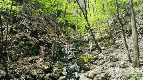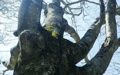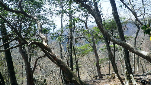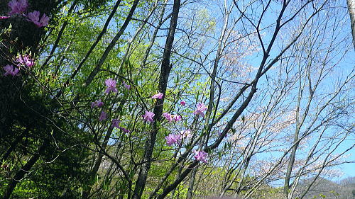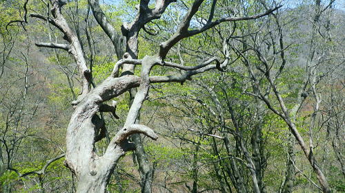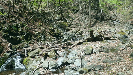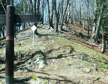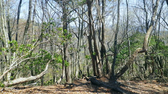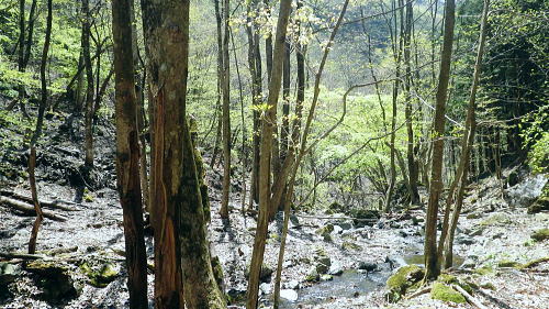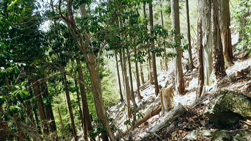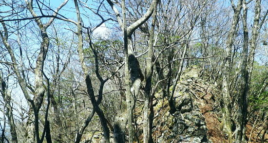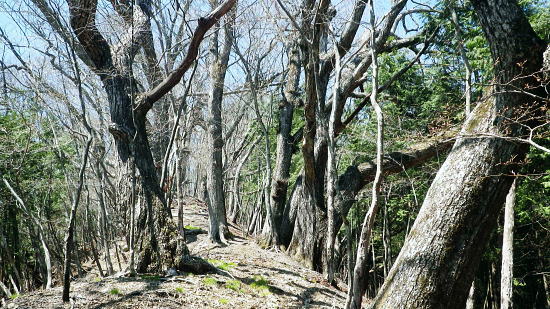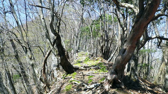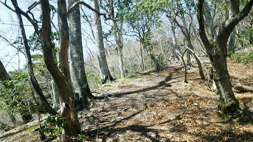 | 長尾谷左岸歩道終点より.自然その間々の踏み跡なき尾根を辿る 上流二俣にでて踏み跡を求め.左又窪右岸尾根を詰め.棒杭尾根の巨木林を潜り長沢脊稜の棒杭尾根ノ頭.に立つ 倉沢林道から右俣長尾谷の右岸歩道を綴る 左又窪右岸尾根から長沢脊稜へ・・自然そのものの尾根 棒杭尾根から左俣塩地谷を下り二俣 河原状が続く倉沢谷本流.10:54右岸歩道終点の林班界標から更に先は落葉に埋まるゴーロ状の見晴らしの良い河原になる。 そしても直ぐ左手から左又窪が入り込む。 左又窪右岸尾根 10:54左岸歩道終点一左又窪一11:24左又窪右岸尾根上一12:38棒杭尾根分岐一13:15棒杭尾根ノ頭. 長尾谷左又窪出合 ここから共に細い沢溝に変わっている.10:58左手が左又窪.右の正面は本流の仙元前窪。980m地点・1対1量. 左又窪出合右岸尾根末端 二俣から左手に折れ左又窪に入るとややゴロ石が大きくなり.ザレたV字状の沢筋になる。流心は細いが歩き難し。 乗るゴロ石は少なく土壌は落葉と苔でぬかるんでいた。 ルートは最初の滝上から尾根に取付くとある。尾根末端は急斜面の上.露岩した岩盤が多く.尾根に登るには苦労すると思われた。 ただ少し上流まで詰めれば露岩の壁は途切れ気味になり.山肌に食い込む露壁が見上げられる。その境と斜面を目で追い詰めればよかった。 最初の滝からではなく.対岸側に少し登り.見た目で取付き地点を探りだす。もう10mも上流側に登れば高度差も少なく登れそうだった。 岩盤を左に避け.四っんばいで直上し.右に回り込むと2つの岩盤を抜ける。後は立木に生根を支えにして.微妙な傾斜を登り詰めればよかった。 尾根末端1150mにある幹周5.7mのイヌブナの巨樹は全く分からず。最初から仙元前窪右岸尾根にあるものと勘違いしている。 それ故.頭にも浮かばず.喘ぎ登っていたせいか.気にせず通り過ぎている。 左又窪右岸尾根 尾根末端上に乗る.11:06〜11:27 尾根南西面の伐採帯.11:30南側の沢の瀬々らぎが聞こえる 20分ほどで右岸尾根上にでる。話には聞いていたが本当に西側は伐採されていた。930m圏出合の支流側. 山陰から登ったことで.尚更陽射しは眩い。間伐帯が西斜面を覆い.疎林を抜ける陽射しは強くなる。 植林帯を抜け灌木帯へ 右下は仙元峠?11:31蒼空と雑木のコントラストが美しい. もう足はガクガク.これから尾根に登る前にバテててきた。幅広い尾根を登り.藪はない。又踏み跡もない尾根筋になる。 立木に褪せた赤テープを見て.偶にあるマーキングはどれも古く.垂れることなく質素に付けられている。 丸びを帯びた尾根の急登が続き.11時45分森林限界で小休止した。 春の暖かさに加えて.山を独り占めしている気が心地よく.体力の疲労とはとは異なり. 向かう山に心は安らげられている。春霞もなく.澄んだ蒼空にトウゴクミツバツツジが咲き.天空は色鮮やかに冴え渡っている。 ただこの数日夏日に近い高温が続き.花数は少なく発芽は終わりを告げていたようにも思えた。 奇妙に捩れる立木に迎えられる.12:161260m圏 左手に小尾根が延びる.12:35正面奥が棒杭尾根 緩んで再び急斜面を詰めると云うより.足を運ぶ道中が続く。大地には野草もなく.刈払われた山径より歩き易い尾根に変わっていた。 左寄りにに尾根が延びるのを見て.枝尾根の二又1260mにでる。この尾根は標杭類の印は何処にも印されていなかった。 前方に棒杭尾根の尾根筋が見届けられるようなった 急斜面の登り.12:36露岩帯から更地になり.最後の急登はアセビが乱立し茂る尾根の中になる。 緑色の多さは裾野の若葉と異なり.ここはまだ冬木の世界。 右に.左にアケビの小枝に乗る樹葉に触れ.灌木の茂みに傾斜が緩めば棒杭尾根にでた。 更に高くなった空が開かれ.背の高い喬木が茂る棒杭尾根の踏み跡に乗り.あと一登りで長沢脊稜にでる。 塩地谷を隔てる横篶尾根.12:37 アセビの群生地.12:27取付きのマーキング類.踏み跡なし 棒杭尾根に乗る 右岸尾根の合流地点1360m圏点.12:38 棒杭尾根にでて左又窪右岸尾根取付き.12:56高木にアセビが茂る尾根からの鳥屋戸尾根 棒杭尾根 痩せ尾根.12:55灌木も疎らな痩せ尾根から天空は蒼さを増し.尾根のツメは更に巨樹.老樹が群がる尾根になる。 ブナにミズナラ.ダケカンバの巨樹が乱立する明るい尾根。潜ると長沢脊稜の縦走路に飛び出した。 縦走路手前の巨樹林.13:00 13:15 脊稜手前の老樹達.13:20 13:03棒杭尾根口 長沢脊稜の南側を巻く縦走路より.13:05棒杭尾根の取付きは縦走路の道標裏側から抜けている。立木の幹に赤テープが巻かれていた。 滝入ノ峰と横篶山 横篶山尾根と左俣.塩地谷長沢脊稜の縦走路にでる。「←一杯水・酉谷山.蕎麦粒山・日向沢ノ峰→」の道標が左右の進路を示している。 その標柱に小さくマジックで「棒杭尾根」と記されていた。登山道の樹間からは春霞に描かれた横篶尾根が望まれる。 又道標の背は明るい斜面が続き.「奥多摩区分12/11」林班界標柱が立ち.過ぎれば数分で脊稜に立つ。 13:11縦走路分岐と脊稜に立つ1本の巨樹 都県界尾根 13:12仙元峠 脊稜の小コブを東へ2つばかり越