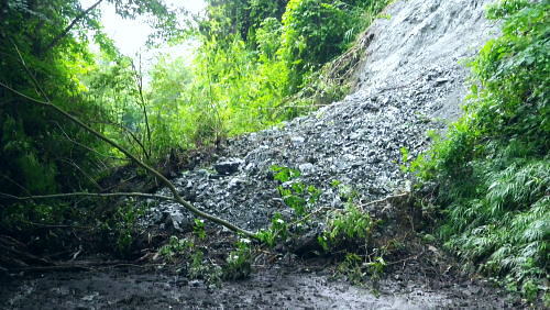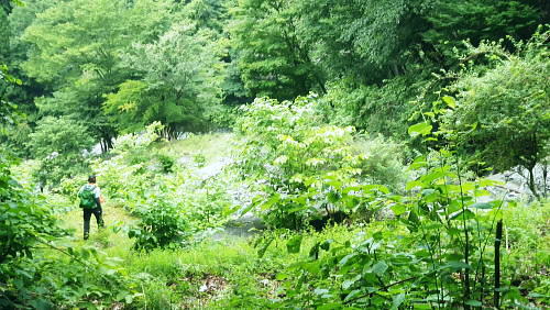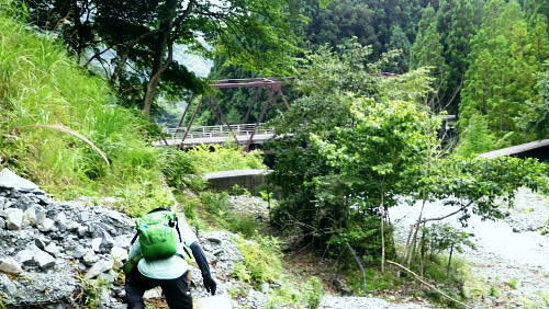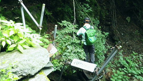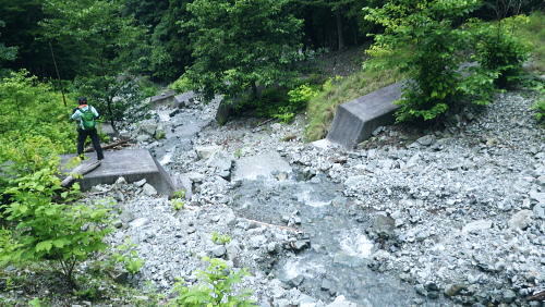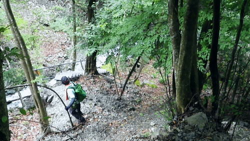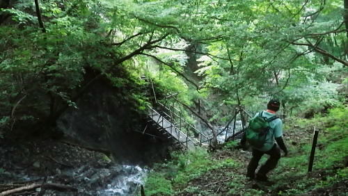 | 玄倉山神峠で濃霧に遭遇し下降ルートを考える? 見上げる上部はに゙スが舞い.伊勢沢ノ頭の登り返しが億劫で.近場の鉄塔管理道へ下る―伊勢沢を下り.落合林道から玄倉集落に戻る。 白井平から玄倉ノ野を経て山ノ神峠 鉄塔管理道から伊勢沢を経て.送電線落合線から落合林道.玄倉へ・・峠で出会った青年 玄倉山神峠.落合線41号鉄塔 大垣から下り.41号鉄塔と真下が山神峠.12:40鉄塔管理道.落合林道 12:40(41号鉄塔)大13:10一山神峠13:15一13:48(39号鉄塔横)一13:56伊勢沢の沢底一14:10伊勢沢出合 一14:25蕗平橋:40一集落経由一15:40玄倉bs. 大ブナ954mから落合線(玄倉川第二送電線の管理道路.鉄塔巡視路の41号鉄塔にでて.足元の薄暗い山神峠で休まず. 明るい視界の利く基部で昼食を摂り.峠に下りている。鉄塔真下の基部.木留め段に坐り.左右に架かる送電線を見渡す。 .アッチ沢と小菅沢を見下ろしながら贅沢な展望を得て.遅い昼食を摂っていた。 プラ容器にご飯とレトルトカレーを詰めてきた。空腹感を感じ.まず食わねばと。ポカリから茶に飲物も変え.気分だけ少し贅沢に。 過って雨山峠から鍋割山に立ち.後沢中間尾根を下っている。山神峠にでるまでの玄倉経路では巨樹の崩落に伴う土砂崩れに出合い散々な目に合っている。 漸く山ノ神峠にでたものの.峠からの展望は霞み強く望められなかった。今回山神峠に降り.幾らかだけでも視界に恵まれた。 低山でも深い山並の豊かさを改めて知ることもになった。玄倉川第二発電所からの送電線の鉄塔が点々と眺められもした。 玄倉川及び支流上流側 玄倉沢上流を望む・・41号鉄塔基部より.12:43アッチ沢と上流側の板小屋沢.ツメは檜岳。中央正面は伊勢沢ノ頭北尾根の末端台地.698m点コブ。 コブの右肩を越えた裏側(北)が玄倉湖.玄倉ダムになる。その右脇に建つのが玄倉沢第二発電所。遠方は霞む丹沢山. 久し振りの山登りで.行程は捗らなかった。その上.天気は崩れ気味.南東尾根を下る積りでいたが伊勢沢ノ頭は既にガスに包まれ灰色の世界。 馬力で後一頑張りれば踏み跡は確りしている。寄に下るか? それよりゆっくり西側の谷間を見下しながら鉄塔管理道を下り. 落合林道から玄倉へ戻るか? 思案のしどころ。食事を摂りながら下るルートを考える。そして山神峠に降りる。 アッチ沢源流側 左半分アップ・・698m点コブと42号鉄塔.玄倉第二発電所 送電線落合線はこの鉄塔基部から北上し.698m圏コブで右肩を越え.コブの裏側の玄倉湖.対岸にある玄倉第二発電所と結ばれている。 玄倉第二発電所(神奈川県企画庁)の出力は2900KW。熊木ダム(堰高14.9m.重力式コンクリート)の貯留水を利用。 水路式で水圧鉄管は有効落差175.55m。 送電は6.6KVから66KVに昇圧され.玄倉線(玄倉第一発電所の電力)と21号鉄塔で合わさり.落合発電所に送電さ. .東電の落合線送電線網と繋がれる。放流水は玄倉ダムから導水管に乗り.玄倉第一発電所で再び運用されている。 又玄倉第一.第二発電所ができる以前にはユーシンに農林省管轄の丹沢治山水力発電所.28KVがあったらしい。 伊勢沢ノ頭・・小菅沢源流側 山神峠,南側の鉄塔群.12:45逆の送電線の霞む遠方は秦野峠林道が横断するブッシュ峠と日影山 鉄塔管理道の上部中腹には伊勢沢ノ頭西斜面旧径路あり.山神峠直前の右俣は崩壊が激しいガラ場で.大きく欠け落ち,通行は不能。 鉄塔管理道を辿り.伊勢沢左岸よりから大菅沢左岸の巡視路を巻き.旧径路に戻るか? 鉄塔管理道沿いに下るルートになる。 山神峠からの鉄塔管理道 小菅沢源流の左岸より手前の30号鉄塔は山神径路と鉄塔管理道の分岐 落合線(玄倉川第二送電線)の41号鉄塔から40号.39号.38号鉄塔が見下ろされる。38号.37号鉄塔間に伊勢沢が流れ. 横切れば35号鉄塔からは真下に蕗平橋が見下ろされた。伊勢沢を詰めると伊勢沢ノ頭. 越えれば裏側の寄沢へ下りられる。 山神峠 短い参道階段上の木祠.13:11巨木の御神木に守られている山神様と水神様 玄倉山神峠 峠にでて木祠をお参りしていると寄から登ってきた単独行の青年に出会う。 彼は山神径路から雨山沢に出向く予定でいたらしい。それが最初のガラ場でつまずき峠に戻ってきた。 西側に下るのは初めてのようだ。小菅沢右岸径路を尋ねられた。戻ってきた力量だと少し難しく思われた。 山神径路(右岸径路)は規制になってからは入るハイカーも少なく.ガレ場の崩壊は更に進み荒れ模様。最近何度か通った人の記録を読む。 下るべきルートではなくなったとある。又ルートは沢底に取った方が楽だとも。山神径路を希望する彼に.そのまま説明した。 私は伊勢沢ノ頭を越える積りだったが眺望が利かなくなり.諦め鉄塔管理道に入り蕗平橋に下ると説明する。 谷沿いに下るのは私が選んだ鉄塔管理道以外見当たらなかった。私も初めてのルート.共に下ることになる。 青年を見ていると改めて若さの素晴らしさを肌で感じている。況して私はこの頃急に体力が衰え始めていた。 言葉数少なく語る彼。同行を求めた訳でもないがその言葉を信じ.私に付いてきた。彼をトップ