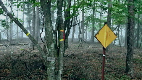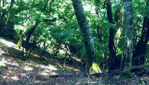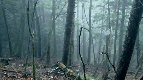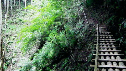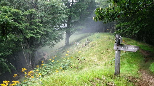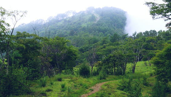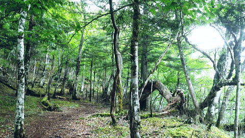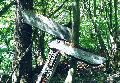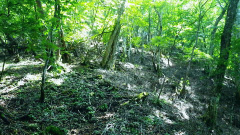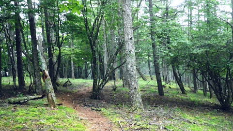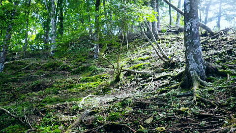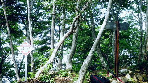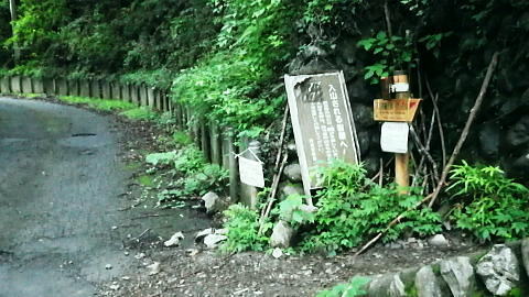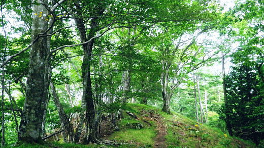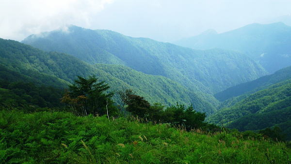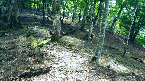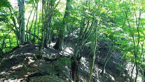 | 鷹ノ巣尾根から防火帯の石尾根を下る 将門馬場からタル沢尾根を下るも強い濃霧強で.先が見定められず断念.戻り石尾根を末端.氷川へ下る 旧巳ノ戸の部落から入り巳ノ戸尾根を綴り鷹ノ巣尾根 お伊勢山.稲村岩尾根からヒルマシクイノタワを経て鷹ノ巣山.将門馬場で濃霧強く石尾根を下る ・・樽沢尾根は諦める ヒルメシクイノタワにでて鷹ノ巣山から石尾根を下る 鷹ノ巣尾根の鞘口ノビレ・・お伊勢山の南鞍部.11:40お伊勢山から鷹ノ巣山を経て将門馬場石尾根 お伊勢山11:21一11:43鞘口ノビレ一12:44ヒルメシクイノタワ一13:25鷹ノ巣山:45一14:07戸倉山への南側道分岐一14:43カラ沢ノ頭 一15:00将門馬場:45⇔タル沢尾根. 一17:27林道小中沢線一17:32羽黒三田神社表参道口一18:00jr奥多摩. お伊勢山から南下るとヒルメシクイノタワとの間に大らかに広がる鞍部.鞘口ノビレにでる。樹林に覆われた木洩れ日の尾根筋に開かれた小平地。 中央に祀られた箱形は昭和59年03月巳ノ戸谷で遭難した慰霊碑。遭難碑の脇には朽ち果てた古い道標が年輪を刻むよう斜めに傾き.如何にか留まっている。 道標には左(西側)方面は「巳ノ戸ノ大クビレ,鷹ノ巣山」。右(東側)方面は「日原(バス停)」とあり.柱には「鞘口ノクビレ」とある。 そして左奥に「多摩区分47/44」の林班界標柱が立てられていた。 新旧山道に分岐・・「巳ノ戸ノ大クビレ」とある朽ち果てた道標.11:44近くに鉄骨や空き缶が散乱していた茶屋があったのか? 旧林道 日原の集落から巳ノ戸沢の主に左岸を遡る巳ノ戸林道は鞘口ノビレの左下から合わさり.鞍部から石尾根上の巳ノ戸ノ大クビレと結ばれている。 現在は鞘口ノビレから先は大崩壊が進み廃道化し.取付きに東京都水道局の「通行禁止」の立札が示され.崩壊が激しく荒れた廃道になっている。 巳ノ戸ノ大クビレは石尾根の鷹ノ巣山のその西側にある日陰名栗峰との鞍部にあり.直ぐ下に鷹ノ巣山避難小屋がある。 巳ノ戸沢側の林道は崩れながらも踏み跡が残されているとのこと。20数年前までは正規の作業道が鷹ノ巣尾根と交差する形で通っていた。 1983年版の「山と高原」地図には記載されている。過って日原集落から鷹ノ巣山石尾根を目指す際のルートは2つあり. 現在残っている稲村岩尾根の他に巳ノ戸沢沿いをそのまま遡る「巳ノ戸林道」があった。 又石尾根から青梅街道へと繋がるルートは浅間尾根を下り.奥・峰谷の集落を経て.街道の峰谷橋で結ばれている。 街道から左に折れた下流は奥多摩(氷川)へ.中央は小河内峠越えで浅間尾根.或いは笹尾根を越え甲州街道へと. 上流側は旧青梅街道から大菩薩嶺越え.甲府に至っている。 巳ノ戸沢側のツメ 右岸を主に巳ノ戸林道が綴れている 鞍部から南側の鷹ノ巣尾根へ.11:43 登るにつれ扇状に広がる.12:12スズタケ 鞘口ノビレから登り返し,鷹ノ巣尾根を南下すると次第に幅広い斜面に変わり.伸びやかな尾根はブナ,カエデが多くなる。 尾根の形状は失いつつあり.そして斜面を被っている筈のスズタケは全く見られなくなっていた。予想は外れ,スズタケは絶滅している。 斜面は下生えもなく見通しがよくなっていた。 まだ時期的には夏.真っ盛りの筈が気持ほどの枯節が地上から細く10cmほど見られるだけで.枯タケの姿さえ消え伏せていた。 鷹ノ巣尾根上部の振り返る二重山稜.12:22そこは無意味な斜面が一面に広がり.高度を上げ.左手から起きる起伏との二重山稜になるも,スズタケらしき地層は見られなかった。 況してこの辺はスズタケが背丈を越したと云われている。枯れた残骸すら見当たらなかった。 2001年6月にここを歩んだハイカーの紀行文にによると枯スズタケの密度濃く.更に青葉のはっきりしたスズタケが茂り. 踏み跡も分からぬほど密生していた。又立派なブナが多かったとも記されていた。 稲村尾根の北側の草付き側壁 ヒルメシクイノタワへの急登.12:28冬期には壮大な北側の雪壁になる斜面 12:39ヒルメシクイノタワの北壁 二重山稜が1本となり.平坦な突き上げの1480m付近から右寄りに南南東に向きを変えると苔むしるヒルメシクイノタワの北側を被う土壁を直登した。 積雪期には雪壁になり下りが難しく.鞘口窪のツメに入り込んでしまう恐れがある。又右に回り過ぎると二重山稜の東外の谷間.巳ノ戸沢源流に入る。 視界の良し悪しで左右されるだろう。一昨年2月にヒルメシクイノタワを下った時.稲村岩尾根以外にトレースは全く見当たらなかった。 今回のタル沢尾根の状況と同様.視界はあることが下れる最低条件になっている。 稲村岩尾根・ヒルメシクイノタワ 「44/42」林班界標が立つ.12:44 道標.13:17ヒルメシクイノタワの古い山名標と頂への途中で「45/44」林班界標柱 ヒルメシクイノタワは稲村尾根上にある1562m点の細長い台地。詰めた向かいは鷹ノ巣谷。隔てる対岸はネズミサス尾根で 木枝に閉ざされた植林とのモザイク模様が描かれた尾根。台地には真新しい「44/42」林班界標柱に. これ又古いガッチリした鉄柱の道標が立てられていた。ここは3度目の通過.今回はTの