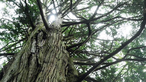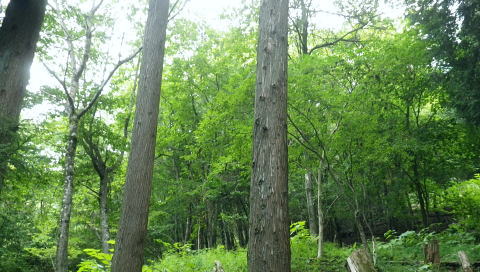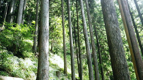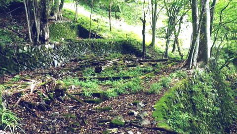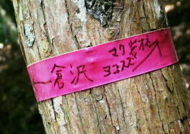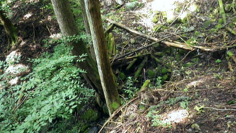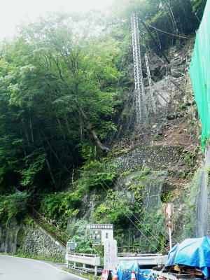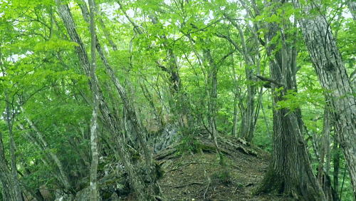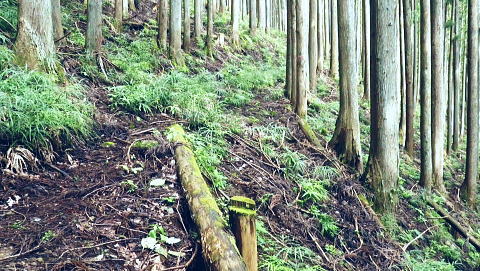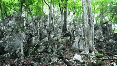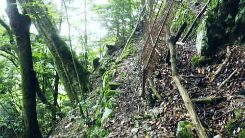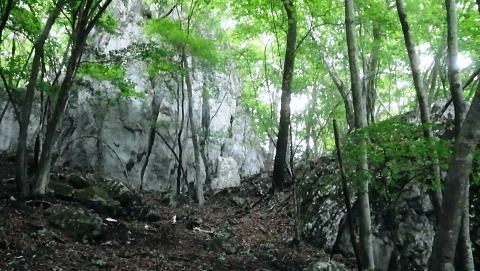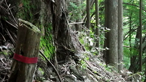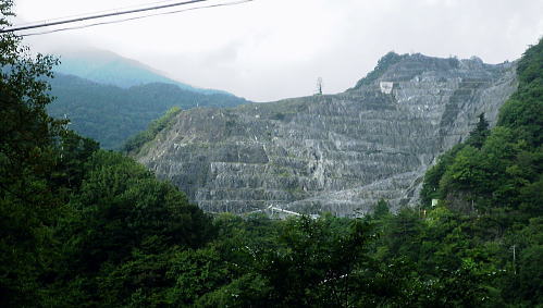 | 日原.横篶尾根を取り囲む作業道.経路を周回する・三ケドッケは未踏・・日原川倉沢谷Top 日原散策まっぷ 倉沢橋の見通尾根から旧倉沢集落を経て倉沢谷右岸経路・幕岩尾根南東支尾根.横篶尾根と北上し.一杯水小屋からは三ケドッケ南経路から長沢脊稜にでる。 左へ回り込み板形尾根.板形十字中腹道を経て.経木小屋跡地に降り.小川谷左岸の水平歩道を綴り東日原の集落にに戻る 1015年09月05日.松村 倉沢橋の右岸歩道から幕岩尾根南東支尾根を登り横篶尾根・・旧倉沢 一杯水小屋から長沢脊稜の左.鞍部にでて板形尾根を下り.横篶山西面水平歩道 横篶尾根を取り囲む経路を倉沢の大檜から東日原の旧小学校へと周回する。 今年4月に倉沢林道から倉沢谷右俣の長尾谷を詰め.長沢脊稜にでてから左俣の塩地谷に回り込み戻っている。今回は倉沢谷右岸歩道を歩む。 倉沢谷の見通尾根から廃村を訪れたのを機に.倉沢谷右岸の旧作業道を繋ぎ.横篶尾根をほぼ周回する水源巡視路に入る。 カロー谷と倉沢谷の分水嶺を成し.三ケドッケ(天目山)から日原に南下するのが横篶尾根。 倉沢谷左岸歩道から幕岩の南東支尾根を経て横篶山への巡視路に入り.その先は避難小屋までは登山道。 そこからは三ッドッケの分岐道から板形尾根を下り.カロー谷の山腹道から日没と競争しながら終盤は横篶山西面の小川谷水平歩道を下り東日原へ。 左奥は鍋割山北尾根上の以外と大きく見える鳩ノ巣城山759.7m 時間待ちの単線.古里駅下り線ホームより.7:09右斜面の切り開きにはjr青梅線古里変電所に入電する支線鉄塔が連なる。 前山行は日原川対岸の鷹ノ巣山に登っている。猛暑が丁度途切れる頃で.それから2週間は秋雨前線の影響を受け.肌寒い日が続いている。 エルニーニョ現象の影響を受けて海水温が低く.大陸からの張り出しが弱いせいか? その中.久し振り.日差しが戻るとの予報から入山を決めている。 移動性高気圧が日本海を横断. 風向は朝の西北西から東北東の微風に変わっていた。 それでも山に入ると天候は不安定さを増し.曇天から午後には雨雲に変わっている。今にも雨粒が落ちそうな黄昏のような装いを示していた。 東日原には予定通り下山できたとは云え.初めてのルートで.苦労と模索が続き充実する山行になった。 9月05日(土).曇後濃霧.午後から重い雨雲 jr御徒町4:49=4:52神田5:00=5:55立川6:04=6:34青梅:35=7:18奥多摩:27.西東京バス=7:45倉沢橋bs. 見通し尾根にある大ヒノキを見学し旧倉沢集落を尋ね.倉沢谷右岸の水平道から幕岩尾根南東支尾根を詰め横篶山にでている。 横篶山からは横篶尾根を辿り.一杯水避難小屋から分岐道の水平道を選び,長沢脊稜にでて.ハナド岩までピストンした。ただガス濃く展望は丸っきりの0。 板形ノ頭に戻り.ハンギョウ尾根からカロー谷の中腹道に入り.カロー谷を横断して小川谷左岸水平道から東日原に下りている。 頂を目指すと云うより横篶尾根周辺の水源林巡視路を辿っている。程ほどの藪があり,又緑深い夏の終わりを示す山並を味わう。 ただ横篶尾根の尾根筋以外は殆ど初めてのルート。特に小川谷左岸水平道は楽なルートと思っていたため,最後は日没との競争になってしまった。 昼下がりには既に重い雨雲に覆われていた。如何にか最後まで雨粒は留まり助かっている。 滝入ノ峰.見通尾根末端 日原街道.見通尾根末端取付きの擁壁改修工事.7:48見通尾根,倉沢谷右岸道.幕岩尾根南東支尾根.幕岩尾根・・横篶山 7:45倉沢橋bs一8:08倉沢の大ヒノキ一8:28廃村倉沢一9:08大幡沢一9:55鳴瀬沢一10:10幕岩尾根南東支尾根 一10:45大モミの木一11:41幕岩尾根一11:53横篶山. 大分.日は短くなった。朝方は神田駅を過ぎ飯田橋付近で白みだし.奥多摩駅でて久し振りの晴れ間に恵まれていた。 それでもハイカーが多い。川乗橋行臨時バスがでている。続く定期便で倉沢橋に降りたのは前回と同じ私一人だった。 初めて25リッターの超小型ザックを購入.真夏用に使ってみることにした。 倉沢 倉沢橋バス停前は倉沢林道の起点でもあり.路線バスから降りた足元が左側から没する滝入ノ峰見通し尾根の末端になる。 その擁壁に「鍾乳洞と巨樹に里.日原 倉沢の大ヒノキ.上り口70m」と案内板が付けられてる。 日原トンネル手前の東詰付近から大ヒノキの入口辺りまで.街道の拡張擁壁改修工事が行われていた。 その間を縫い階段を登ると右に落ちる枝尾根は山腹を抉るようなる。又横篶尾根末端の掘り開かれた台地は広大な奥多摩工業の採石現場。 街道を挟んだ真下に望まれた。蕎麦粒山鳥屋戸尾根からもよく望めたられていた採石場。南面のネズミサス尾根からも梢越しに望まれる。 ここからは日原トンネルを境に倉沢谷側の倉沢鉱床に続く.日原鉱床をも見下ろされていた。 日原鉱床.ドボウ岩 見通尾根の取付き階段より左端の樹林に閉ざされているのが日原線終点鉄塔で.この大きさから規模が分かる。 日原川を挟んで左岸と右岸に渡り.又対岸の狩倉山山ノ神尾根.小菅山北尾根の尾根末端にも石灰石の採掘所がある。 これから最初に