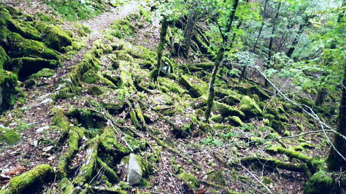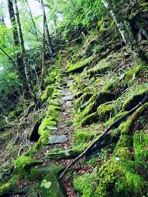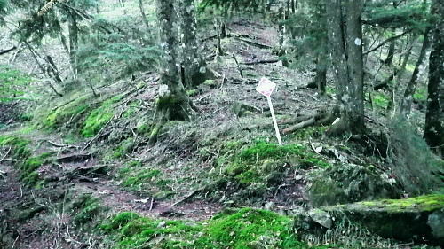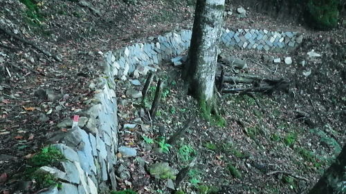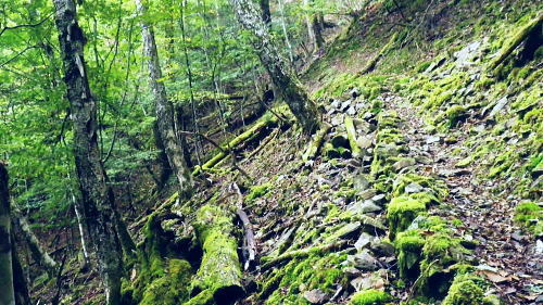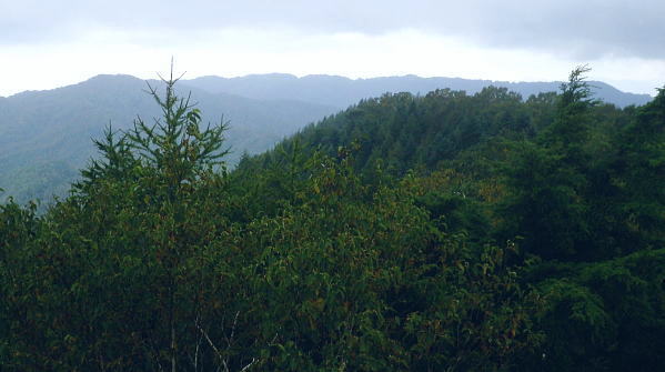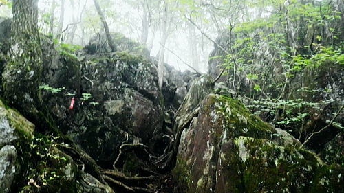 | 大菩薩連嶺最北の山・・黒川鶏冠山 柳沢「ブナの森」から濃霧一色に変わった黒川見晴台.その南北の管理道から黒川山・鶏冠山を越え.ハンノキ尾根伝いに高橋落合へ 柳沢峠から黒川山南面の管理道にでて黒川鶏冠山肩 黒川山と鶏冠山.奥社から北面管理道を経てハンノキ尾根を下り落合・・鶏冠神社奥社と「源水館」 百年の森から伝通院を越え下大ダワ経て境界尾根の墨川鶏冠山 北上し倉掛山に立ち西側の峠沢中間尾根の旧々作業道から笛吹川峠沢橋 霞む大菩薩嶺 黒川山見晴台より.13:17ガスの掛かる左は北尾根.谷間中央の薄く霞むのがエンマ御殿尾根 鶏冠山分岐一13:07展望台一13:24黒川山.一13:36鶏冠山.⇔展望台と13:24黒川山.⇔13:36鶏冠山. 鶏冠山分岐一14:23ハンノキ尾根.巡視路.横山峠分岐一15:11青梅街道一15:16落合.「源水館」h. 黒川山 鶏冠神社.落合集落.新横手山峠.柳沢峠.黒川金山跡の4方向を示す鶏冠神社の分岐には2つの道標が交わり.林班界標柱が立つ。 ここで小さな小学生の親子連れに出会っている。見晴台の様子を尋ねるも.やはり展望は微妙な眺めらしい。 答えずらく「傍なので出向いては!」と言葉が返ってきた。感謝して南側の脇道から見晴台分岐にでることにした。 分岐にでると道標に「鶏冠山(黒川山)」と記してあり.鞍部からUターンするよう黒川山に向かっている。 直ぐ上の高みに三角点標石が立つも何も示されず.藪絡みの小さなコブと云うより場所で.霞み展望はかった。 又見晴台の道標を安易に確認せず先に進みむと下りだし.慌てて初めの分岐に戻っている。 確りした監視路の山径で.尾根筋を進む先に見晴台がある。霞みが強いが奥秩父主稜の大パノラマが朧に初めて眺められる。 倉掛山から笠取山へと連なる奥秩父の頂稜 笠取山から唐松尾山.御殿岩木賊山と藤尾山 右景・・以前中央の鞍部は新犬切峠と犬切峠.手前の出合.一之瀬林道寄りに鶏冠神社の里宮がある 下を横切るのが国道411号.青梅街道.大菩薩ライン。中央左のコブが伝通院. 東に延びる尾根末端の下端の窪溝から入り込み.中間の尾根から頂の南側に回り込んでいる。 天狗棚山(藤尾山) 左景アップ左下の河原が落合で.その左脇の尾根が明日登る墨川山東尾根の末端 桶岩という岩の露岩した見晴台より. 東側を除く大展望が得られる筈だが.やはり霞み強くおぼろの情景だった。 下部に横たわるハンノ木尾根末端が高橋地区落合.柳沢川対岸が墨川山東尾根の末端になり.詰めれば頂.伝通院にでる。 左側の谷間縁にあるのが落合で.宿る旅館「源水館」が建つ。 黒川山々頂 ちょっと戻り「黒川山」.三等三角点標石1710.1m.13:24見晴台分岐に戻ると直ぐ尾根筋の左道脇上にある三角点峰の黒川山(鶏冠山)に立ち寄っている。 見晴台の帰路.仄かな高みと思えたコブ。踏み跡は高みの脇を抜けてをり.予備知識がなければ通り過ぎてしまうだろう。 頂は質素で山らしき雰囲気もないただの高み゙と云う感じだった。 鶏冠山への岩場道へ 鶏冠神社分岐に戻り東方へ.13:32黒川山の小岩峰 この小岩峰に鶏冠神社が祀られていた。岩峰の左脇から回り込むと小岩峰の西峰1700mの裏側(北側)にでられる。 黒川鶏冠山 鶏冠神社奥社.13:36鶏冠山 鶏冠神社の分岐に戻り.北側の小さな岩場の溝を攀じり.細く奥に連なる小岩峰を左から北側へ巻き込んだ岩上の鶏冠山東峰に立つ。 鶏冠山は黒川山から北東に向かい10分ほどの距離。 鶏冠山と云う名は丹波川方面から仰ぐと熱変成を受けた砂岩からなる露岩で鶏のトサカのよう見えることから呼ばれている。 厳頭に祀られられた鶏冠神社は犬切峠の南側の裾野に祭られた一ノ瀬高橋の鶏冠神社の奥宮に当り.絶壁を隔て丹波山村方面を剥いている。 展望よく飛竜岳.雲取山方面の山並が一望される筈だが.先程から全てががガスに隠され.足元の谷底さえ覗き込めなかった。 朝方の晴天は何処へ行ったのだろう。おぼろ過ぎる展望に.もう全てを諦めている。雨が降らなければ儲けものと考えるのみ。 又鶏冠山は多摩川水源の山であると同時に.大菩薩連嶺最北に聳える頂で.鶏冠山から笹子峠まのほぼ南北に連なる長い大菩薩連嶺。 甲斐の国中と郡内の分水嶺をなし.朝方の六本木峠まで戻り丸川峠へと南下して.大菩薩嶺から小金沢連嶺を越え.更に黒岳大谷ケ丸へと南下する。 笹子御殿を越えれば笹子峠.先は御坂山地に繋がれている。今回はこのままで落合に下り.明日は笠取山から南下する県界尾根に乗る予定でいる。 黒川山北面の管理路を辿る 林班界標柱が立つ尾根.13:53横手山峠から南側を巻く管理道を登り詰め.黒川山に立っている。下山ルートも同じく.地形図では北側を巻く破線路が描かれていた。 ただ共に苔むしる沢を抱きながら横手山峠からの南斜面の山径に比べ.北面は薄暗く少し陰惨な漂いを示していた。対照的な管理道に思えた。 柳沢川の金場沢の源流沿い北側の水平歩道が巻きながら進むと上写真の黒川山から延びる北尾根の尖っ突き地点にでた。 背は陰を好むコメツガ林で.トラバースの山腹道を刻むルート。