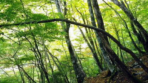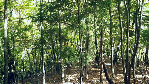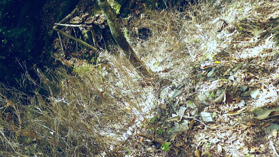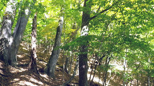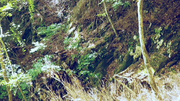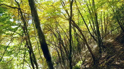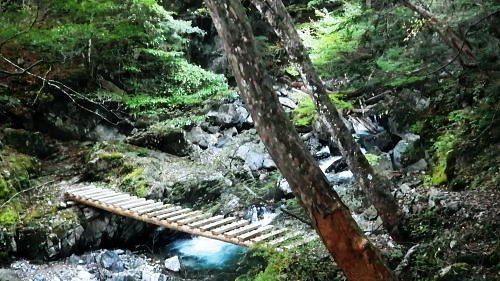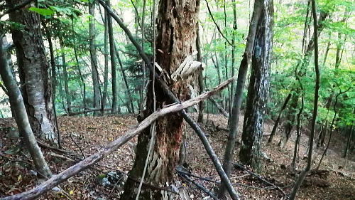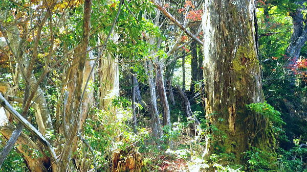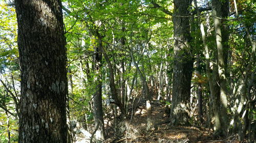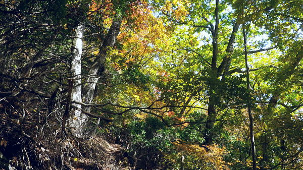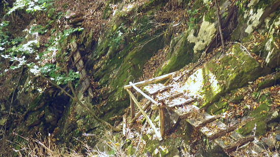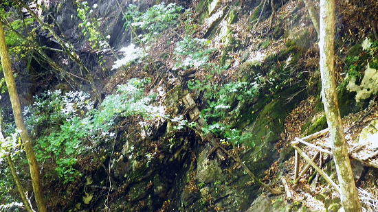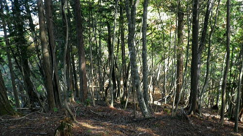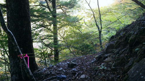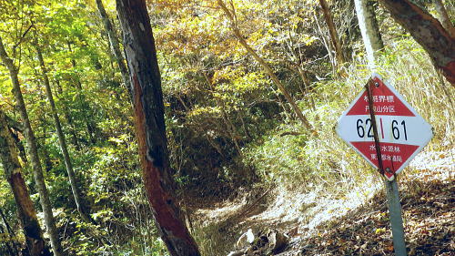 | 小室川左岸の支流中沢左俣の桟橋の大崩壊地を訪れるが? ・・大菩薩嶺北尾根周辺Top 北尾根三ノタルから大菩薩丹波道への分水嶺にでられず。その手前.小室川左岸の支流で桟橋が大崩壊して.北尾根に戻っている 三ノタルから北尾根の小室川左岸道を経て尾根末端へ・・泉水横手山林道・青梅街道と再び丹波に至る。言葉を変えれば強制トレーニンクか? 柳沢峠.六本木峠.石庭峠から牛首谷へ エンマ御殿から泉水十文字を経て丸川峠.泊 大黒茂谷を探索し.大菩薩嶺北尾根三ノタル 続く中沢の桟道は崩壊・・戻り北尾根左岸道.林道.青梅街道から丹波・・懐かしい車庫バス停と路線の猛禽類 北尾根三ノタルを越え 小室川分岐への径.10:3510:27大菩薩嶺北尾根三ノタル11:46⇔11:00中川の桟橋崩壊現場 三ノタル一12:37アセビ一13:12小室川左岸道一13:31高巻き地点一13:50泉水谷出合木橋一13:58泉水横手山林道 一14:20青梅街道.三条新橋一15:22丹波bs:35. 三ノタルの小室川側は南面に明るく開かれた急斜面を゙グザグに大きく切り.1450m付近から山腹道は水平歩道に変わる。 水源巡視路は明るい日差しに恵まれ.中沢右俣右岸の斜面を長く横切っている。 中沢右俣の枝沢.10:42 東尾根の尖ッ突き地点.10:51北尾根1708mコブから延びる東尾根の尖ッ突きに「丹波62-61」林班界標柱が立つ。 又この尾根末端は小室川本流近くで中沢の二俣に没していた。 小室川支流中沢流域の西面を綴る 中沢左俣の最初(上部)の桟橋は通過.10:57小室川左岸の支流中沢左俣の桟橋が幾つも崩壊 哀れな長い桟道の崩壊現場.10:59 無言で見詰めている以外なかった小菅川に届かず.右岸の巡視路は今回も諦めざる得なかった。 2013年11月.小室川から登った崩壊前の桟道崩壊した桟道 一昨年の後半のルートを埋めるべく.ノーメダワを越え小菅川の左岸水平歩道に入り下山する予定でいた。 ただ中沢左俣で桟道の大崩壊があり.小室川を目の前にいて届かず。小室川まで後15分ほどの距離が縮まらなかった。 長い桟道は崖下深い谷間で底は露岩帯になっていたのは憶えているが.改めて反対側から望むと 岩壁を埋める足元の側壁には幾つもの深い窪溝が刻まれ.その中に突き出した大小の起伏の上に桟道の土台らしき基部が覗められる。 桟橋は木材から見て.手前から徐々に古い橋に変わり.崩壊し崩れ落ちていた。迂回するルートを探るも. 長く崩壊した桟道地点では甚だ難しい。仰ぐ斜面が壁を築いている。進めねば戻るのみ.まず一本取る。 再び三ノタルまで戻り.復路は急遽.北尾根を迂回し.下流の小室川左岸道を経て泉水谷へ下山するか? 末端にでるか? 下山すれば丹波まで歩むことになる。今回は順調に予定通り.大黒茂谷分岐まで下っていた。 小菅川までは前回のルートを綴る積りでいたが今回も諦めざる得なくなっていた。 後で思うに崩壊現場を見たことで下山ばかり考え.頂に登る発想が浮かばなかったことが残念だった。 山越えの先を考える以前の大事な事柄が消え伏せている。又桟橋の崩壊は規模からみて恐らく改修の見込みは希望できないだろう。 もし実行されたとしても長い年月が必要になろう。 三ノタルに戻る径 逆ルート. 見た目の違いが異なる風景に.11:33 異なる風景2・・11:42再び北尾根三ノタル 四度目の三ノタルに戻り.北尾根に迂回する.11:46三ノタルに再び戻り.北尾根を下る。もう諦めてはいるが迂回して小室川左岸尾根に入るにも.其のまま末端まで出るにしろ, 最後に丹波まで林道.街道の長いアプローチ・強制トレーニングが待っている。その上.午後2本のバス.18時20分発最終バスを待つのは寒く忍びない。 上手く15時20分のバスに乗れれば良いが。下山してから国道歩きは時間との競争になろう。どちらに見積もっても.下山は最悪のルートになった。 北尾根秋らしい色彩.11:49鶏冠山大久保尾根と黒川谷 北尾根左手の樹間の切れ目より.12:10右上は石保戸山と藤尾山 1650mラインを越え北東へ下ると鶏冠山の頭が望まれた。残り欲しい紅葉の見納めになる。 巨木林を抜け.12:19 幅広くなった雑木帯.12:27石標1337mが立つ 雑木にアセビが密生し始める.12:44 北尾根東面小室川沿いの台地.13:001100m付近で右手の緩やかな尾根に入り.伐採混ざりの斑な雑木帯を少し上流側に斜めに下り始めている。 そして河原近くで古い山腹道を見付け.暫くは沢沿いと並行して下るが高度が次第に高くなったので.歩き易い場所を見付けては下降した。 そして左岸道にでている。 小室川左岸道に降りる.13:12小室川左岸道の通行止地点 上流側が崩壊・・更に高みを巻く.13:31やや高巻き気味にルートは取っていた。10分ほどで小さな起伏が縦に走る硬いザラ地に踏み跡を見付け.小さくジグザグに切り下りている。 そこで本来の新たな左岸道にでる。この上流側は崩壊が激しく.その為かロープが張られ通行止になっていた。更に高い中腹を巻いていたようだった。 後は前回と同様に左岸道を下り.小室川出合を見下ろして泉水谷側の出合に降りている。 泉水谷出合手前 渡った林道よりから.13:51この北尾根の末端の