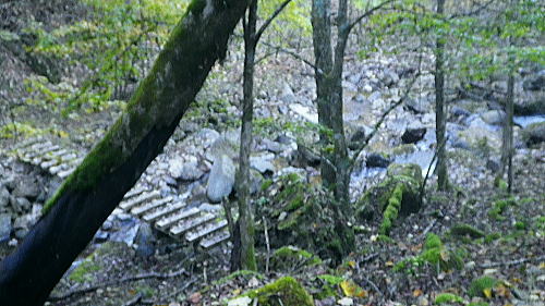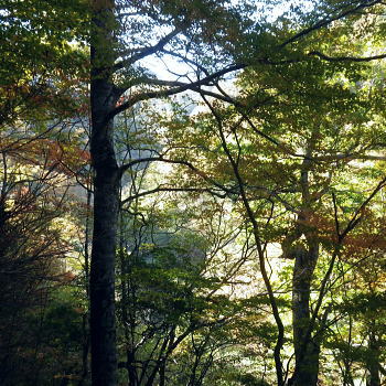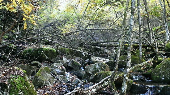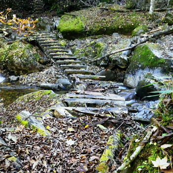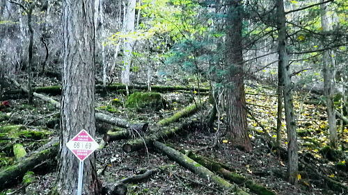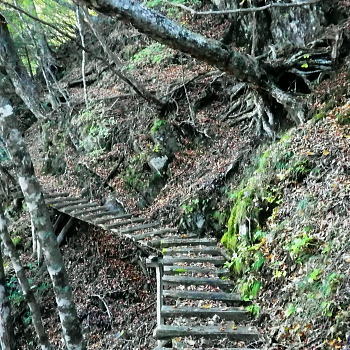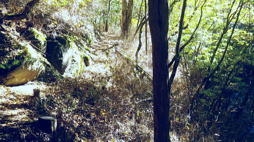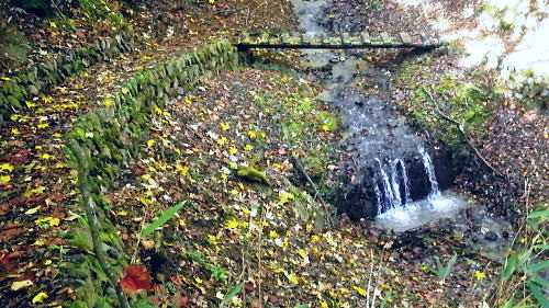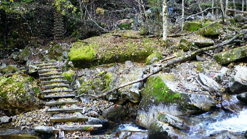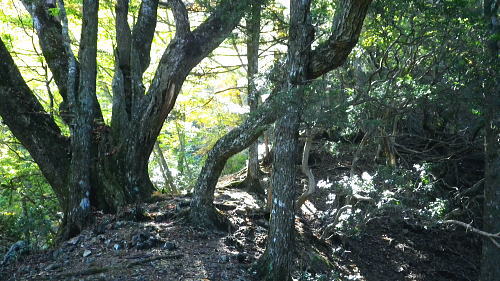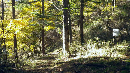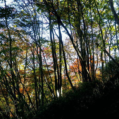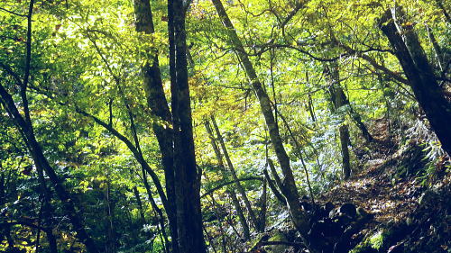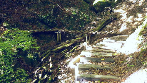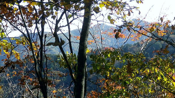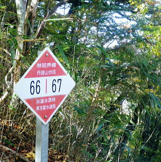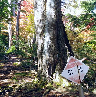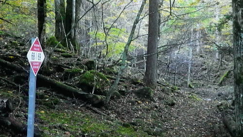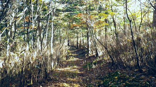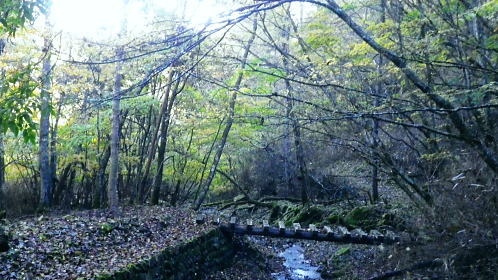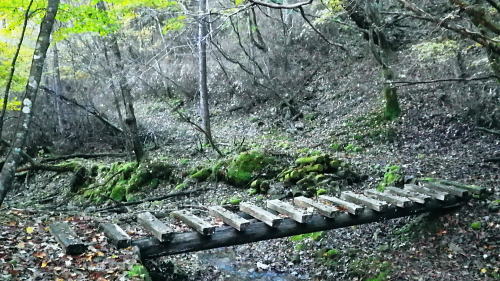 | 大菩薩嶺北面の谷と尾根・小室川左岸の中沢左俣止り・・菩薩嶺北尾根地形ルート図 泉水十文字まで戻り.大黒茂谷を下降し.前回のビバーク後の最終地点を確認し.北尾根三ノタルへ 一昨年のルートに逆行して北尾根の分水嶺を越えると中川左俣の桟橋は崩壊した間々.小菅川に入渓できず諦め戻っている 六本木峠.石庭峠から牛首谷 エンマ御殿から泉水十文字を経て丸川峠 大黒茂谷を探索し大菩薩嶺三ノタル・・2年前の野宿 まだ中沢の桟道は崩壊・左岸道 山行後半・・朝方から再び丹波側の水源林地帯に入り.泉水谷の支流.大黒茂谷から小室川と横切り.小菅川流域の巡視路を綴る予定でいた。 2年前の大黒茂谷の野宿した周辺をを索し.その後は大菩薩嶺北尾根を横切り小室川へ下る積りでいた。それが中沢の桟道は崩壊の間々。 改修されず再び北尾根に戻り.丹波に下っている。紅葉の期待にそぐわぬ.中途半端な山行になる。 牛首谷源流 牛首と十文字との分岐への径.7:1410月18日晴・・大黒茂谷探索と大黒茂林道 丸川峠.丸川荘7:00一7:40泉水十文字一8:03一昨年の 「丹波68/69」地点一8:13木橋.大黒茂谷左岸道一9:00大黒茂谷分岐 一10:03アサガオ尾根「66/67」地点一10:27大菩薩嶺北尾根三ノタル. 昨日はこの処念願だった牛首周辺の頂に立ち.今朝は丸川荘からここ泉水十文字に戻り.大黒茂谷流域に入る。一昨年の野宿は何だったのか? 検証はすべく逆方向から探ることになる。更に当時歩けなかった小菅川右岸歩道に入渓する積りで大黒茂谷を下降した。。 泉水十文字への尾根を末端で越す.7:38枯スズタケも十文字に至れば背丈だけは低いが元気さを取り戻している。 再び朝方を浴びる泉水十文字 大黒茂谷の取付き.7:40この処一週間置きに山に出掛け.足も軽い動きを示している。現金なもので歩め続ければトレーイングも兼ね.よい方向に進んでいる。 秋の早い黄昏に満ちた昨日の泉水十文字とは異なり.朝陽を浴びた.清々しい明るみが渓谷を包み.心持ちわくわくさせ.第一歩を谷間に踏みだした。 今日の昼食は小室川分岐か.水を運んでのノーメダワか。どちらにしようか? 途中で決めることにした。 大黒茂谷本流に下って初めての木橋.7:46手が入り綺麗に整備された作業道 上から2つ目の木橋.7:47幽寂の世界 本流の各支流を横切る.7:52十文字から右に折れると驚くほど立派過ぎる作業道に出会う。刈り払いを必要とせぬ確り踏み固められた山道が綴られていた。 狐に包まれたような.迷うことのない小道で.右俣本流の右岸沿いの枝沢を幾つも横切っている。 当時は大黒茂谷分岐から学校尾根右尾根を詰め.大黒茂谷に下りて最初の沢沿いで道を失っていた。探ると都度.踏み跡は見付けているが。 今日の山道は余りにも良過ぎていた。当時では考えられぬ行程になる。経路と云うより分かりずらい踏み跡で.それに黄昏が迫っていた。 今回は全てが逆の環境とコース. 朝方の山陰で閉ざされていた大黒茂谷に陽光が差しだすと朝方沢面も明るさを生んでいる。 そして何より作業道は過剰に整備されていた。丸川峠から休まず.アッという間に前回の迷った最終地点に出てしまっている。 幽谷の地 東寄り枝沢左岸より右岸を見る.7:56「丹波68/69」林班界標のある谷の1つ西側のカレ沢 問題の沢 問題になったのはここ下流側1本手前の対岸の沢。踏み込み易い所を選んで.沢を横切れば呆れるほど真近に現れた。 枝沢の右岸.対岸までの沢でなく.渡り終えた先の小尾根の横断すればよく.前回は日没で黄昏が迫り.足元はおぼつかないほど暗くなっていた。 又全体的な地形では正しかった筈が.歩き難い足元を中心に見詰め向かいの沢に惑わされている。 全体を見て強引に進めばよかったようだ。呆気なく解決してしまった気がする。 枝沢を渡って右岸より左岸を見る対岸の中央少し左側の立木にぶる下がるピンクのリボンがよく見えた。それが分からず下流に探し求めていた。 それにしてもここまで整備されると.この1.2年で水源林巡視路の改修工事は驚くほど進んでいる。 北側には西側右俣への本流が流れている.8:05前回の野宿 距離は短いがやはり右岸沿いに整理された作業道があるのが判る。前回もこの途切れる処までは判っていた。 途切れた作業道を直進し.そこから対岸を横切り.左側にルートを求めればよかった。 作業道の右手.対岸(本流)に踏み跡を見付け.黄昏時でもあり入ってしまったのが先を難しくしていた。 翌日.入渓時のルートに再び戻り確認している。そこで迷う。初冬の谷間は早い日没を迎えていた。 そして進む先を諦め日没を迎えるも.エレキを頼りに大黒茂谷左岸道を下れば林道から国道へ出られると考えていた。 ただ木橋脇の1ケ所の笹藪.そこで自分の踏み跡に惑わされ.エレキでは分からぬ迷い陥っている。そして全て諦め野宿した。 1500m付近の「丹波68/69」林班界標今回逆ルートを選び.この地点で前回の13年11月に迷い.野宿したルートと繋がった。 大菩薩嶺北西尾根末端 前回の最終確認地点と繋がる.8:03野宿した翌日はここ林班