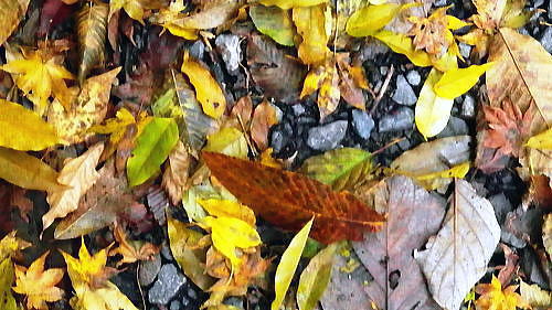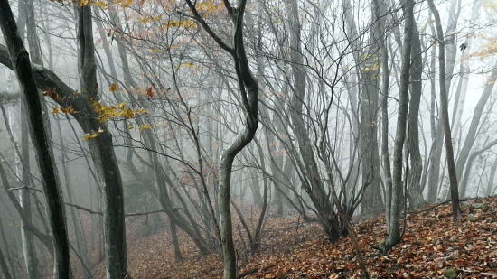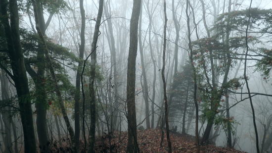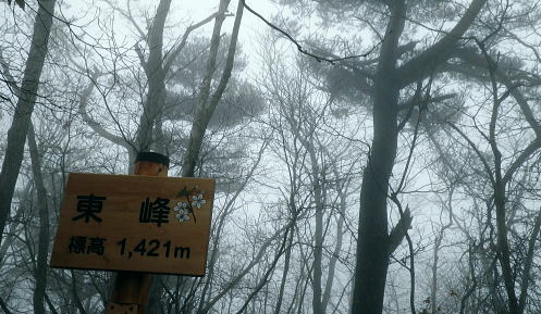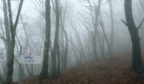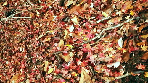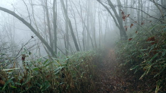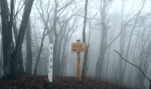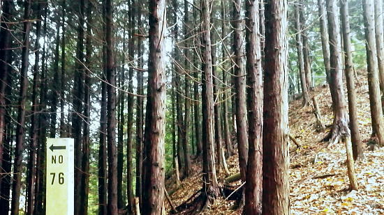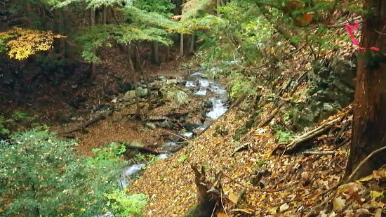 | 大菩薩連嶺. 里は登り.下り共に紅葉に満ち.山上は冬木の世界。南大菩薩のオッ立とお坊山東峰南尾根・・大鹿川流域絵図 桂川笹子川北岸流域 笹子川左岸中流に係る2つの南尾根. オッ立南尾根からお坊山東峰南尾根. 朧に霞む天候と途切れた日差しが里に下り.再び照り付けた日差しが.高度差が低い割に晩秋と初冬との重なり合う風情を創り出していた。 すすみ沢の鉄塔巡視路からオッ立南尾根に立ち.霧雨舞う幻想的な世界から大鹿峠へ。お坊山東峰南尾根で里へ下ると再び紅葉に飾り立てられた。 2015年11月12日.松村 すみ沢からオッ立南尾根を経てお坊山東峰・・朝方は冷雨と幻想的な風景 冬木の東峰を横断し南尾根を下降 先月は大菩薩連嶺の最北の丹波に入ったばかりだが月を改めて.今回は大菩薩連稜.最南端に位置する御坂山地との境い流域に入る。 笹子川すみ沢の鮮やかな紅葉も終わりに近づく鉄塔巡視路からオッ立南尾根に取り付いた。 頂稜に出る途中までは紅葉美に飾り立てられた露払いの踏み跡道だった。林道脇の崩れた旧道を歩む。 山に入ると好天の予報は外れ.直登の幻想的な冬木のオッ立南尾根に触れている。すみ沢の源流を取り囲む尾根を綴り.お坊山東峰に回り込む。 東峰は霞み沸き立つ濃霧に包まれた世界で.体中何処もがジッとしているだけで濡れてしまう頂だった。霧粒の細かく湧き上がりは雨粒に変わり. 軍手は替えているだけでも塗れてしまう始末。5年前の師走に味わった華麗な晩秋の台地は何処に行ってしまったのか? お坊山東峰南東尾根から公団線4号鉄塔を気勢を上げ下りている。.深い落葉を蹴り踏んでもいた。 今回はその西隣りの入道山南支尾根を下る積りでいた。それを変更し.下山に初めて東峰南尾根を選び.笹子川に下りている。 再び紅葉に飾り立てられた晩秋の里に下りていた。中央東線の笹子駅から直接周回するコース。 麓の華麗な紅葉美から冬木覆う裸木の世界に入り.途中で濃霧が湧く灰色に絡む台地から頂にでていた。 又里の笹子川南岸にある「笹一酒造」には下山の折に何度か.洗顔させて頂き身仕度を整えさせて頂いたことがある。 新酒祭の噂は聞いてから久しく.改めて今回は騒々しいだろうが寄ってみようかとも思っていた。 吉久保地区 甲州街道を初狩方面に戻る.7:53街道から左岸の河川丘陵 空は重い雨雲に覆われ.吉久保集落に入るも晩秋の明るい朝の日差しを浴びたのは入渓したひと時だけだった。 初狩方面に向かう甲州街道からは右上に巨大な葛野川線27号鉄塔と中央に横切る小さい鉄塔群のjr大月-勝沼線鉄塔が見上げられていた。 11月12日(木).霧雨.下山して曇 jr御徒町5:00=5:06東京:11=6:21高尾:21=7:05大月:21=7:33笹子. 前山行と同じ東京駅5時11分発の列車に乗車し.前回は高尾付近で夜明けを迎えている。 今朝は八王子付近で日の出を迎える筈だったが重い層雲に閉ざされていた。小仏トンネルを潜れば天候が変わるかもと淡い期待をよそに. 電車がトンネルを抜け前道志に入ると更なる厚い雨雲が垂れ込んだ。 何時も見慣れている山々は雨雲の下に隠されていた。 裾野は幾らか風にが切り開かれるも.車窓から望めは回復の兆しは薄い。今朝の予報では昼頃には回復するとのこと。 黄昏を思わす笹子川原.白野付近の送電線群 街道.原付近より左端の北方川右岸尾根に乗るのは霞む葛野川線23号鉄塔。手元の左右に横切る送電線鉄塔はjr大月-勝沼線 オッ立南尾根からお坊山東峰・・景笛駒線・公団笹子線 7:33笹子駅一道証地蔵8:55⇔大蔵大鹿林道. 一9:10すみ沢渡渉一10:04(75号鉄塔)一11:20オッ立:30 一12:00大鹿峠一12:35お坊山東峰:50. 以前,滝子山南尾根から石神に下り大鹿橋にでている。浜立尾根からは道証地蔵に下りてもいる。 今回はすみ沢沿いの更に奥.その逆コースをjr笹子駅から歩む。甲州街道を東に進み吉久保入口バス停から左に折れ集落の中を抜けている。 中央東線のガードを潜り.「笹一酒造」を右に見て三差路を右に入る。稲荷神社の角で街道と分かれてからは左に折れ. 次の三差路で再び左に折る。先は中央高速道を跨る原平橋が架かり渡って桜森林公園にでる。 ここからは過って2度どほどそそり立つ滝子山を見上げていたが.今日は濃いガスの中だった。 大鹿川沿いに遡る。道中連れになった若者と語りながら大鹿橋を渡り.右に市営大鹿林道を分け.県営大蔵沢大鹿林道へ。 それも話に夢中になり.道証地蔵分岐を通り過ぎ.戻る破目にもなっている。 大蔵大鹿林道 落葉に埋まる絨毯の林道.8:30暮秋に彩られた落葉道. この時期ではの東京近郊の山々は枯葉が舞い落ちている 林道路面は色鮮やかに.8:31 語り過ぎ林道を戻る地点より.8:47連れのハイカー・・笹子駅ではそれほど寒くなかった。私を含め4名の単独行者が下車。 山中では大鹿峠付近で2人の男女.単独行と出会っている。そして帰路の列車では笹子駅から乗車は私独りになる。 同じ方向に向かう千葉からのハイカーと途中から語らいながら歩む。若い彼は先日.日帰りで北ア爺ケ岳を登って来たらしい。 柏原