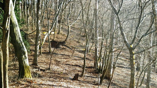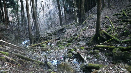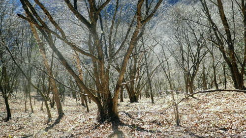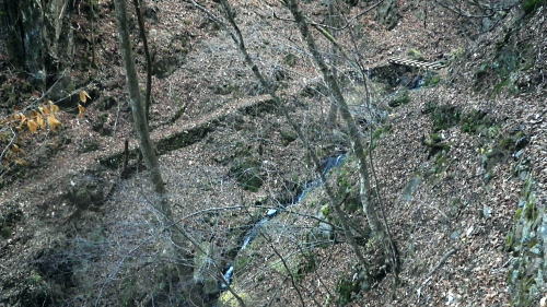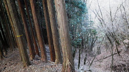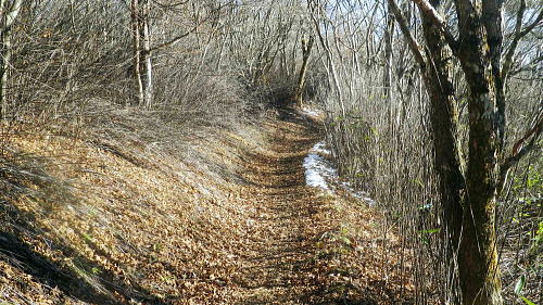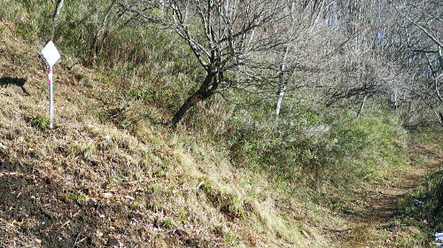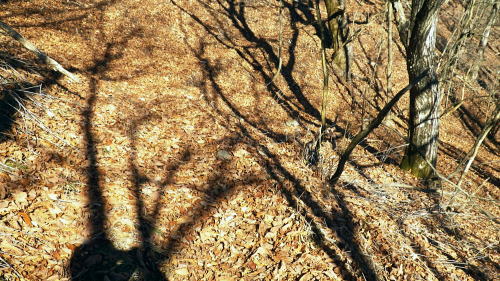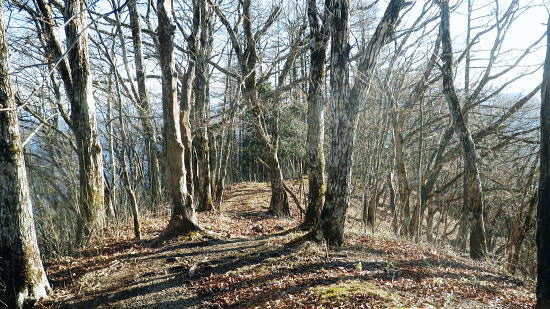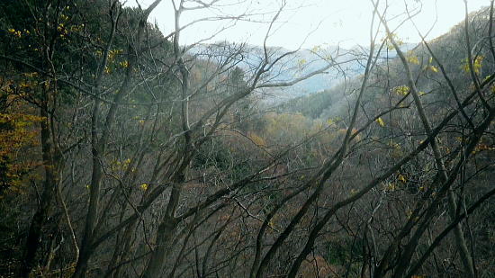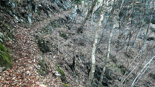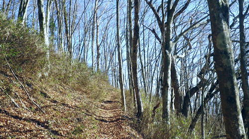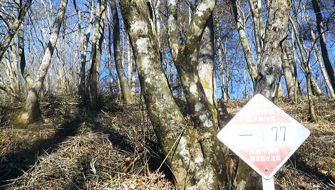 | 奥多摩.水根沢流域 奥多摩の水根沢は水根山1620mの南東面に厳を発し奥多摩湖に注ぐ。「奥多摩」」宮内敏雄緒は「鴨沢以東多摩川に直接会うする河川では. (水根沢は)海沢谷に勝る廊下と急流を持つ。所謂遡行の楽しめる沢である。又この沢は多摩川水系における川海苔の名産地として有名。 本流 2015年11月. 日陰名栗峰ケヤト尾根─鷹ノ巣山南面山腹道から巡視路を通り.榧ノ木尾根から水根沢林道・・水根.奥多摩湖 左岸流域 2020年03月. アシダキ沢右岸尾根から榛ノ木尾山東尾根の上段・中段・下段経路を横切り.榛ノ木尾根の支尾根中腹から境集落 右岸流域 2022年10月. 水根山タカナメ沢右岸尾根と榧ノ木山三本ケヤキ沢右岸尾根とで.水根山榧ノ木尾根の2つの支尾根を繋げる。 2023年11月. 雨降谷左岸尾根を詰め榧ノ木尾根を下り.倉戸山モジリ沢右岸尾根。水根沢下段右岸中腹道からは奥多摩むかし道.境集落 下山のコースタイムを間違えたのか? 今回も日没との競争に陥る。 避難小屋から水平歩道にでて鷹ノ巣山南作業道を巻く―水根山榧ノ木尾根から水根沢林道に入り水根・・日没を奥多摩湖の湖畔で迎え一番星を望む。 日原林道から小コブを越え日陰名栗峰ヤケト尾根 ヤケト尾根.下段経路から高層台地が続き.小藪を抜け日陰名栗峰に立つ カヤトの鷹ノ巣山南側経路から榧木尾根を経て水根沢林道を下り水根から小河内ダム・・日没を奥多摩湖の湖畔で迎える 鷹ノ巣山南面の入奥沢源流斜面.13:17鷹ノ巣山.1651m峰と1650m圏峰. 巳ノ戸谷と奥沢のツメ 鷹ノ巣山と大きく抉られた奥沢のツメ. 昼食を摂った石尾根の台地からは素晴らしい展望が得られるだけでなく.目を停めて眺めれば改めて違った地形の台地が望まれた。 その上頂に立った後半は鷹ノ巣山南山腹の水平歩道を綴っている斜面が手に取るよう眺められていた。林道の起点に至る最後の斜面だろう。 鷹ノ巣山の西肩から中央に広がる防火帯が水根山手前の鞍部へと地肌を現している所がここからも認められた。 前回は鷹ノ巣山々頂の騒々しさから離れ.右肩のそこ場所でコンロを点け昼食を摂っていた。その後は更に榧ノ木尾根から奥沢山腹道に入り. 「奥」の集落へ下っている。手前に見下ろされる入奥沢の沢底へ.ここから対岸へ回り込んだことになる。 1枚のスナップ写真から前回と今回の2つの11月の山行が結び付けるられていた。 長閑な陽溜りの風景を見ながら顧みることができ.よい所で昼食を摂っている。 又「奥」への分岐.その直ぐ下の尾根裏側で再び石尾根の水平歩道に入り.水根沢林道に回り込んでもいた。 南面を巻く巡視路 鷹ノ巣山南面を大きく巻く経路.14:00「奥多摩区分78| 」林班界標 カヤトの鷹ノ巣山南側.水平歩道から水根沢林道 13:54鷹ノ巣山避難小屋一14:29石尾根山腹道分岐一14:40榧ノ木尾根.水根.六ッ石山分岐:55一15:07水根沢林道分岐 一15:56水根沢谷本流木橋一16:35水根の集落一16:55奥多摩湖bs. 浅間尾根を下ると云う彼と鷹ノ巣山避難小屋で別れ.奥沢のツメを横切る斜面を綴る水平歩道を歩む。 今回の後半の目的は防火帯を避け.日溜りの落葉道を林檎を丸齧りながらのんびり歩くことだった。 擦れ違うハイカーとも会わず.唯一人周りを気にせず.眺めてはのんびり歩む。もう黙々と歩む必要もなかった。焦る必要もなく気侭に歩む。 そして水根沢谷に入り.避難小屋から奥多摩湖まで1時間40分? 後に可笑しいと気づく。(2時間20分). 日没前に十分着ける予定が長閑さから焦りへと。今回も最後は里を真近に見て日没との競争になってしまっている。 ブナの小木林と紺碧の空小径を綴る山腹道. 灌木帯からスズタケ茂る斜面を抜け.落葉松帯に入る。又吹き溜りで見る落葉の影絵。 スズタケだけの穴倉のような径も面白い。ブナ林が現れれば水平歩道から石尾根への分岐にでる。 日溜りの落葉径と影絵.14:04 14:11 奥沢源流のツメを見下ろす.14:14 水根山手前の防火帯と南山腹道との接点.14:2315m離れればで石尾根縦走路に出られる スズタケの小径.14:24 防火帯と並行するブナ林の小径.14:27「奥多摩分岐─/77」林班界標 榧ノ木尾根分岐.14:59水根山(金左ノ頭)620mの西側山腹を巻き終えると石尾根縦走路と榧ノ木山への分岐にでる。 裸林に被われた榧ノ木尾根 道標の南側正面からの榧ノ木尾根 14:32 1651mの小コブ付近の落葉松林.14:34 奥沢中腹道分岐から少し下った所にある道標.14:421651mの小コブ付近の落葉松林の中央を抜けて.7分ほど下ると奥沢への山腹道に入る分岐にでる。 ここには切り落とされた腕木の道標があり.脇はトラロープで閉鎖されていた。 今月上旬に奥沢中腹道に入り.丁度同じくらいの時間に.この尾根と分かれ下っていた。 紅葉はやや微妙に早かったが.歩む先々は華麗に色ずむ渓谷美と大地に覆われていた。今は見渡す限りの裸木林になっている。 又この道標には「←石尾根.倉戸山.熱海→」とあるだけで私の下る水根沢林道への矢印は示されていなかった。 直ぐ先で「奥多摩分岐76/77」林班界標柱を今度は奥沢側を背に見ている。そして数分で470m圏コ