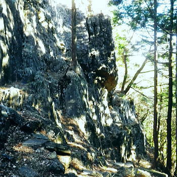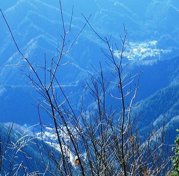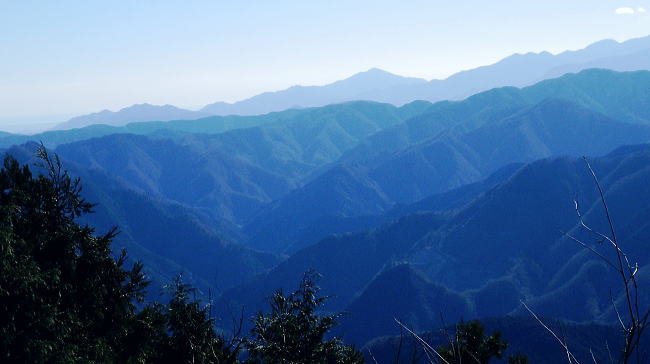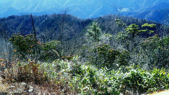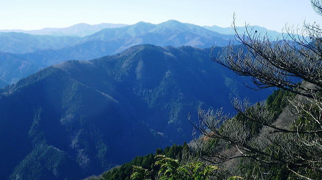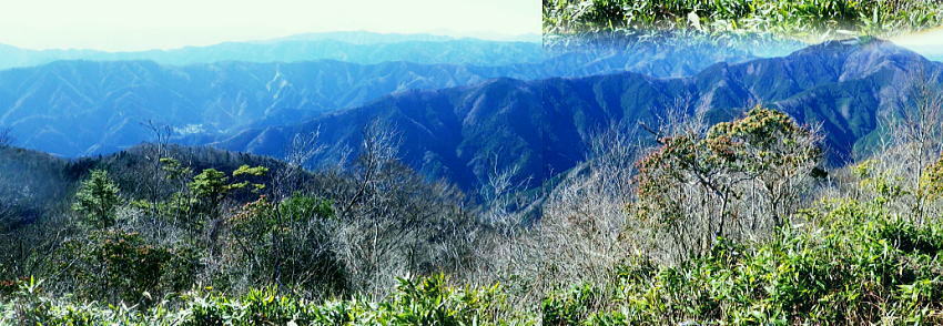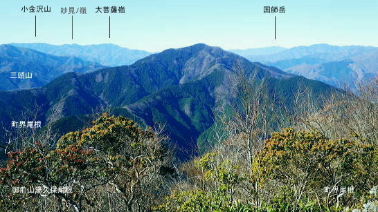 | 養沢川大岳沢を取り囲む尾根U・・大岳山南尾根.馬頭刈尾根.西側の916m点峰から東側の916m点峰まで出向き.戻って下山する。 大展望の大岳山から直接南尾根から馬頭刈尾根に乗る。大怒田山.つづら岩を経て東側の916m点峰に立ち.西峰から里へと三ッ合鍾乳洞に下る 大岳沢から大岳山御坂尾根 南尾根から馬頭刈尾根.東側の916m点峰から戻る・・2つの916m点峰と縦走路の南北に望む大展望 西側の916m点峰北東支尾根を下り末端の430n圏から三ッ合鍾乳洞 奥秩父連峰東部 頂からの右景・・御前山の肩越え.11:13見えぬ笠取山.唐松尾山に飛龍山.三ッ山。右端上は雲取山石尾根 大岳山の頂に立つと秀麗たる富嶽を中央に迎え.南から南東に掛けての広大な山並が重なり合い.波の連なる台地が開かれる。 何時もは隣りの雄大に聳える御前山に目が奪まれるものの.今日ばかりは足元に広がる馬頭刈尾根の長大な尾根が先に目に入っている。 それにしても何時まで見ても飽きることのない大展望台が開かれていた。 左奥は奥秩父.国師ケ岳 中央が奥多摩湖を隔てた榧ノ木尾根.戸倉山・・正面が戸倉.隠れた左下が女ノ湯.左手前の北側斜面はシゲクラ沢右岸尾根? 予報通り表日本は冬型の晴天に恵まれる。ただ気象庁によると登山の条件ランクでは平均10m/秒以上の風力があり.Bにランクされていた。 その為か平日であり.山頂で3組のハイカーと単独は私を含め2人.馬頭刈尾根では2人の単独行者に擦れ違っている。 猛暑に訪れた時以外は常に人で溢れる人気のある山頂.それでも今日は私にとっては多いハイカーと出会っている。 頂で休むも無風に近い風. 頭上を跨る旅客機はジュラルミンの機体を銀色に煌めかせている。 ただ珍しく飛行機雲は見られなかった。高い天空も今日は凪で風がないようだ。 御前山 中景・・左上が三頭山・乗るのが小金沢連嶺奥多摩三山・・左肩が三頭山.写真中央が町界尾根に乗る御前山. カメラを構えている場所が大岳山。 頂から左に延びる尾根が御前山湯久保尾根。尾根を直進すれば藤倉へ。尾根末端まで下れは宮ケ谷戸にでる。右尾根はシダクラ沢右岸尾根. 御前山手前のコブがクロノ尾山.左下に延びるのがクロノ尾山中尾根になる。右手は少し下って鞘口山九重山江戸小屋尾根.手前が大岳山への境界尾根。 御前山湯久保尾根 左景中央が仏石ノ頭1019.2m 展望 中央に横たわるのが湯久保尾根と尾根末端に重なるようチラッと見えるのが裏側に並行する尾根通し.尾根通し末端上は北秋川沿いの小岩地区。 3年前の1月.丁度新雪に見舞われ湯久保尾根と重なる裏側.中央に見える尾根通しを末端まで下り小岩の集落にでている。 当時は全てが銀世界に覆われトレースを築き北秋山街道で乗客0の路線バスに拾われていた。 又白く切り開かれた小岩地区を囲むよう背に延びるのが浅間尾根。奥側右上が浅間嶺903mが聳える。 更に奥に並行するのが笹尾根で土俵山1005.2mが中央近くに認められ.その奥に連なるのが権現山稜。 手前真近に見え過ぎるのが大岳山南尾根で馬頭刈尾根と繋がる藪斜面。 大岳山を源となし南東に流水する養沢川と北秋川神戸川の分水嶺を成し.北秋川出合付近に没するのが馬頭刈尾根。 小岩集落を囲むよう浅間尾根が乗る。 更に見上げる遠望.11:14手前の足元が馬頭刈尾根 右下に湯久保尾根の末端が見下ろされる。その裏側に尾根通がチラッと突き出しているのが分る。里は小岩の集落. 小岩の集落を背負うのが浅間尾根と笹尾根. 右上は延びるのは権現山稜。左上は遠く丹沢山地の大室山甲相尾根。 中央は聳えるのは道志山地の主稜・御正体山。浅間尾根は・・松生山とその麓の小岩.浅間嶺.ムケシノ頭.人里峠.三本松 更右上にアップ.富嶽の東麓更に天真近に聳えるのが御正体山と鹿留山・杓子山. 御正体山の頂は周りには樹林が育ち展望はない。山陰の裏側が山中湖になる。 鹿留山の頂は巨木林に囲まれたミズナラの森. 杓子山空の展望は雄大.それ一つに尽きる富士の姿を真向かいに仰ぐ。 足元からはストレートに広がる裾野は広大な原野を足元に迎え.圧巻する展望の優れさに驚かされている。 浅間尾根の東方 左下のアップ.松生山と小岩の集落浅間尾根・・払沢ノ頭.天領山.松生山.浅間嶺。手前は馬頭刈尾根.背は笹尾根の浅間峠. これから綴る大岳山馬頭刈尾根の全容 浅間尾根の伐採地より浅間尾根を東進し.浅間嶺東峰の展望台手前の伐採地から北秋川を隔てての眺め・・2018.02.14/11:56 馬頭刈尾根の後半は翌19年の師走に繋ぎ.馬頭刈山末端の泉沢尾根まで下りている。 大岳山馬頭刈尾根と浅間尾根の南面 軍荼利山西峰直ぐ下の伐採地より真北を望む大ツイジ北面の熊倉沢流域の北尾根.千ケ尾沢右岸尾根から長尾尾根を下った時の上部伐採地からの展望・・2016.08.26/12:54 大岳山馬頭刈尾根の北面 篠八窪尾根の404m点峰より・・2021.12.05/8:16右下は檜原街道が通る十里木地区. 背の右端はグミ尾根から市界尾根の梅野木峠付近を越える送電線の新秩父線9号鉄塔と新所沢線7号鉄塔。 大岳山南尾根と始まる馬頭刈尾根の