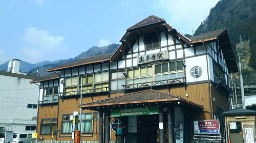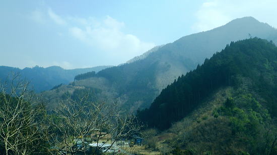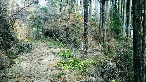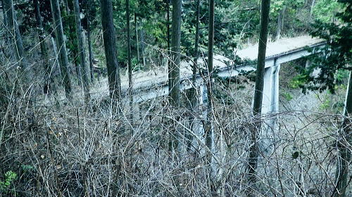 | 境集落から「奥多摩むかし道」と登計トレイル・南氷川 小中沢を取り囲む尾根を周回し.橋詰に戻り多摩川左岸道を綴る。「奥多摩むかし道」の後半は奥多摩湖.水根集落〜境集落. 小中沢左岸尾根・城・三ノ木戸から小中沢下段径路 小中沢右岸尾根・榛ノ木尾根.沖ノ指山とイソツネ山 境集落から奥多摩むかし道・・桧村.廃路線交差.羽黒三田神社.jr奥多摩駅 境の集落 山壁にへばり付く集落.13:38「奥多摩むかし道」 「奥多摩むかし道」は旧青梅街道の一部分。氷川から小河内ダムの北にある水根まで至る旧道で,今は里道のハイキングコース。 この街道は小菅から旧大菩薩峠を越える甲州に至る甲州裏街道で.甲州街道より8kmほど近道になるようだ。 現在の青梅街道は柳沢峠越えをし甲府に至る街道として明治11年に開通した。 昔.小河内の生活は塩山との交易で支えられ.小菅川源流の大菩薩丹波道の荷渡し場で無人の物々交換が行われていた。 その後.小河内の物産は氷川への厳しい山道(14km)を避け.歩き易い五日市(20km)に運ばれるようなり.生活道に変わっている。 岫沢(きぎさわ)から風張峠にでて.浅間尾根を通り.本宿或いは嫁取り坂から五日市に向かい通うようなった。 明治32年に小河内と氷川間が割と平坦な山腹を通る道に改修され.10kmに短縮されている。 交易は氷川へと変わると交通の便がよくなり.以降は漆くいとして使われる石灰等と共に.木炭の生産が飛躍的に増加している。 その後も街道は改修され.生活道になったのが大正から昭和初期に入ってからだった。 昭和13年.氷川〜西久保間に小河内ダム建設資材運送線用道が造られ.昭和20年に一般道として開放された。現在に国道411号線になっている。 又「奥多摩むかし道」と並行して造られた奥多摩水沢貨物線はダム完成後は廃線になり.今は奥多摩工業に譲渡されている。 鉄橋.トンネル.レール等はその間々保存され.機関車等は所内に安置されている。・・奥多摩湖と水沢貨物線 九竜山と680m点 右下の柵下の谷間に境橋が架かる.13:19左側が山ビコ尾根 奥多摩むかし道 13:23境集落:38一13:43小中沢橋一14:17槐木一14:21アシ沢の鉄橋一14:32隧道2つ目一14:44jr奥多摩駅. 旧奥多摩水沢貨物線 境の集落上部に掛かる廃線の橋桁.13:25境から榛ノ木尾根に取付くには.この巨大なガーター橋の第四境橋梁の橋桁下を潜る 境集落東端.むかし道「通行止」.13:38シャツに防寒具の姿,境の集落に入り.動きが少なくなったせいか中途半端な陽気。加え着をすれば済むことだが歩めば暑くなる。 中途半端な陽気に。加え着をすれば済むことだが歩めば丁度よく.歩けば暑くなる。それでも峰から隣りの檜村へ至るむかし道は. 山陰に掛かり木洩れ日も少なく.微々たる風がやや肌寒かっつた。 境集落の北端200mはガラ場の崩壊でむかし道は「通行止め」と標識ポールで閉鎖されていた。 「通行止め」の標識を見て.立ち停まること20分。 戻り.旧青梅街道の1つ下の道.「境の清泉」の所で洗顔し帰りの身仕度を整え.境バス停からの乗車も考えたが如何にしても時間が早過ぎる。 漸く住民を探し当て.「通行止め!」を尋ねると「気にすることはない!」との返事。道路通行止とあれば無視すればよいと。 雑な標識のようだった。巻き道があれば奥多摩駅まで歩く積りでいた。それではと標識を無視し先へと歩む。 680m点と重なる九竜山(江戸小屋山尾根) 左下は対岸の境渓谷キャンプ場.13:41右側多摩川沿いに連なる山並は九竜山954nから派生する西側の支尾根。乗れば680m点から北北西に延びる山ビコ尾根がある。 尾根の末端を回り込むように多摩川の沢筋は極端なU字を描き回り込んでいた。その先端奥が小中沢出合になる。 九竜山から左斜め下に落ちる北尾根は東支尾根で井戸入林道を横切り.末端は墓地に入り奥多摩病院脇の青梅街道にでている。 このコースはもう6.7年前に詰めて町界尾根を日ノ出山まで歩み.北尾根からjr御嶽駅に下りている。猛暑に苦しんだ山行だった。 手前左端は朝方歩みだした「城」に至る684m峰からの南東尾根。突き当たる末端縁には青梅街道が綴られ.「むかし道」の接点の橋詰バス停がある。 奥多摩むかし道 通行止めのポールを跨ぎ.まずは朝方入山した橋詰バス停に向かい.多摩川左岸沿いの奥多摩むかし道を歩む。 このコースは地形図を読むと丁度.多摩川境橋から檜村橋までを結ぶ橋詰トンネル間を大きく多摩川の流心が弧を描くよう迂回している。 この辺のむかし道は車の往来はできるものの地元の車以外は殆ど擦れ違う車も見られなかった。 境集落を離れると直ぐ旧道のコンクリートの擁壁に棚穴が掘られた所があり.中に石仏が祀られていた。 旧道の樹間の切れ目から右前方対岸に九竜山.江戸小屋山尾根が望まれる。手前のコブは九竜山から分かれた西尾根だろう。 大尾根を横切るのが鋸林道の支線.井戸入林道で.麓を通るのは小留浦地区になる。 小中沢右岸沿いのむかし道下の伐採風景 最後の1本も切り倒し裸になった跡地.13:42小中沢右岸の伐採 旧道沿いに境集落から分かれ