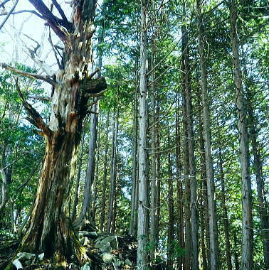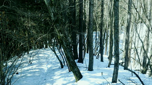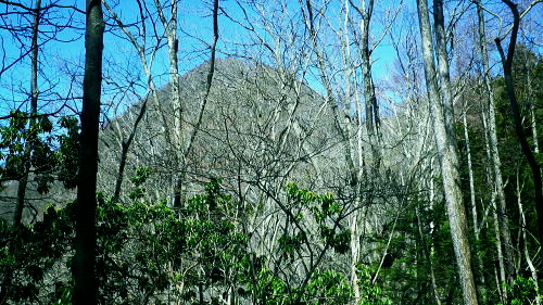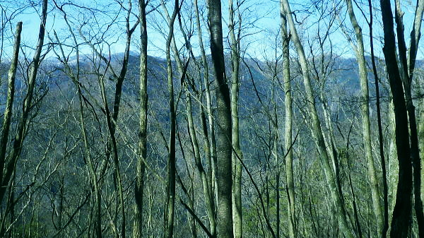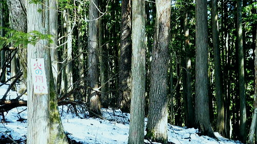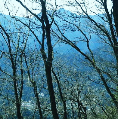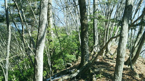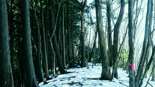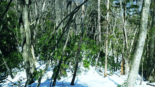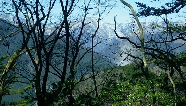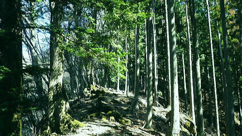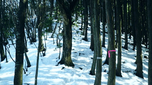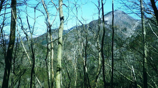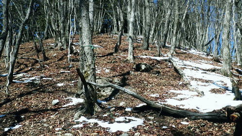 | 春雪に覆われだした権指尾根と残雪のトレースを追う 白丸から根岩越えで権指尾根に乗り.花折戸尾根から高指山に立つ。川乗谷左岸の平石尾根では更に深まる残雪を駆け下りた。 根岩越しマイクロウエーブ760mP 築魔山760mPから本仁田山を経て平石尾根・・ヒオドシチョウ 平石山妙指尾根を南下しjr奥多摩駅 高指山の裏山に並ぶ瘤高山 川苔山鋸尾根V峰より南面を見上げた瘤高山.その奥が本仁田山・・2016.10.06/13:40瘤高山の山陰で望めぬのが本仁田山で.左手が花折戸尾根. 右裏には平岩山尾根が延びる。 本仁田山の登降路としては.以前はゴンザス尾根.花折戸尾根.安寺沢から大休場尾根や平石山へと幾つも選べる尾根が続いていた。 現在ガイドブックなどで紹介されているのは大休場尾根コースのみ。安寺沢から平石山へ出るコースに今は訪れるハイカーは少ないらしい。 根石越えから権指尾根を目指す 築魔山への径.9:51次第に尾根幅が狭まり.林層の境の尾根筋の踏み跡を綴っている。 築魔山権指尾根から大仁田山花折戸尾根.平石尾根 9:45マメイクロウェーブの760m圏小ピーク一10:35花折戸尾根との分岐:40一10:59築魔山一11:46大休場尾根への分岐 一11:56大仁田山12:20一12:23川苔山への分岐一12:57平石山一13:07妙指尾根分岐. 石尾根六ッ石山の中小沢の源流 右上が六ッ石山と狩倉山.9:52再び左側に樹林の切り開きを見る。 背の扇状に広がる展望は六ッ石山榛ノ木尾根で.全貌が姿を現し.手前に覆い被さるのが三ノ木戸山。 2週間前に三ノ木戸から小中沢左岸道を経て.榛ノ木尾根を尾根に入っている。左の伐採された大斜面の跡地がカヤトの原。 当時は沖ノ指山から薄の原にでて昼食を摂りながら.本仁田山の山並を石尾根越えに望んでいた。 奥多摩の中央にありながら関心の薄い山並だった。雰囲気のよい薄の原から三ノ木戸山肩に並ぶ山波を望み.眺める心地よさで次回の山と決めていた。 今その薄の原を再び逆方向から覗き込み.薄の原を取り囲む山並みを見詰めていた。2週間前の山前行を想いだしていた。 重なる手前の三ノ木戸山の北東側に開かれた所は旧峰畑の集落跡。左端に不老林道が綴られているのが見下ろされ.東京農大の演習林施設がある。 後にここも切っ掛けができれば通うことになろう。 本仁田山 ヨチノ沢を隔て.9:59大休場尾根と中央部が817m点P 本仁田山は花折戸尾根との合流点で重なり見えずらいが.直ぐ裏側になる。裏側の頂右側の斜面が花折戸尾根。 ここから眺めると見るかに急登。手前左の大休戸尾根の急坂を下れば日原川の支流.安寺沢に降りられる。 老樹と素直な美林.9:59天祖山とタワ尾根 日原川孫惣谷流域.背は長沢脊稜天祖山尾根とタワ尾根 天祖山の右肩奥が芋ノ木ドッケ.長沢山.滝谷ノ峰.酉谷山. 手前左側から中央に落ちるのが狩倉山山ノ神尾根で.末端は倉沢谷出合に落ちている。東側の尾根に入れば左下の小菅. 階段状の山上集落がある。中段左は山ノ神尾根.右奥は横篶尾根で.末端の東面が白く砕かれているのは石灰石採石場。 奥多摩湖方面から多摩川沿いにヘリコプターの騒音が近ずき.離れて行くのが分かる。仰ぐとそれに変わり高い航路を飛ぶ旅客機が 陽光を反射させ銀色の機体を煌めかせていた。今朝は高層に描かれる飛行機雲の造形はない。 風は弱く少々時期的としての暑さはあるが安定した陽気を示している。 再び痩せ尾根に.10:10天地山と重なる多摩川対岸の鋸岳 登山道右後方の風景.10:12多摩川流域の2つの鋸尾根 ページのTOPnoの瘤高山は多摩川南方の川苔山へ突き上げる鋸岳尾根の4峰から寫していた。・・多摩川北側の鋸尾根. 又足元正面から続く多摩川の麓の集落には.大加沢出合に跨る中庭と大加地区.岸辺には数馬遊歩道がある。 そこから見上げる山並は多摩川を隔てた南画の山並みで.右側に連なるのが多摩川南側の鋸尾根。 緩やかな登りの花折戸尾根分岐 権指尾根と花折戸尾根との分岐.10:39露岩帯のゴンザス尾根を急登で北上すると右後方の南東方面から鳩ノ巣から登って来た花折戸尾根と合わさる。 やや荒れた踏み跡で通うハイカーは少ないようだ。白丸から突き上げる草木沢の源頭に辺り.明るい陽光を浴びていた。 植林は途切れ.一時痩せ尾根気味に.深い灌木の境に狭いに小さな平坦地にでる。 花折戸尾根の由来は尾根筋が鼻のような折れた地形で.過っては鼻折戸尾根と呼べれている。 地名はその土地の履歴を示している場合が多いにも係らず.権力者の力によるものや.美化されて今に至っている。 ヒオドシチョウ 風の遮る陽溜まりに腰を降ろし1本取る。翅表がくすんだオレンジ色をした蝶が南面の乾いた大地に乗る落葉に舞い降りた。 地面の枝屑や落葉に触れるか.触れない距離から跳ねるよう舞い上がり.小刻みにZ字を描き方向を変え.又同じことを繰り返している。 数年前の3月.笹子雁腹摺山の山頂で.同じように動き回る一対のヒオドシチョウを見ている。成虫として過ごす期間が長く. 初夏に成虫として育ったヒオドシチョウは冬越をして.次の春まで生きのび産卵.孵