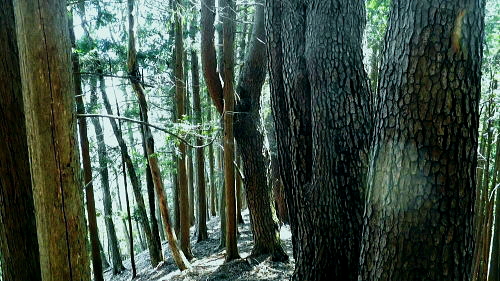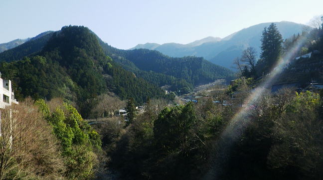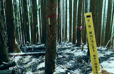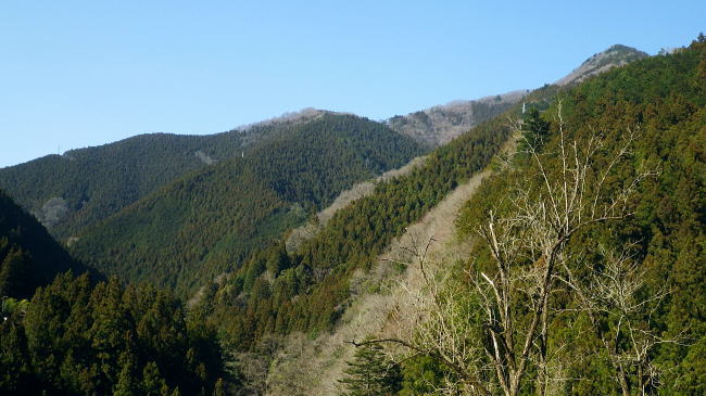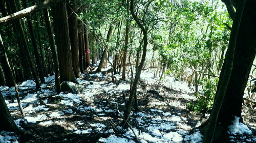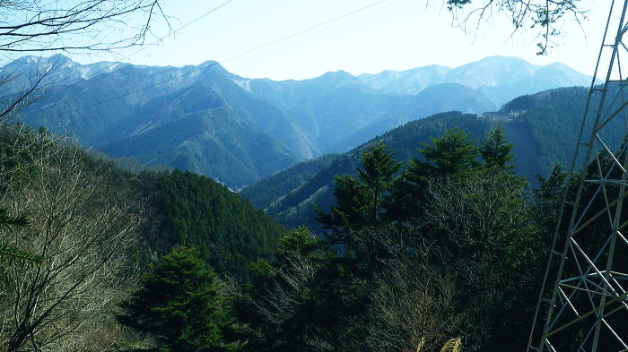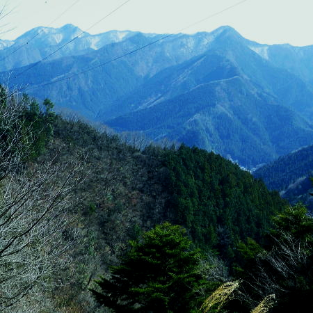 | もう1つの「指」の付く尾根.平石山妙指尾根を下る 残雪は薄れ妙指尾根を急下降.10号鉄塔からの村界尾根.北尾根の大展望を仰ぎ..向寺地の「アカガシ」を感傷し日原街道からjr奥多摩駅. 根岩越しのマイクロウエーブ760m圏コブ 築魔山760m圏コブから本仁田山を経て平岩山氷川 平石山妙指尾根を南下し向寺地・・向寺地のアカガシと寺地. 平石山妙指尾根 平石山の下降点から左は植林.右は雑木林が見下ろされる妙指尾根から向寺地.寺沢を経てjr奥多摩駅 13:17妙指尾根取付き一13:36木片の道標一13:47「↑10号鉄塔.11号鉄塔→」一13:57(10号鉄塔)一14:26老樹アカガシ 一14:29向寺地一14:33向寺地橋:50一14:55寺沢バス停一15:02氷川大橋一15:04jr奥多摩. 妙指尾根 本仁田山の西側の峰.平石山から日原川支流のアシ洗沢と安寺沢とを隔て南南西に延びるのが妙指尾根。 840m圏では2つの支尾根を派生させてをり.共に送電線鉄塔が建ち.西側の支尾根の末端は向寺地へ。南尾根中腹裾には安寺沢の集落がある。 分岐から尾根の下り始めは細かい岩混じりの急斜面から始まった。それに細かい枝打ちに落葉が乗り歩き難し。 溶けだした疎らな残雪が更に紛らわく.ルートを分かりずらくくしていた。主尾根筋を外さなければよい。 深く太い樹林帯から右の支尾根に取付く.13:33 巡視路が尾根を横切る.13:47右の写真.立木に吊るされた手書きの印.13:36 尾根を横切る送電線日原線のL字鋼巡視路標柱. 鉄塔巡視路 尾根沿いは殆ど檜の植林帯を下るようなる。そして尾根幅の広がり始めた中央を下ると890m圏で10号.9号鉄塔が建つ.2つの支尾根に分かれる。 そこには木片の道印があり.左「安寺沢直行(急坂)」.右「炭焼小屋から向寺地.アカガシ」とある。ほぼ直進して下るが横切る左手の踏み跡は薄い。 劇坂で安寺沢に下れば大休場尾根の登山道と合わさり.白井沢から徐野ケ野を経て日原川沿いの氷川鱒釣場に下りられる。 安寺沢右岸尾根とも云うべき東の支尾根はとんでもない急斜面。標高点626m点を通過.木組から小さなコブ.西山には9号鉄塔が建つ。 ここからの下降はトラバースしても無理。鉄塔標柱まで戻り劇斜面の踏み跡から民家脇入口にでてから安寺沢に下りられる。 尾根幅が更に広がり.それほど間を空けずして.炭焼小屋を見落としているが尾根を横断すると確りした巡視路と交差した。 L字鋼の巡視路標柱が2方向だけを示し立てられていた。巡視路を右に入れば11号鉄塔から平石尾根伝いの12号鉄塔にでる。 巡視路は荒廃化が進み荒れている模様。 トラバースする巡視路を横切り.その間々植林帯を直下すれば西支尾根の10号鉄塔に突き当たる。 今下っている妙指尾根でさえ急斜面なのに.安寺沢ルートを考えるととんでもない下りが待ち構えているようだ。 「地名考説」の柳田国男著によると「アテラ」の地名を集めてみると「山かげにあって.日光の当たらぬ土地」と説いている。 又標柱には「↑日原線10号に至ると11号に至る→」とあ.,尾根らしくなくなった。 更に下るとそれ程間を空けず.2つ目の同じ巡視路標柱が現れた。巡視路を右に折れれば平石尾根の840m圏コブの南尾根. 610m圏付近の11号鉄塔と繋がり.ここからも12号鉄塔に至る。 西支尾根へ 雑木林.植林の中木帯.13:472つの支尾根を挟むウシロクボとアシ洗い沢とを隔てる西側の支尾根 石尾根 日原線10号鉄塔基部にでる.13:52狩倉山日陰指尾根 基部の右景・・正確には頂は望めず北峰になる.13:56狩倉山からの左尾根は石尾根の頂稜になり.三木戸山へ下りている。今年7月に再び「指」のある尾根を目指し. 日陰指尾根から三ノ木戸山に立ち.見通尾根から不老林道を経て峰畑沢にある将門神社・峰畑を探っている。 右上は山ノ神尾根. 5年前に小菅集落から山ノ神尾根を経て六ッ石山に立ち.小中沢右岸山腹道を下っていた。 三ノ木戸山 鉄塔基部の右手より峰畑沢(同.下流は寺地沢).13:52三ノ木戸山と999m点. 十二天尾根と手前が見通し尾根。右下が東京農業大学研修センター。日原川下流右岸沿いの尾根で. 見える地域全体が演習林地になっていた。今年7月には三ノ木戸山を越え.研修センター脇を抜け寺地沢を下っている。 奥多摩町と檜原村との町界尾根 鉄塔基部の左景.13:54大岳山〜御前山惣岳山間・・大岳山.ドバノ岩山.天地山.鋸岳.鞘口山.クロノ尾山.1280m圏峰.御前山.惣岳山 奥多摩町と檜原村との頂界尾根・・中間左手が鋸尾根で右手が鞘口山江戸小屋山九竜山尾根。 右中段が石尾根末端・・上部の切り開かれた台地は林道三ノ木戸線が通る旧絹笠及び農指の山上集落。 切り開き左のコブは608.8m点の3等三角点を持つ羽黒山(農指山)。 農指の右山腹を刻む林道は不老林道を上部で合わせた三ノ木戸(小中沢)林道で集落を横切っている。 重ねて登山道が通り.下方には林道の近道から羽黒三田神社にでる。手前が日原川.裏側が奥多摩湖に遡る多摩川。 左手の手前は妙指尾根790m圏点の二俣に分かれた東側の9号鉄塔尾根。 大岳山と天地山.鋸山 左景アップ・・天地山北東尾根と鋸尾根9号鉄塔が乗る左の妙指尾根東支尾根 