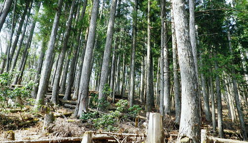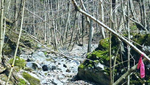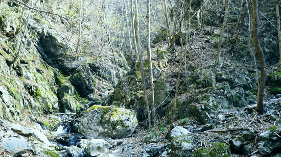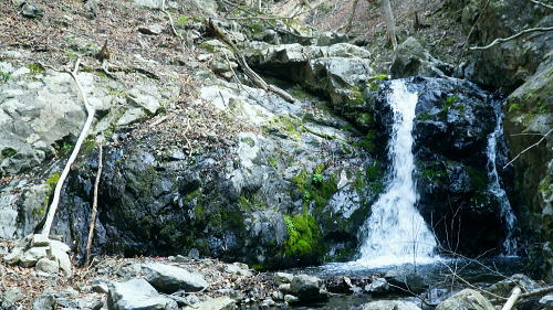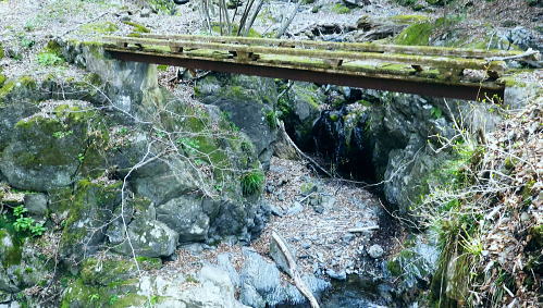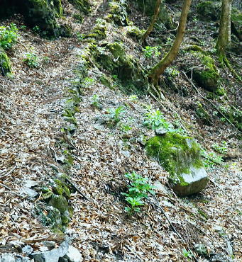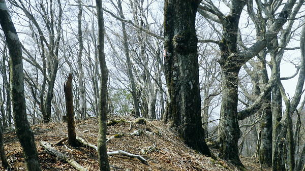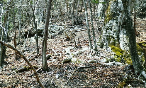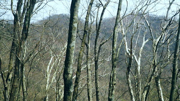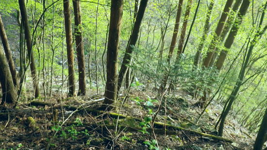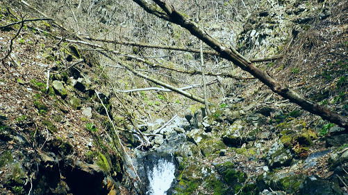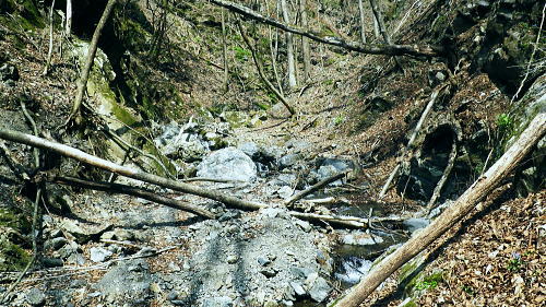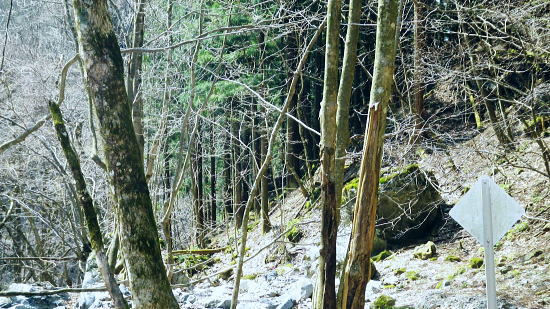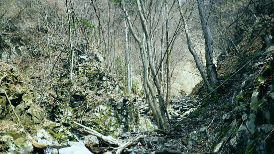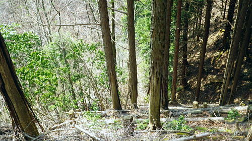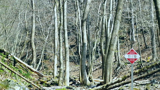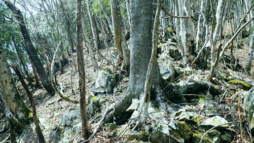 | 倉沢谷流域・・右俣長尾谷から棒杭ノ頭南尾根(浅間前窪右岸尾根)に乗る。 棒杭尾根末端を回り込み.シオジ窪から長尾谷右岸歩道の終点―林班「奥多摩区分11/10」から左又窪左岸尾根。 倉沢林道終点とシオジ窪・・直接.棒杭ノ頭へ突き上げる尾根から目指す 右俣長尾谷から棒杭ノ頭浅間前窪右岸尾根 蕎麦粒山に立ち鳥屋戸尾根から松岩尾根を下り.山伏沢から川苔山仮登山口から下山 右俣長尾谷 核心の崩壊地帯.9:14右岸が屏風状で横切れず.一度谷に降りて左岸の高みへ回り込む 長尾谷右岸山腹道から棒杭ノ頭南尾根 9:08シオジ窪出合一9:19木橋一9:48「奥多摩区分11/10」一10:28浅間前窪出合一10:48尾根上一11:34棒杭ノ頭. 左岸より通れぬが朽れ健在の桟橋.9:19布切れ.サンダル類は綺麗に片づけられ.両岸にはそれぞれ通行止を示す小枝が2本添えられていた。 右岸作業道に残るほぼ完全な石積み.9:27長尾谷右岸歩道 右岸の山腹道に移ると足元に小さな黄色いスミレの花を見付けている。周りを見渡すもまだ2つ.3つと数える程度。 春が訪る山径で.最初に目にするのはスミレだろう。木柱に「林班11-4? 日原都有林」と如何にか読める木柱を過ぎると 山腹を大きく回り込むようなった。 割れ埋まる一升ビンを見.急斜面の確りしたジグザグ径を詰め高度を稼ぐと短い桟橋を渡り.更に再び林班標を見ている。 どれもが古い。そして右岸から流れ込む支流の930m圏出合にでる。支流の作業道を詰めれば棒杭尾根の半ば辺りに乗る。 この作業道は目立つほど確りしていた。 本流右岸沿いには薄い踏み跡があり.支流の作業道を左に分けると間を空けず踏み跡らしくなった。 次第に谷底との高度差を上げ.檜の植林帯の中を歩むようなった。 前回は930m圏支流出合から右上の高みの植林帯に縁の露岩帯にでて巻き道か? 分らずその尾根末端の植林帯から河原に降りていた。 河原は高低差の少ない小滝が連続し岩盤状を抜け.右岸歩道の終点の林班界.標柱にでていた。今回は谷底に降りず.その山腹道を直進している。 巻き道を終え長尾谷に降りた地点.9:46右岸道.巻き道 露岩状の一段高い尖っ付きを越え.右又窪右岸尾根末端の植林帯に入ると枝打ちされ綺麗に手入れされた植林帯に入る。 ここまで来る道中に幾つもの難路があるにも拘らず.この樹林帯は平坦な林床に包まれ以外に歩む良さが感じられ. 不思議な気分を抱き迎えられていた。 更にこの森の中を回り込む.樹間越えの右下に堰堤が見下ろされた。昨年は谷底の堰堤を越えている。 記憶に残るよき巻き道になっていた。960m辺りで作業道を分けている。下る右手を取ると河原にでて.再び河原の眩い明るさに戻された。 平坦な河原の100mほど先で.昨年見付けた「奥多摩区分11/10」の林班界標柱が立つ経路の終点970mにでる。 「奥多摩区分11/10」林班界標 右岸道終点から上流側を臨む.9:48 下流側・・正面右の植林帯に巻き道あり標柱は河原の真ん中にあり.長尾谷は左に大きく回り込む 棒杭ノ頭南尾根・左又窪左岸尾根 長沢脊稜より登り終え長沢脊稜から望む浅間前窪右岸尾根(左又窪左岸尾根) 左又窪左岸尾根で帽杭尾根はこの尾根の裏側に延びている 2つの尾根・・1440m圏コフの゙棒杭尾根と棒杭ノ頭南尾根 対岸の鳥屋戸尾根1290m圏よりシオジ窪右岸尾根から鳥屋戸尾根・に乗り.神庭尾根を下った折.1290m圏少し手前からの展望・・2016.12.03/11:20 左手に延びるのが棒杭尾根の源頭1440m圏コブ。右手前が右又窪右岸尾根で棒杭ノ頭1449mのツメに突き上げている。 右手が棒杭ノ頭になり.南尾根(浅間窪右岸尾根)を長尾谷へ落している。間の中央は扇状の溝を広げる右又窪で.右端が浅間前窪になる。 昨年は左又窪右岸尾根を登り.棒杭尾根上部の巨樹林帯にでて.源頭1440m圏コフに立っている。左奥は天目山から大栗山. 左又窪出合980m 左又窪出合から浅間前ノ窪へ.先は鼓ケタワ.10:07左手から入り込むのが左又窪。新たに棒杭ノ頭を目指し.今回は左又窪左岸(浅間前ノ窪右岸尾根)沿いの尾根に乗る。 沢底は幾らか荒れ気味になるも.まだ緩い傾斜の沢沿いで歩き易い所を求め.左右に渡り暫くは沢筋を進んでいる。 真新しい赤テープのマーキングが目立った。点々と私の進む先へと導いて行く。結局テープの途切れた境目を尾根の取付きとした。 少し遡り振り返る本流の小滝の連続.10:11 小滝は右脇を越え.流心の右筋へ回り込む.10:12 10:16左又窪と浅間前窪の二俣から水量が増え.流心らしくなるも.登山靴でも如何にか治まる程度。 浅間前ノ窪の出合1070m.10:28右俣奥が右岸尾根の崩壊地 この先.浅間前ノ窪の左俣に分け.更に右俣へ入れば上部は伏流になっている模様。正面に突き上げる尾根は 浅間前ノ窪中間尾根で長沢脊稜の浅間前にでる。直ぐ右脇のコブが仙元峠. 左脇手前が帽杭山南尾根の末端になる。 左又窪左岸尾根の末端 先の窪溝は浅間前窪左俣.10:27浅間前窪出合脇の痩せた露岩状の尾根末端。ここからは登れるが劇斜面。 少し右手から沢沿いに入り込むと登り易いルートが選べられていた。又ここに最後の赤テープが