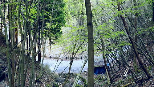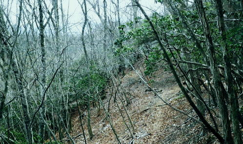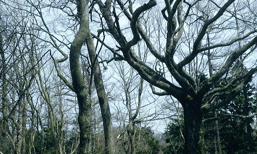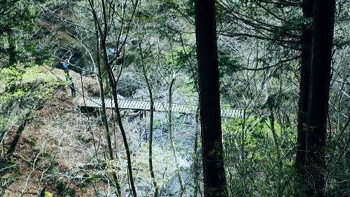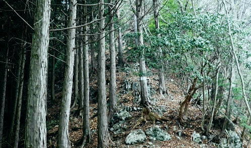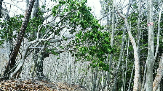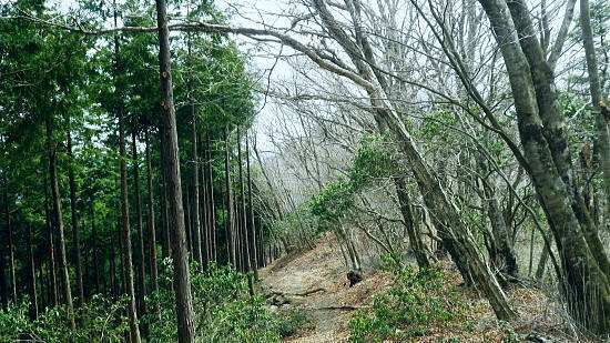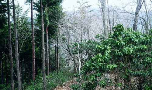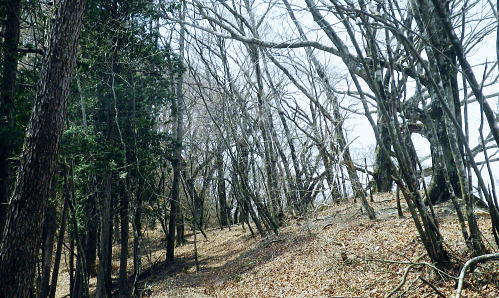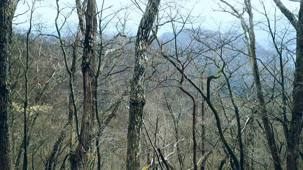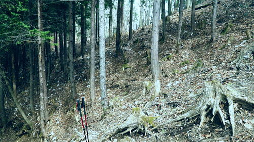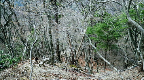| ・・蕎麦粒山鳥屋戸尾根Top 鳥屋戸尾根を下ると東側に派生する支尾根で.松岩ノ頭松岩尾根を綴る。 棒杭ノ頭から蕎麦粒山南山腹道に入り.鳥屋戸尾根を南下.松岩ノ岩松岩尾根から山伏沢を下降.仮川苔山登山口から川乗谷沿いの小道から細倉橋へ。 倉沢林道終点とシオジ窪・・直接.棒杭ノ頭へ突き上げる尾根から目指す 右俣長尾谷から棒杭ノ頭浅間前窪右岸尾根 蕎麦粒山に立ち鳥屋戸尾根.松岩尾根を下り.山伏沢から川苔山仮登山口から下山・・猛烈な小ブヨと細倉橋 長沢脊稜 仙元峠へ.12:03鳥屋戸尾根.松岩ノ頭松岩尾根 11:34棒杭ノ頭一12:31蕎麦粒山南側山腹道分岐一13:13松岩ノ頭一14:19第一小屋一14:50川乗谷林道.山伏沢出合 一14:59迂回.川苔山登山口一15:28細倉橋一16:00川乗橋bs16:29. 鳥屋戸尾根には笙ノ岩山・塩地ノ頭・松岩ノ頭のピークが並び.それぞれから支尾根を派生させている。 松岩ノ頭からほぼ東方に延びるのが今回下る松岩尾根。塩地ノ頭の手前の小ピークの登りで右に登山道を分け.左の細道に入る。 1220m圏のコブを過ぎると道形は明瞭になった。ポイントは標高1150m圏で.その間々尾根を下らず.右後方の作業道に入ること。 12:13左又窪左岸尾根・・棒杭ノ頭南尾根 棒杭ノ頭南尾根上部・・山腹道に入り.12:21左又窪左岸尾根本体は単純な一本筋で.一度植林帯に入ってから脊稜まで自然林に覆われていた。 痩せ尾根はほんの一部分.尾根の取付きまでは変化に富み愉しめる行程だが.尾根に乗ってからは一度登れば気の済む尾根になる。 ススタケは殆ど見定められず.下降路として選べるが変化に乏しく少々がっかりさせられた。 倉沢谷右俣の長尾谷流域 棒杭ノ頭南尾根下部.12:22長尾谷対岸は鳥屋戸尾根笙ノ岩山1254.8m 正面の谷間が浅間前窪で右の尾根が出合から登り詰めた棒杭ノ頭南尾根。 左側から落ちる尾根は浅間前窪右岸尾根になる。上部脊稜の取付きは下の写真.仙元峠の気持ち東寄りの山腹道にでいる。 浅間前ノ窪中間尾根を見下ろす 脊稜の浅間前より支尾根を見下ろす.12:24背は仙元峠で縦走路は南側の山腹を回り込んでいる。立木に赤と黄色いテープが目に付いた。 蕎麦粒山の南山腹道に入る 山腹道の分岐に立つ林班界標柱「奥多摩11/10」.12:31この林班界標柱「奥多摩11/10」はシオジ窪出合・長尾谷右岸歩道の終点と繋がる同じ区分標. 仙元峠の東脇分岐点.鼓ケタワ 脊稜の鼓ケタワから頂稜を綴る登山道を左に分け.右に蕎麦粒山南側の山腹道に入る。 昨年歩んだ脊稜を更に西側に進んだ所にある三ッドッケの南山腹道とは地質的にも異なり.厳しいガラ場を刻む狭い山腹道になっている。 確りした山腹道だが足場は小石混ざりで硬く.足元から落ちる急斜面に危険はないが気を使うトラバースになっていた。 蕎麦粒山鳥屋戸尾根 右俣長尾谷源流より.12:38松岩ノ頭.塩地ノ頭.笙ノ岩山 南山腹道.鳥屋戸尾根との分岐 「奥多摩区分10/7」林班界標が立つ.12:53地形図「武蔵日原」の幅員ではこの蕎麦粒山鳥屋戸尾根との乗っ越しの十字路地点は1370m圏に記されているが実際は1410m圏になる。 以前頂から或いは登りで年越しに2度.分岐にでている。その折は四方.背丈を越すススタケに覆われ.今とは全く異なり視界は閉ざされていた。 鳥屋戸尾根を南下 長尾山1339m手前で.13:03主に川乗谷側の尾根筋を巻いている 松岩ノ頭1260m 縦走路は右下を横切っている.13:132010年01月.登り尾尾根.鳥屋戸尾根から仙元尾根へ都境した折も頂には寄っている。 その時は小枝に枯ススタケが絡み.膝近くまでは藪密で.スズタケも高く.幹5cmほどの立木は体に触れればボリボリ折れていた。 そして頂を離れれば踏み跡も疎らな土壌はクッション深く歩き難し。尾根筋は通うハイカーは右脇の縦走路を通っていた。 瘤高山,大仁田山(高指山)と平岩尾根 先月訪れた「指」の山域.13:22左下の窪地は鋸尾根の下部に大ダワがある 左奥に霞み延びる松岩尾根 縦走路に戻り.川乗谷側の斜面.13:32シオジ窪右岸尾根を見下ろす 長尾谷側の尾根.13:32尾根末端の取付きは長尾谷右岸山腹道の起点で.下りは松岩ノ頭南肩。 松岩尾根取付き 松岩ノ頭北側肩.13:46松岩ノ頭1268mから仄かに南に下った八丁山1260m圏の登りに掛かる所で.左に延びる松岩尾根の北面沿いに細い径を見付け,下ることにした。 確りした踏み跡がストックが立つ脇から綴られている。私が立つ脇の立木には赤.黄色のテープ.マーキングがあり.鳥屋戸尾根とここで分かれた。 薄暗い樹林帯から松岩尾根に乗ると低い灌木林に変わり.越えれば再び明かすさが戻されていた。 松岩尾根を下る 振り返る煩い灌木帯.それでも足場は確りしていた.13:51川乗谷を隔てた向かいが本仁田山 アセビのジャングルを東進.13:54 幹の白ペンキが目立つようなる.13:57ほぼ北東から東北東へ一直線に緩く登り.アケビの生い茂る煩い尾根筋を進み,東南東に向きを若干変えて. 1260m圏の大らかなコブを越える。そして尾根筋の灌木林を避け.綴ると急な斜面を下るようなった。 冬木でも見定めぬ痩せ気味の所もあり.立木の白ペンキが目印にな