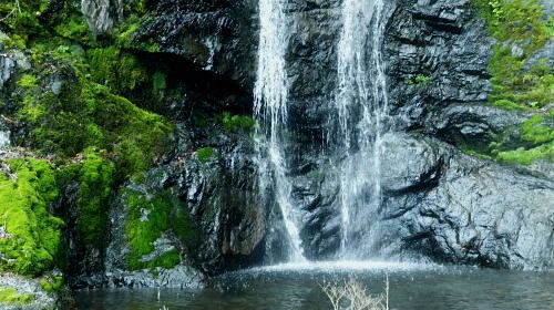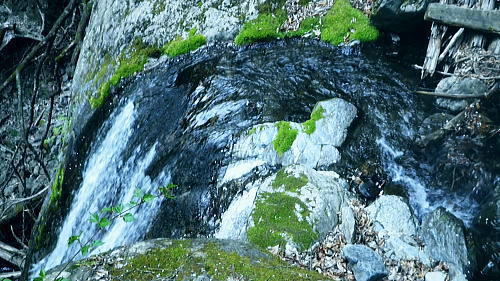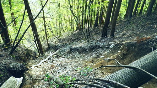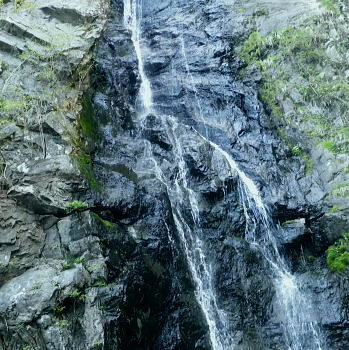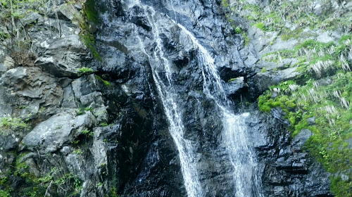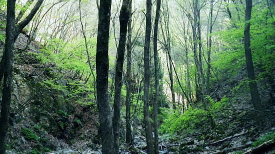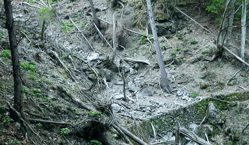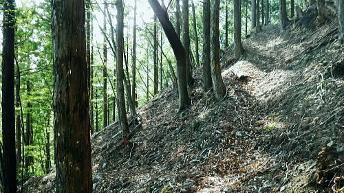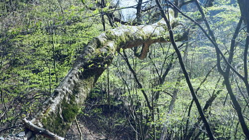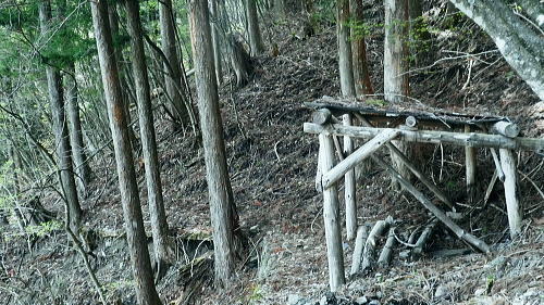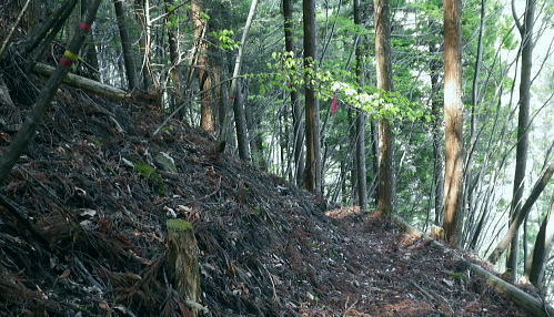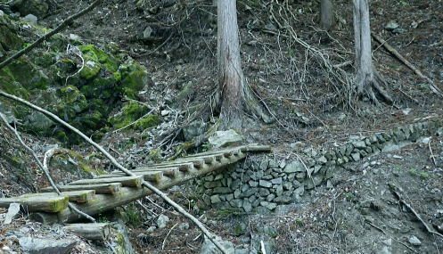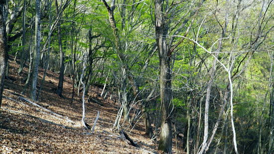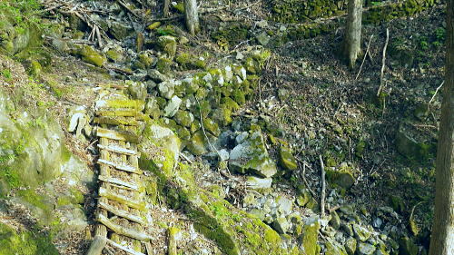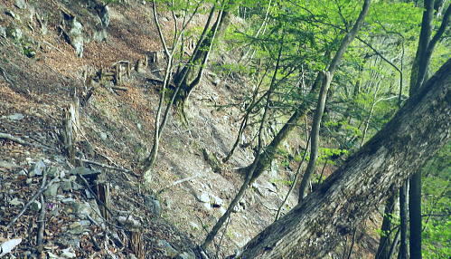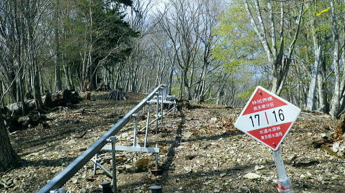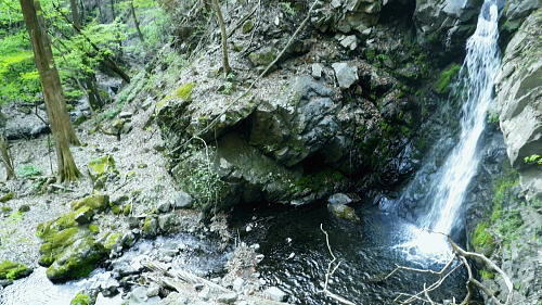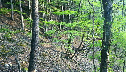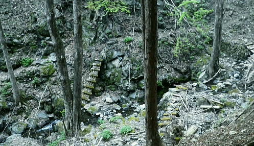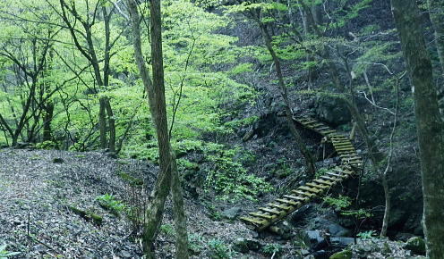 カロー谷中段歩道から小川谷左岸道・・日原散歩まっぷ 板形ノ頭から板形尾根の中段歩道を経てカロー大滝―経木小屋跡から再び横篶尾根南西面の小川谷水平歩道を下る 細久保橋から天目山林道に入り秩父グミの滝 三ッドッケ.シャクナン尾根.長沢脊稜へ 中段歩道からカロー大滝を経て横篶山西面水平歩道・・渡り歩いたストック 板形ノ頭 板形尾根ツメを下る.14:04カロー大滝を目指し.中腹道を繋ぎ東日原へ 板形ノ頭14:00一14:15カロー谷中段道分岐一14:41水平道分岐一15:25賀郎ノ大滝:35一15:50水平道分岐 一16:13カロー谷交差一16:22F3一16:25小川谷左岸道一18:50東日原bs. 長沢脊稜には昨年の4月から丁度1年目を迎え.倉沢谷を周回し板形ノ頭に立ち. 昨年9月の初めには横篶尾根を周回した。 今回と同じルートを取り.板形尾根から中腹道に入り.小川谷左岸水平歩道に回り込んでいた。 緑深い晩夏の山の中を歩む。作業道は重なり合う樹葉に先々が閉ざされ.瑞々しい山腹道の緑深い渓谷を歩んでいた。 今回はまだ裸林の脊稜だったが板形尾根を下るにつれ.山腹を覆う樹林は少しずつだが若葉に迎えられている。 カロー谷の経路に入れば高度を下がるにつれ少しずつだが若草色が重なり合う.愛でる青々しい渓谷に迎えられるだろう。 中段歩道交差 脊稜を離れた尾根沿いは再び新緑が覆うようなる.14:05頂稜からモノレール軌道と交差する中段歩道へと尾根筋を下るにつれ.裸林の装いをこらし.疎らではあるが少しずつ.若葉を付けるようなった。 「林班名奥多摩区分17/16」の標柱が立つ分岐からちカロー谷に入渓する取付き地点に着く。 前回は更に下部に当る中腹道が交差する地点から十字路を横切り.カロー谷本谷へ下りている。 その取付き地点にも.同じ番号の林班界標柱が立てられていた。今回は中段歩道からカロー滝に回り込む。 カロー谷中段歩道 青葉に覆われた台地.14:29カロー谷の谷間に入ると新緑は一気に賑やかさを増し.急に裸林は数えるほどに減っている。日当たりのよい東面のためだろう。 山越で冬木で戻り忘れていた気持が新緑で新たな新鮮さを生み.見る喜びにワクワクさせていた。 「バリエーションルートを楽しむ」松浦隆康著によると『広辞苑』による甲籠(かろう)とは「唐びつを積み重ねたような険しさ」を意味する。 御岳山の険峰・奥の院は甲籠山とも呼ばれ.小川谷支流のカロー谷やカロー大滝も.このような地形的な特徴から名付けられたようだ。 カロー谷は賀郎谷とも呼ばれ.カロウともある。 以外と長い巻き道がある小尾根下り.14:38水平歩道へ モノレール軌道から分かれ.カロー谷に入り込むと南東に延びる急斜面の枝尾根を駆け下りる。この尾根末端はカロー谷の交差946mに没している。 そして水平歩道に出るまでは南東尾根の南側を絡み立派な作業道がジグザグに付けられていた。 初めてのルートで尾根先.分岐が分からず。作業道が折れる都度.尾根に乗るのを確認しジグザグに下っていた。結構降りていた。 出た所が下の写真地点で幹に赤.黄色テープが巻かれ,赤テープの垂れる.はっきりしたT字路にでる。右に折れれば昨年訪れた十字路へ。 そして十文字からカロー谷の谷底に下りている。この経路は下の軌道を横切るカロー谷山腹道の経路。又今下ってきた枝尾根の末端になる。 当時,十字路は初めての者には分かりずらい場所だった。遠目ではよく分かるも.薄い踏み跡が交差していた。 1つずつ確認してカロー谷へ下った覚えがある。重く雲が垂れ込み.夕暮れが迫り.うっそうとした雰囲気の中.駆け下りている。 今回はカロー大滝を目指し.左手の上流側に折れ水平歩道に入り.旧経木小屋の台地に直接下りている。 水平歩道 作業道T字路分岐.14:41キハダ窪 崩れる経路があれば確りした石積みもある.14:46 早くも色濃いツツジの花が咲く.14:49高度はほぼ水平を保ち谷間へと徐々に低くなり.日陰の薄暗い長い樹林帯が続く。少し陰惨な雰囲気をかもちだしていた。 青葉の色合いも薄れ.裸林が見られるようなる。その場所柄にも係らず.咲き始める紫色の山ツツジを見ている。 山中で一番茂り多い花びらをこの立木は広げていた。 尾根の突き出しにある骨格のみ残る小屋跡.14:50下駄小屋窪 少し荒れ始めた径路.14:56下駄小屋窪を横切るため樹林帯が切れると明るく開かれ.下流は更に広く膨らみを持つ河原が開かれていた。 ただ河原沿いは閑散とし.まだ春の兆しには臨めないでいる。又左岸沿の水平道はやや荒れ気味の所が多かった。 F4・・賀郎ノ大滝 上段.15:25本流左岸の小尾根に乗り.下ると尾根から離れ右後方に折れ.本谷の河原に下りた。 荒れたガラ場の大地から見上げると前方正面に賀郎ノ大滝が黒光する胸壁を構えていた。 カロー谷は小川谷の支流の中では最下流にあり.下流域は容易な小滝が続き.中流部のやや大きな滝も,踏み跡伝えに簡単に巻けている。 上流の大滝は端正な滝だがグミ滝に比べ.やや迫力に欠けていた。飛龍する流心もグミの滝に比べ.やや少ないように思われた。 それでも岩壁の黒