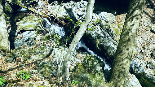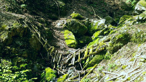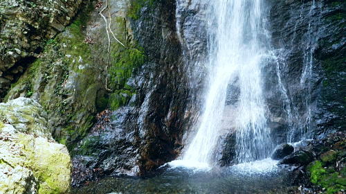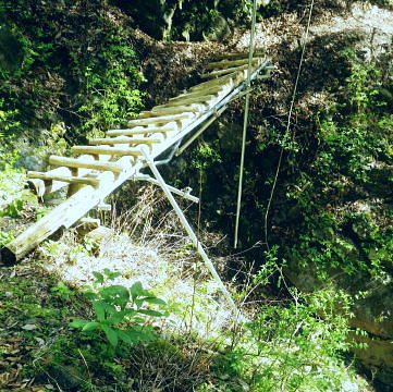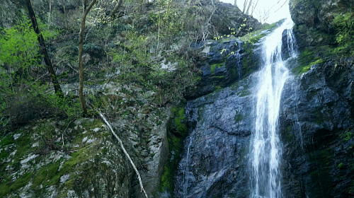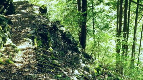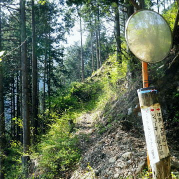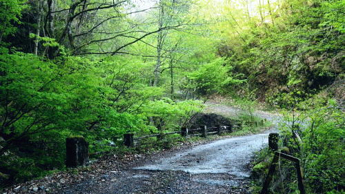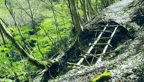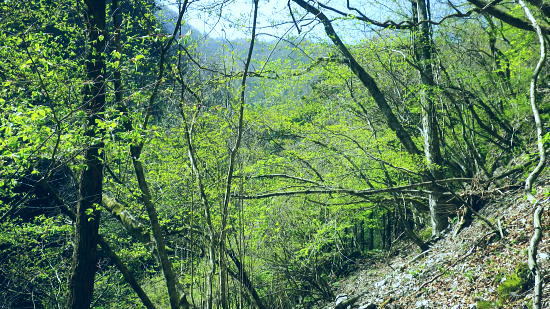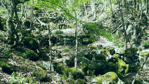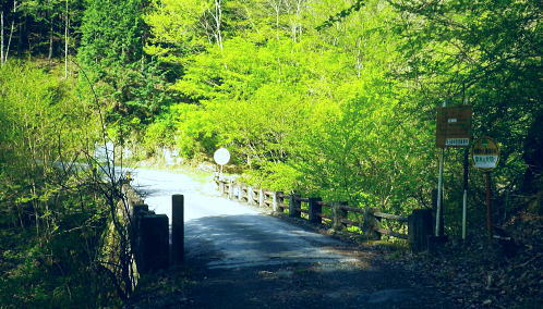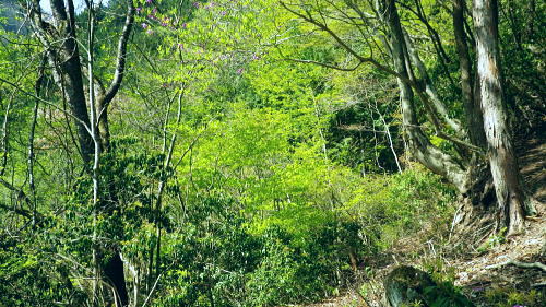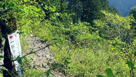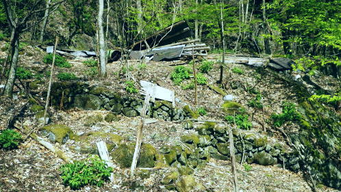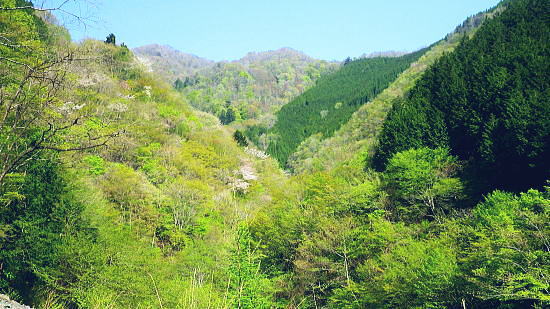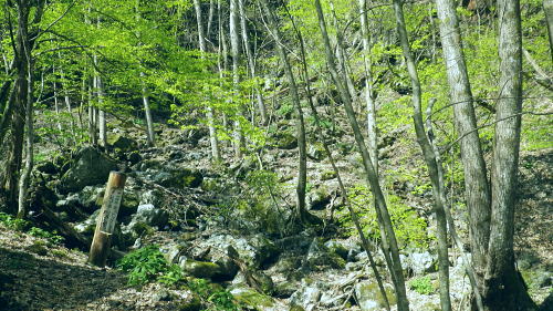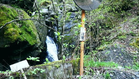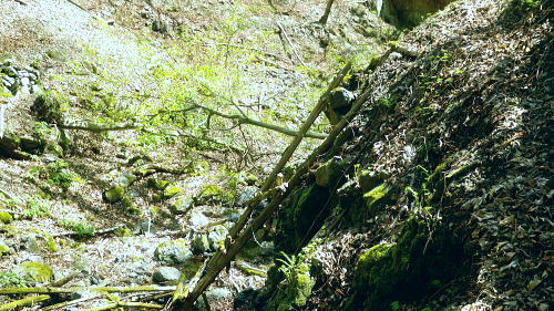 | 長沢脊稜を跨ぐ2つの名瀑.グミの滝とカロー大滝・・秩父浦山流域Top 秩父から長沢脊稜を越境し2つの名瀑を尋ねる。細久保谷左俣のグミの滝から三ッドッケシャクナン尾根 長沢脊稜の板形尾根中段歩道からカロー大滝を見分し.下山は横篶山西面の水平歩道に回り込む。 2016年04月26日.松村 細久保橋から天目山林道に入り秩父グミの滝・・シーゴ平と旧細久保線 三ッドッケシャクナン尾根から長沢脊稜 中段歩道からカロー滝を経て横篶山西面水平歩道へ・・東日原 前回の棒杭南尾根から松岩尾根山行は前半を同じルートで辿ったせいか.思惑していたより少し期待外れの消化不良が残されていた。 今回はその10日前に歩んだ棒杭ノ頭から見渡した北面の秩父側.細久保谷に入り. 福寿草を諦めて浦山から新緑の大滝巡りをポイントに選ぶ。 アプローチの長さに加え.越境にあるグミの滝とカロー大滝と2つの名瀑を結ぶには少し馬力がいた。それでいて未知への探るルートに ワクワクさせら迎えた。ただ下調べの怠りが昨年と同様に小川谷の横篶山西面水平歩道を下り.日没との競争し日原で日没を迎えている。 4月26日(火)快晴後曇 jr御徒町4:50=5:10西武池袋:15=6:16飯能:22=7:12西武秩父.秩父丸通タクシー¥4.690=7:45細久保橋. jr新宿駅ホームをダッシュした。5分後発の西武線飯能行の2番電車に乗車。飯能駅からは久し振りの秩父行.ボックスシートに座り込む。 私の乗る山列車は殆ど中央本線に限られている。飯能からは数えるばかりの乗客。否一車両に2.3人いただろうか? 足を伸ばしてのアプローチ。 朝方の優しい日差しが車内にも射し込み.眩い明かるさは郊外の田園風景から山里へと広がりを見せている。 高麗駅前広場に掲げられた広告塔に「天下大将軍」,「地下女性群」とある。地元鈴木に尋ねたことがある。それが何を意味するのか今は忘れている。 次の武蔵横手駅は日和田山で同期会を催した時の集合場所.3年前にはOB親睦ハイクもここで催され.何度か現役時代や卒業して訪れている。 吾野.正丸峠は高校の初めに伊豆ケ岳を企画し.同級生達と登っている。又昔.正丸峠には何度か続けてOB親睦会を催し訪れてもいた。 正丸峠越えれば武甲山の荒れた山肌が真近に迫り.岩肌を大きく抉る石灰採石場は山形を変貌させ.扇状に深く刻まれ山肌は今でも崩されている。 勢いに乗り.伊豆ケ岳の翌月には武甲山に出向いていた。その裾野ギリギリに線路が綴られている。 席を立つ乗客を見て.列車は西武秩父駅ホームに入線した。改札をでると「松村さん!」の声。予約したタクシーがトランクを開け.待ち構えていた。 秩父浦山川流域 細久保谷細久保橋P.7:52対岸の橋口に閉ざされたゲートあり. 旧細久保分線 細久保橋P7:52一7:59シゴー平一8:04左俣沢橋一8:17旧登山道取付き一8:20カーブ.グミの滝取付き地点 一9:36細久保小屋跡10:00⇔9:43グミの滝. アプローチ 浦山大日堂行.路線バスは廃線となり.今は変わってスクールバス混乗型の市営バスが代行している。これに乗車すると入山は10時過ぎになる。 2時間がもったいなくタクシーを奮発.利用することにした。西武秩父駅前の彩甲斐街道.R140号を抜け.毛附隧道を潜ると浦山川の二俣.川俣にでる。 右俣の細久保谷を分け直進して広河原谷沿いに入れば.直ぐ先に浦山大日堂にでられる。 ここは仙元尾根の末端に当り.過ってに日原から国境尾根を越えて川俣に下り.秩父駅まで市営バス「ぬくもり号」に乗車して西武秩父に戻っていた。 確か当時の料金は¥300だった。更に先へ.広河原逆川林道を進めば有間峠を越え.山越の先は飯能市に至る。 「国道140号まで9km」の表示のある県道の右脇に小さな川俣橋が架かっていた。ここが天目山林道の起点445m. 左側が浅間尾根末端で.右側が峠ノ尾根の末端に当り.詰めた先が大平山。前回と云っても4年前に横篶尾根から入山.ここ出合に下りていた。 天目山林道に入ると500mほどで舗装が途切れダートになる。道幅も狭く.大ネド尾根末端に広がる扇状の裾野を回り込んでいる。 新緑の若々しい樹葉に満ちる渓谷を綴り.右手に現れたカラ沢に入れば先月最盛期を迎えた福寿草の谷間にでられる。 運転手の話では先月は福寿草を求め数回.ここまで入っているとのこと。それ以外は年間を通して殆どタクシーでの入山はないらしい。 林道のゲートは細久保谷出合から入り.左岸沿いに遡り細久保橋止まりになる。一台の軽トラが駐車していた。 釣師とのこと.運転手が橋上で谷底を覗き込み探すも釣師は分からなかった。小さな釜にうねる流心.程よく踊る飛冴がヤマメの数多さを示している。 陽光が若葉を透し.青葉の色彩豊かさが更に渓谷を煌き輝かしていた。 シーゴ平(管ノ平) 天目山林道.7:59営林署の母屋と瓢箪池.道の右向かいの階段上に祠と資材置場ある 今日は長距離の旅になる。左足首の保護を兼ね.初めよりストックを使用した。 林道の鎖ゲート脇を抜け.左からひとカーブ回り込むと小広い丘稜の平坦地が広がり.既に巨木のブナが茂るシゴー平にでる。 ここが天目山