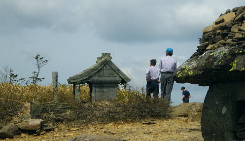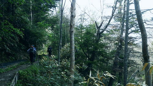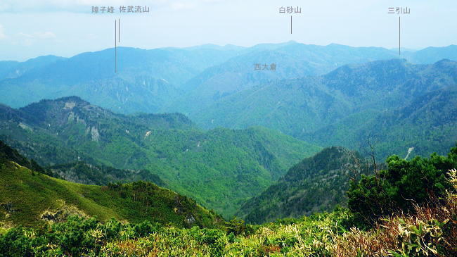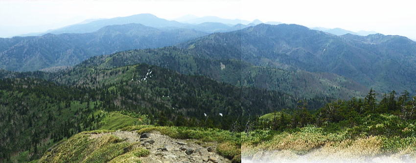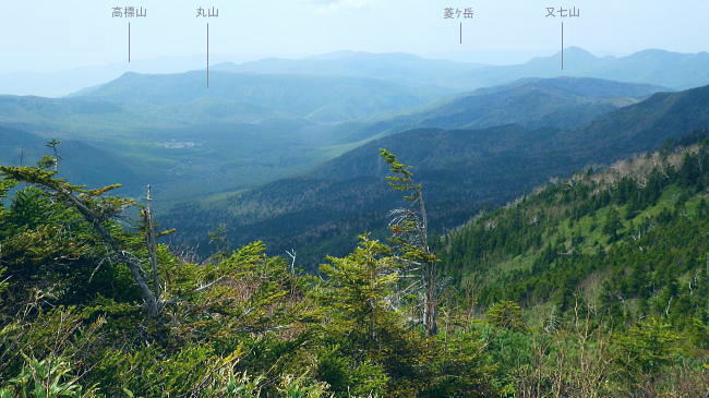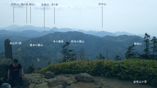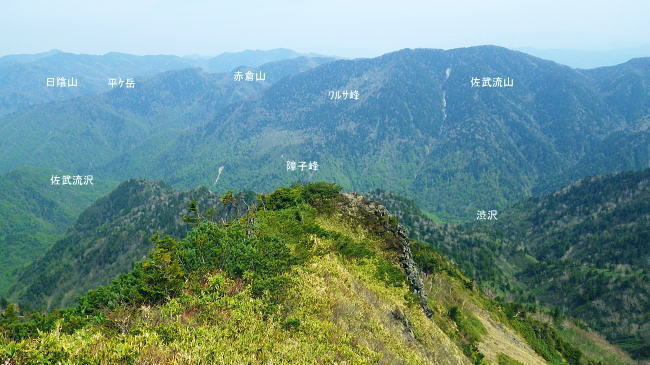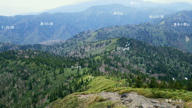 岩菅山に立ち雑魚川へ のっきりから岩菅山をピストンしアライタ沢へ―「聖平の上」から雑魚川左岸道にでて.車を回収・・おもちゃ王国「暁け湯」に寄り北軽へ 高天ケ原からゲレンデを抜け.寺子屋山を経てノッキリ 岩菅山から雑魚川アライタ沢.(上)聖平・・2つ目の聖平・ブヨへ・・4度目で頂に立つ.2度目の聖平.ブヨ 岩菅山々頂で「ガンバレ節」をが 鳴る仲間.13:33四阿山.取手山の展望 ついに岩菅山の頂に足が着く。 初めて岩菅山を目指してから既に7年が経ている。鳥甲山へのアプローチでは翌日登る予定の岩菅山は目指すも取付き地点の錯覚から 山麓を回り込み.雑魚川を遡っていた。3年前は冬山装備を揃え.白銀煌めく頂を目指したがアプローチの志賀草津道路で吹雪に遭遇し. 通行止で岩菅山の取付きまでも行けずいた。 里山の散策に変わり.草津の里山.石尊山へ。その頂からは純白に飾り立てられた岩菅山を見詰めていた。何とも言いようのない眺めだった。 一昨年は豪雪でなく火山噴火で再びアプローチで諦め.芳ノ平湿原からやはりジッと構える岩菅山を一種の遠いい願望を抱き望んでいた。 今はその頂に同じ仲間達と立っている。登ったというよりは消化したという感はぬぐえなかった。 又苗場山々行では斜め前に対時しながらガス濃く望めず。白砂山々行では地蔵山の登りで.日当りよく残雪に煌めく岩菅山を遠目に見てもいた。 題目通り.コース選定でなく4度目に成し遂げた岳として登頂できた。先輩の音頭で久し振り「ガンバレ節」をが鳴る。 2つの石社と1つの石碑 一等三角点標.「岩菅山」と山名標が立つ5月19日午後曇後高曇 12:54のっきり一13:16小:25一岩菅山14:00一14:20ホッキリ一14:40小:50一15:15アライタ沢木橋:25一16:10一ノ瀬P =17:30軽井沢のおもちゃ王国「暁の湯」=18:10北軽沢別荘. 岩菅山は広い平頂で標高2295.0m.一等三角点標石と2つの大きな石祠が少し離れ祀られていた。 展望はよく.東館山から登り詰めた道中の山並を綴り見ることができる。暑さの為か遠望は霞み気味.志賀高原から遥か遠方は霞む白根山に浅間山。 以前はよく眺めていた方向でもあるが.現実に何度が山懐に踏み込むと違った連想なり.興味が湧くのは当たりまえかも知れない。 ここからは又.白砂山へ続く上越国境稜線が延々と白砂山まで綴られている。更なる先はおぼろ過ぎていた。 頂から北方の眺望は北側へ1分ほど歩めは.裏岩菅山を中心に取り囲むよう鳥甲山や苗場山が眺められている。 誘っても来ぬ仲間達.一人露岩した小石に座り.360度の大パノラマを楽しむ。ただ日本海は望めず。 避難小屋 小屋は頂からガレた北東部の陰にあり.寄ってみる。平屋の石造りで室内は中央に土間が走り.左右から木床が挟む構造で.中央にストーブがある。 薪はない。又整頓され.こまごま備品が置かれている。宿泊には便利で.水場は裏側の植林帯にあり.北側斜面はまだ残雪で占められていた。20名収容. トイレは別棟で吉沢へストレートに落ち.スリルある場所にある。見定めていないが昔の北岳小屋や栂海山荘と同じスタイルになろう。 使用した後輩は尻が冷たかったと語っている。 大正8年.麓の有志によって山頂に24平方メートルほどの石室が建てられた。 近年.原型は残され.屋根は張り変えられ.確りした土台は避難小屋として.綺麗に使われいた。最近は喜ばしいことに.どの避難小屋も清潔感がある。 上信・上越国境稜線 ![]() 東館山から登ってきた山並を見下ろす.13:21 志賀高原 右景.アライタ沢源流々域.13:35魚野川源流々域 左景.13:23上信国境沿いの遥か南方を望む 13:22裏岩菅方面・・北西側から右回りに白砂山までの展望.吊尾根より 大らかに広がる雑魚川流域 左→右1.岩菅山北面からの展望.13:52鳥甲山と裏岩菅山 右2.霞む左奥が黒姫山.13:49台倉山1852.9m.遠見山1832m.鳥甲山2037.6m 冬季オリンピック滑降コースの予定地だった裏岩菅山 1889年冬季長野オリンピックのアルペンスキーのコースを開設するプランとして.裏岩菅山の雑魚川へ落ちる1000m近い標高差の斜面が予定されていた。 ただ志賀高原は国立公園内で数少ない手つかずの山域だった。1972年札幌オリンピックでは恵庭山の頂が広範囲で伐採され.それは酷く非難されている。 その破壊の前例もあり.自然保護を訴え.現存する白馬八方尾根に変わったことで.岩菅山から魚野川流域の原生林は見事に残され. 千古斧鉞(ふえつ)の入らざる深い森の眺めは開発されず.以後志賀高原の自然保護に結びついている。 過ってこの山は岩巣護山と云われていた。それは幕府に献上する鷹の子.つまり巣を管理する巣守衆がいたからといわれる。 関東近辺では奥多摩の鷹ノ巣山にあたる。鷹がいれば当然山は険しく岩場があり.山脈の東側(魚野川側)は玄武岩質の安山岩の岩壁などが露出し. 険しい山並が創られていた。その尾根沿いに雑魚川出合の切明まで今は点線国道の登山道が綴られている。 裏岩菅山と烏帽子岳2230.4m三角点峰.2030m圏峰 右3烏帽子の頂.遥か先が苗場山 2030m圏峰と1626m点峰 右4.魚野川桂ノ沢佐武流