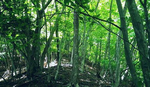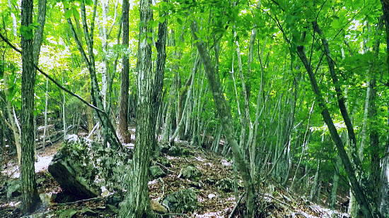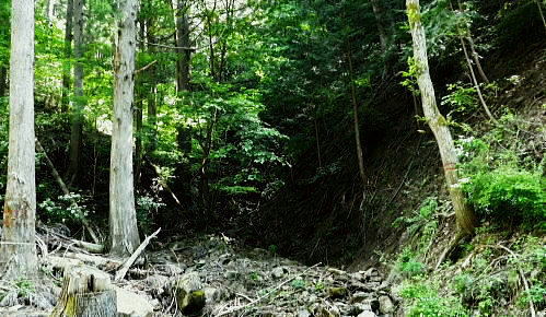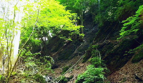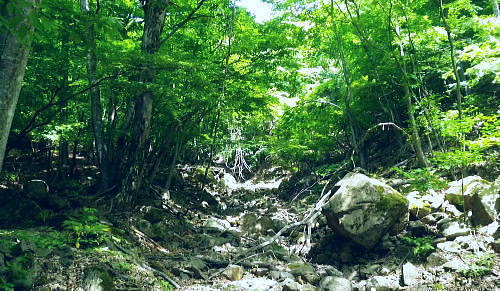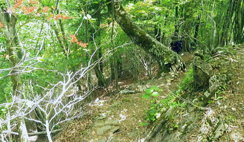 | 南大菩薩.滝子山をめぐる南東.東尾根. 滝子山と沼ノ沢ノ峰・・ 藤沢川流域Top ・・滝子山をめぐる尾根Top 第一弾.藤沢川左俣から滝子山南東尾根に立ち.滝子山東尾根から御正人ノタルと沼ノ沢。 藤沢川達沢のウシロ沢左岸尾根から滝子山南東尾根・男道―東尾根に回り沼ノ沢を下降.恵能野川本流を下る 2016年05月29日.松村 jr初狩から藤沢川の左俣達沢に入り.ウシロ沢左岸尾根を経て滝子山南東尾根・・峡谷と穴カモヤ 東尾根から御正人ノタルを越え沼沢ノ峰から沼ノ沢を経て恵能野川 恵能野集落から桑西真木線と甲州街道・・下花咲 「新バリエーションハイキング」松浦隆康著を購入し.3日目にして決めたルート。若葉萌える新緑を求め笹子川の支流藤沢川に入る。 予定では藤沢川を遡り.沼沢ノ峰南東尾根を詰め.9号鉄塔基部から恵能野川を遡って.小沢ドウミから桑西林道にでる。 又大ゴの上流を散策して下山する積りでいた。それが尾根ではなく.達沢に入ってしまい.久し振り滝子山の頂に立つことにした。 修正したルートは滝子山南東尾根に入り.東尾根を下って沼ノ沢ノ峰に降り.更に鞍部からは時間を短縮し沼ノ沢を下り.恵能野川にでている。 ただ時間のロスを考えるとこの先.小沢越えをして.林道を桑西へ下るには最終バスの時間的余裕がギリギリになり.素直に諦めている。 後は以前歩んだ恵能野川本流を下り.真木川に合わさってからは時間のある限り.新緑に覆われた渓谷を綴り.笹子川から甲州街道にでる。 左上は滝子山南東尾根末端の567m点コブ 初狩駅ホームの右車窓より・・2017.06.17/7:19谷間に藤沢地区があり.越えた鉄塔は東尾根に乗っている。右端が鳥屋ケ丸. 背奥は黒岳から雁ケ腹摺山楢ノ木尾根になるのだろう。 笹子雁ケ腹摺山.お坊山.峰の山 jr初狩駅構内の広い引き込み線に入る.7:30初狩駅から滝子山東尾根へのアプローチ. ir初狩駅構内の改札とホームの間に今でも残るスイッチバックの長い引き込み線。 笹子側には構内の端に何本もの駐留線がある。中央東線は左の茂み裏に本線が走っている。 5月29日(日).快晴後曇 jr御徒町5:11=5:15神田:20=6:26八王子.松本行:35=7:26初狩. 松本行.始発の鈍行列車は八王子で乗り換える。久し振りに乗車した中央本線。高崎線.宇都宮線の如く.ボックスシートはなくなっている。 長距離らしかぬ編成は残念だが小糸線などは新たに観光用に? 工夫した車両が運行されてもいる。上手い方法はないものだろうか。 トイレは前後に2ケ所の車両に設けられていた。 殿平 jr初狩駅450mの駅前通りから.7:35駅前通りの突き当たりがT字路の甲州街道 藤沢川左俣達沢から滝子山南東尾根 jr初狩7:32一7:44笹子川富士見沢橋一8:00藤沢子神社一富士見沢いこい村一8:38山之神社一8:53第4堰堤 一9:06穴カモヤ付近一8:50達沢一11:13南東尾根に乗る一11:25上部男.女坂分岐一11:45滝子山中央峰12:00. 数年前に東尾根から南東尾根を繋げ.滝子山を左回りに縦走し周回ている。その帰路通った国道の裏道.住宅地を通り藤沢へ。 駅前を左に折れ.路地から宮原橋を渡り.引き込み線の半ばから右折して.甲州街道.藤沢口交差点を横断して笹子川を渡れば藤沢に入る。 引き込み線を最後まで歩めば大幡峠に抜ける大幡初狩線に突き当たり.右折して少し戻りことになる。 南大菩薩連嶺東面最南端の山々 宮川に架かる小さな宮原橋を渡る.7:37笹子川北面の山々・・滝子山南尾根と南東尾根末端 正面の567mコブは穴沢と藤沢川との間の支尾根末端に聳え.右手奥にある藤沢集落を見守るよう砦のごとく構えていた。 手前の小川の宮川を遡れば鶴ケ鳥屋山と高川山とを結ぶ大幡峠へに突き上げる峠路があり.越えれば都留市へ。 沢井沢ノ頭と馬立山.右に下って札金峠 下初狩の引き込み線終点から九鬼山南尾根を振り返る.7:41宮川宮原橋を渡ると右手は住宅地.左手は引き込み線沿いになり.振り返ると桂川を隔て.「富士みち」が河口湖へと続いている。 向かいは道志山地の西端の山並として連なり.御坂山地との境にもなっていた。沢井沢ノ頭の手前は菊花山から延びる沢井の広大な台地だろう。 滝子山南東尾根末端と右上が滝子山東尾根 側子地区へ笹子川を渡る.7:44国道20号線.藤沢入口で笹子川を渡る 富士見沢橋手前側子地区より筋沢の集落口を望む。 中央高速道の橋桁.左詰が滝子山南東尾根の末端で.右詰は東尾根から回り込み南下した尾根末端。 藤沢口 中央高速道が藤沢集落の砦門のよう構え.左上が567mコブに笛駒線の送電線鉄塔が建つ。 このコブの上流が北方川と穴沢流域に当り.又滝子山南東尾根の末端になっている。 葛野川線の巨大な21号鉄塔の手前が穴沢山になり.奥の主尾根上には20号鉄塔は東南尾根に建つ。藤沢川を跨ぐのは笛駒線鉄塔. 富嶽と藤沢集落 集落の高台高度500m付近より.7:59国道から側子地区を横切り.笹子川富士見沢橋を渡り.中央高速道を潜ると2つの送電線(笛駒線とjr大-勝線)が架かるのを見上げられた。 藤沢川沿いに.この先高度500mほどまで辿れば藤沢の集落に入り.中央の里道を抜けて.高台から振り返ると集