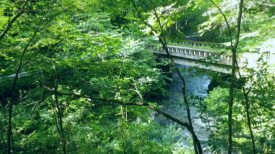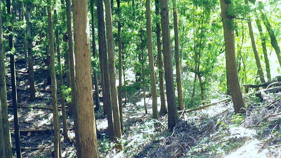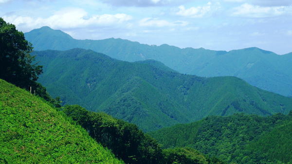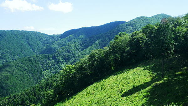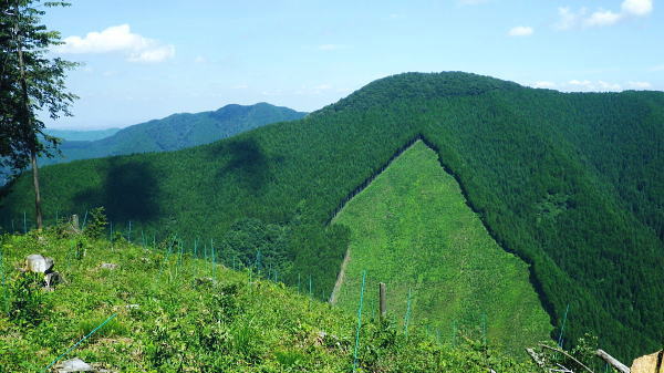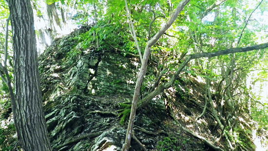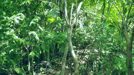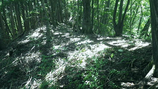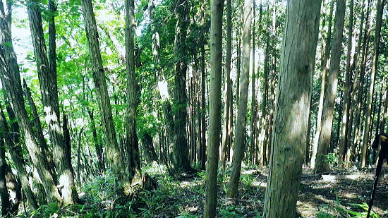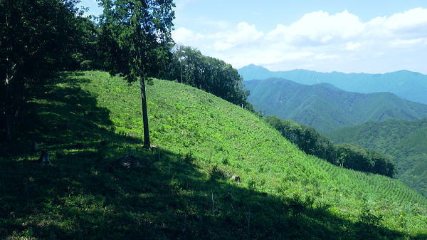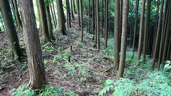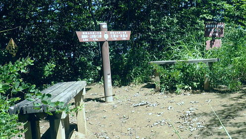 | 千ケ尾沢右岸尾根を詰め大ツイジに出てからはもう1つ軍刀利山西峰の熊倉沢と矢沢を分ける北側の中間尾根.長尾尾根を下る 猛暑の笹尾根.熊倉山と軍刀利山西峰との鞍部. 猛暑を避けその木陰を選び昼食後.軍刀利山の西峰に立ち. 矢沢と熊倉沢とを隔てる長尾尾根の末端へ.朝方の二俣出合.落合橋に降りる。 熊倉沢右俣右沢出合奥から左沢の千ケ尾沢右岸尾根から熊倉山先 広河原沢源頭860m圏から軍刀利山西峰.長尾尾根を下り落合橋・・861m点肩.日陰の台地 熊倉山966m峰 甲武国境尾根・・道標の背が北尾根.11:39道標には関東ふれあいの道.「←浅間峠.上川乗バス停.三国山,生藤山→」とある。 前回はこの頂のベンチで幼馴染と昼食を摂っている。初めて熊倉山の頂を訪れたのは再び山登りを始めた頃.8年ほど前になる。 笹尾根を縦走し.今にも降り出しそうな雨雲の下.早足で石楯尾神社へ下りていた。その後も幼馴染と南西尾根を詰め.春雪残る頂に立っていた。 今回は昼下がり南側の天空に.昨日の下弦の透き通る月明かりの姿を見上げていた。熊倉山の頂に立つのは今回で3度目。 訪れる都度.違った感じを抱かさせていた。雪解けの泥んこだった頂は標石もよく分り.「界二」と刻まれていた。 御料林「三角點」「宮界標」の三角点や界標などの標石は御料林管理のたでの旧宮内省皇室林野局が明治期に設けられている。 熊倉山から軍刀利山西峰長尾(なごう)尾根 11:39熊倉山一11:45軍刀利山との鞍部.昼食12:17一11:28軍刀利山.長尾尾根一12:55伐採地跡 一14:11尾根末端一14:50南郷バス停. 昼食 笹尾根にでて憩いの場所を探し求めるも.食事を摂るのに展望なり.風通しのよい場所は以外とこの時期少ない。 大ツイジにでる前の広河原沢源頭860m圏の平頂で休めばよかったと今さらながら後悔していた。 熊倉山は春先に2度.頂を踏み.今回は強い陽射しが照り付け.蒸す暑さも加わり.ベンチに坐ることさえ嫌になり避けている。 熊倉山を越え.軍刀利山との鞍部に仄かな風を求め戻っていた。木洩れの薄い所を選び.今回も昼食に選んだのはお茶漬け。 先程ちょっとした泥斜面の場所で写真を撮った折.滑べり茶ポリ300ccを紛失してしまったようで.ポカリは900ccが残されていた。 お茶漬けに加えるには味が心配だったが.甘味が少し加わる程度の味は空腹感を感じ.美味くアッと云う間の平らげ.ホッとした。 朝方.熊倉林道の終点.造林小屋跡で沢登りの単独行者と出会っていた。彼と再び出会う。本流左俣の西沢を遡行すると聞き. 取付きを行き過ぎたと彼に伝えていた。私も笹尾根の860m圏平頂に登らなければ左俣の中間尾根.熊倉山北尾根を詰める積りでいた。 出合の取付きはその後分かったとのこと。 彼も私も殆どが単独行。今年の夏は共に初めての山行だった。間を開けても,この暑さ。入山は出掛けるまでの決心が大変だと語る。 私も同じ身.家を出てしまえば気にすることもなく.すんなり山懐に入ることができた。私よりやや若いか.互い頑張りますねと励まし別れている。 彼は私の足元,鞍部から東沢に降りている。私も休んでいても滴る汗に負け.後半の長距離を諦める。 手近な軍刀利山北尾根.長尾尾根から末端を目指す。熊倉山の東隣りの山が軍刀利山西峰920m圏。道標の裏から熊倉沢と矢沢を分け. ほぼ並行して真北に長尾尾根を派生させている。この尾根を末端まで下り.朝方発った熊倉林道の起点に戻ることにした。 軍荼利山西峰970m圏 正面の道標裏が長尾尾根.12:28軍刀利山周辺 軍刀利山.軍茶利山西峰(ぐんだりやま)には山名票はなかった。ただ頂には幾つもの道標.看板類が多く立てられている。 長尾尾根は熊倉沢左俣と長尾沢を分け.その二俣の出合に末端が没している。 道標類はないが確りした踏み跡で.はっきりした尾根筋には.小さな赤帽黒坑が点々と続く。ただ尾根末端からは渡渉になる。 尾根の初めは痩せ尾根の急峻だが直ぐ緩やかな尾根幅が広がりを見せ.末端だけは藪絡みが残されていた。 笹尾根と分け北尾根の取付くと「南郷供益地所有地」を示す大きな看板が立てられていた。数も多く目立つが.私有地を 通して頂けるだけでも感謝せねば。今回の山行工程の全てが2本の北尾根を含め.財団法人「南郷供益地」の管轄内に入っている。 矢沢の全ての流域が南郷供益地に所有されているのかも。4年前に鎌川尾根から連行峰を経て万六ノ頭南東尾根を下った折も. 万六尾根で同じ財団法人「南郷供益会所有地.平成11年12月」の看板を幾つも見ていた。 笹尾根.軍刀利山の東側鞍部から僅かに登り返すと950m圏峰があり.無名のコブだが軍刀利神社元社が祀られている。 井戸にある軍刀利神社里宮の由緒書きには祭神は日本武尊とあり.拝殿・本殿のほかに.道奥には「奥の院」があり. 山上には「山宮」があると示されていた。 ここでいう「山宮」は軍刀利神社元社跡の山頂(950m圏峰)に新しく祀られた社のようだ。「奥の院」井戸へは道標に従い. 明瞭な表参道を下ればよい。更なる先のコブは武蔵.相模.甲斐の3つの国境点にあたる三国山