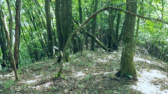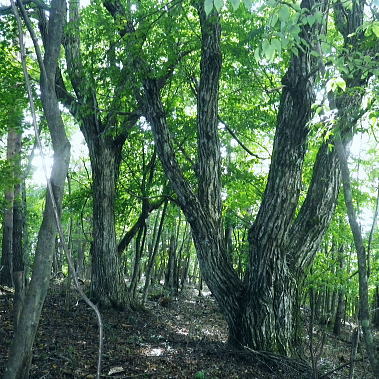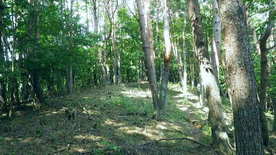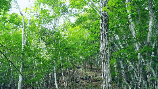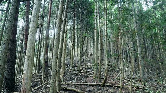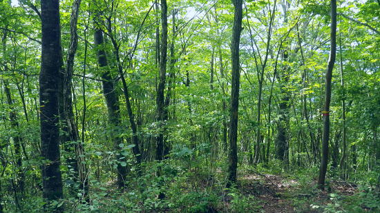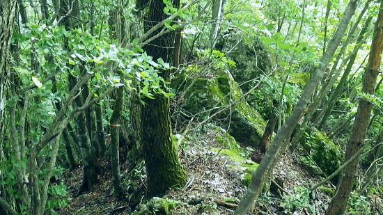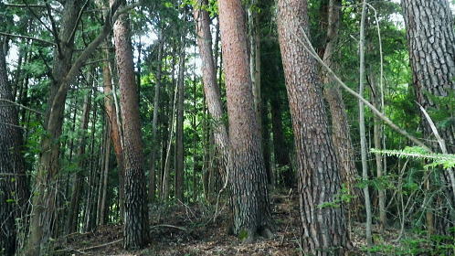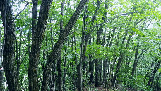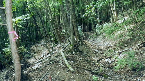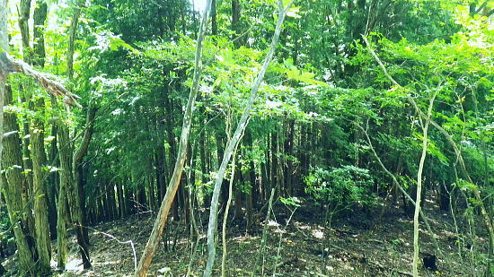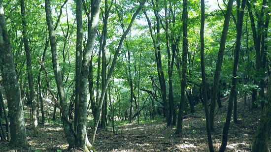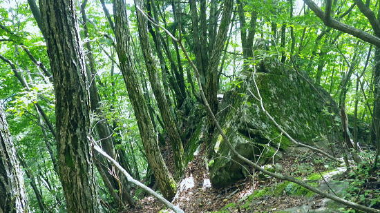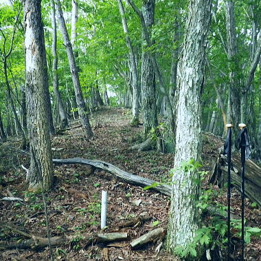 | 三頭山南面の笹尾根に跨る大沢ノ頭東尾根から南尾根の大茅尾根を下る 石原小屋窪右岸尾根を詰め大沢山大茅尾根から1000m圏で尾根末端のヨゴク尾根を選ぶ・・最後は細い枝南尾根から畑を抜け直接飯尾集落へ ハチザス沢に入渓し石原小屋窪右岸尾根からハチザス沢ノ頭東尾根を詰める 笹尾根の大沢山大茅尾根から直接ヨゴク尾根を下り飯尾・・飯尾.最奥の家屋で茶席 大沢山大茅尾根と南尾根 槇寄山の南西尾根より・・2016.02.02/14:48ムシクリ峠から凍った湿雪に覆われた三頭山を詰め.西原峠を経て郷原に下りた折に撮影。手前が大星沢左岸尾根. 大沢山々頂 (ブナ山.大ナギタ.1482m)・ベンチと道標.12:25頂の裏側が日陰三頭ノ沢左岸の東尾根になる 大茅尾根 大茅尾根は三頭山の南.大沢山より南西に派生している。鶴川流域より三頭山に至るコースは郷原より西原峠を経るも. 鶴峠より尾根伝いに至るものがある。この大茅尾根はそれらのほぼ中間を三頭山に登っている。 今回は大茅尾根を下るコースとして.大茅尾根の1000m圏で南尾根を分け.主尾根の右に回り込む。そして飯尾集落手前のポイントに入る。 .更に大茅尾根の本体を忠実に下れば大羽根山を乗り越し.大羽根峠に大きく迂回して飯尾にでることになる。 それを嫌い.集落に下りる手前の小さな南枝尾根に直進し細い支尾根のコゴク尾根に入る。最後は畑跡から集落の最上部にでている。 尾根本体は右(北側)に回り込んでいる。顕著にトラバースする地点だった。羽根山から大羽根峠にでず集落に直下した。 大茅尾根下降 12:25大沢山.大一13:26大茅一14:32(1000m南尾根分岐)一14:36植林帯:45一16:06小尾根一15:50飯尾bs. 大茅尾根の取付き.12:29昼食 笹尾根は通うハイカーが多く.大茅尾根を少し下って昼食を摂ることにした。1450m付近で風がある所を探し下るが. 探すとなると中々よい所は見付けられず。風があれば涼しい。ただ傾斜が強く.平坦な所はジャングルに近い。 如何にがやや平坦な所を見付け座るも.ザックから小物を出せば転がる不安定がある。 今回はよい場所は直ぐ見付けられなかった。大沢山での人気を気にしたのが悪かった。小さな頂にはベンチもあった。 今回も夏場の弁当は妻のフルコース。と云ってもお茶漬け弁当にフルーツが添えてある。それだけだが.相変わらず口に合い美味い。 主食にしなければと常にシャケ.タラコ.梅にお新香が乗り.口当たりの良いミョウガが添えてある。お茶漬けの素は適当のようだ。常に違う。 これで誰が文句を言えようか? バナナにトマト.今回は干しアンズも付いた。間食は大福と水羊羹と贅沢過ぎる食事になっていた。 尾根上部の岩場 上部.最初の露岩帯 2つ目の露岩帯.12:29 低い灌木が瑞々しい.12:37 9月とは思えぬ雨後の青々しさ.12:38 下部も細かい露岩が続く.13:13大茅 1237m細長い平坦台地.13:26急下降で尾根上の2つの岩場を巻き.少し離れた露岩を下り終える。 傾斜が落ち尾根筋が南側に下り始めると.尾根幅が膨らみ傾斜は緩む.そして丸っきり平らな傾斜を失った平坦地にでた。 大茅1237m点. 小石に曲り根も這わぬ.下草の茂もない.歩き易い台地。300mは超した台地が続いている。 小さく下り返した南尾根の分岐 古いプラ菅が立つ.13:33大茅南尾根 仄かに下り返した所から東方に本尾根と並行して延びる南尾根の分岐.朽ちれた塩化ビニールの短いポールだけが立ち. 過ってあったと云う道標類は見当たらなかった。少し奥の立木に赤と黄色の古いテープが.目印になっている。 ただ尾根伝いを漠然と進めば自然と右に曲り.南西の本尾根に入り込めるようなる。 見逃しのよい南側の主尾根に入り込めば直ぐ前方の樹林を透し.先に尾根が起き上がるのが分かる。 左手に折れると樹林に覆われる南尾根は少し沈む形で起き上がり延びていた。この尾根が大沢と飯尾沢を隔てる南尾根。 900m付近ではやはり平坦地が続き.尾根下端の南東面には原集落が開かれる。 この下流.大沢を隔てた郷原は.今年2月に雪道を蹴り西原峠から下山したコースになる。 下端は又上野原丹波山線の街道沿いで.長い石階段の参道を持つ一ノ宮神社が祭られていた。 この右脇の里道に入れば大星沢左岸尾根か笹尾根に詰められる。短時間で原かr尾根に乗れるようだ。 南尾根の下山路は尾根上760m地点で飯尾沢方面に曲がるよう下り.西福寺の脇をぬけて飯尾の集落に下りている。 原への逆側は少し荒れた踏み跡になった。大茅の分岐でどちらに下るか考える。 主尾根に沿い大羽根峠にでて飯尾に下るか.東側の大茅南尾根から飯尾に回り込むか? 右主尾根へ・・尾根幅が更に広がり巨樹林が現れだす.13:54一息入れて南西に入る主尾根を選ぶ。緩やかな勾配が続き.幾分尾根幅は更に膨らみを創り.大らかな尾根になった。 しっそりしたただずまいの尾根に巨樹が点々と聳え.その息づきが伝わってくる尾根。神々しい雑木に被われ御殿に突き当たる。 そこに踏み跡が綴られていた。 一変して自然林の林層は変わらぬが何かが変わったようだ。素晴らしく愛でる.この尾根一番の