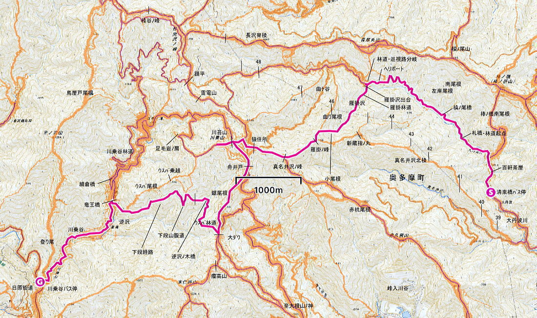 大丹波・雁掛林道から雁掛ノ峰・真名井沢ノ峰を経て川苔山肩―鋸尾根の大ダワからウスバ林道・尾根南面の下段経路を綴り川乗林道へ