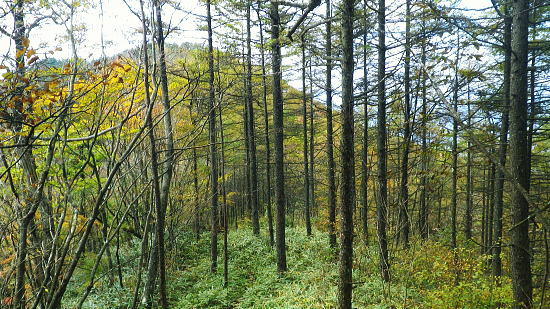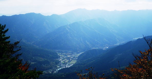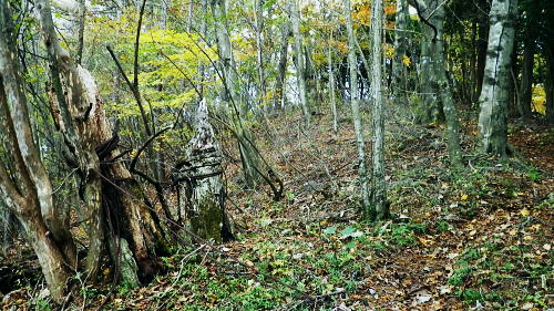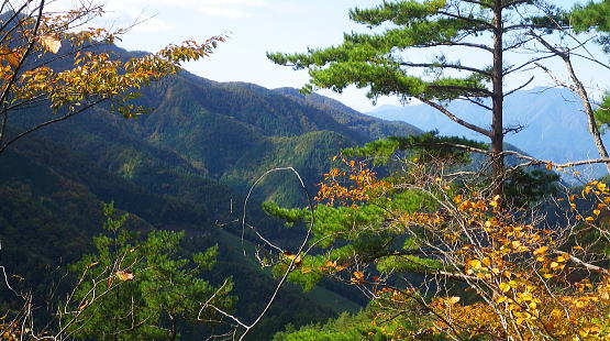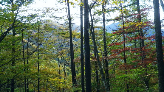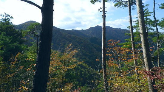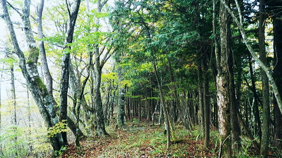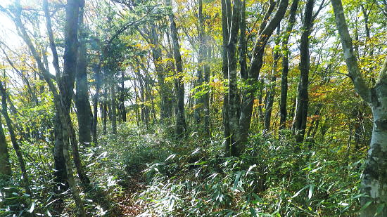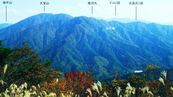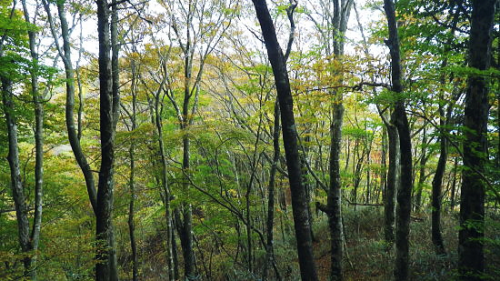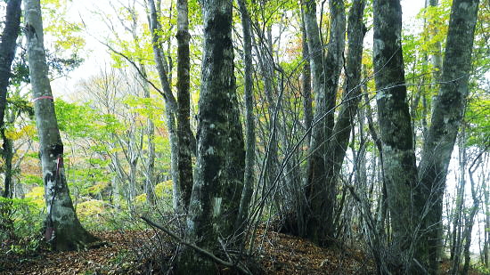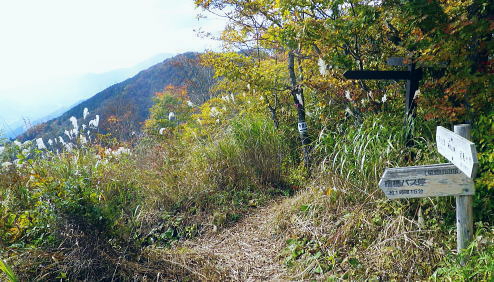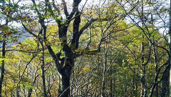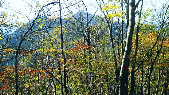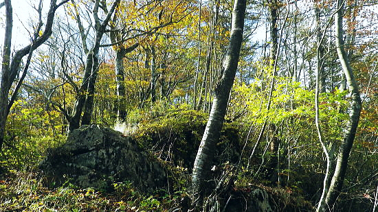 | 奥道志の主稜線・・道志口峠から御座入山 道志口峠からブドウ岩ノ頭に立ちアミバ峠へ。菜畑山からは飛び抜けた甲相尾根の展望を望み.水喰ノ頭に立ち.今倉山東峰をピストン ヒカゲ沢左岸尾根から日陰舟.岩戸ノ峰ち綴り道志口峠 奥道志山稜から菜畑山.御座入山をピストン・・北丹沢.甲相連山の展望 長スラ尾根を下降.盛里線と大旅沢.市ノ沢と下り曾雄の里にでる 道志口峠からブドウ岩ノ頭への道.11:05奥道志山稜・・道志口峠〜御座入山 11:00道志口峠一11:14ブドウ岩ノ頭一12:10菜畑山:30一13:15水喰ノ頭山一14:21御座入山. 奥道志の主稜にでて.再びスズタケは失われていた。下草の緑は雑草の茂み。 ただ晩秋を思わす何とも言えぬ柔らかい日差しが周りを雑木の色染めた樹葉をキラまかせ.心を洗わさせる大地を創りだしている。 昼下がりの里山の一景を感じ取れる長閑な風景になっていた。 ブドウ岩ノ頭 道標両側にある踏み跡.11:14ブドウ岩ノ頭1224m 道志口峠前後からススタケは薄れ見られなくなるもブドウ岩ノ頭に至る道中は.雑木林に黄葉が賑やかく染め.見惚れるうちに頂にでている。 登りつくと登山道は左にL字に直角に折れ.菜畑山に向かい網張峠へと下るようなった。 又頂の北側には古い木製の山名標に「ブドウ岩の頭」とあり.その両側には北方に下りる確りした踏み跡が2つ残されていた。 右手の踏み跡は大旅沢と道志口沢出合に没するブドウ岩ノ頭北西尾根。長い尾根で下りは911m点前後のミズナラが趣よく見られ, 920mで林道菅野盛里線にでる。左に折れる911m点尾根は猿焼林道分岐から200mほど手前で.下れば盛里林道に入っている。 左手の踏み跡は1073m点の北側に延びる支尾根. 登りの場合は菅野盛里林道から取付く。取付き点は末端の僅か西寄りにある。 大岩を中央突破し1160m圏のコブを過ぎ.露岩の細尾根が続き.北東に向きを変えブドウ岩ノ頭にでる。 又コブの周りを林道菅野盛里線がグルリと回り込んでいた。・・菅野盛里林道の南擁壁上より撮影 又山名標の左立木の下には道志口峠と同じような別のパーティのメンバー表が置かれていた。よく見ると明大ハイキング部20期生とある。 子供の集団登山と考えていたが.何か拍子抜けさせられた。 網張沢流域・・菜畑山方面?網張峠 殆どが雑木に囲まれた奥道志主稜を南側に折れ.峠としては幾つも窪地があり.分かりずらい網張峠1108mにでる。 網張沢の滑滝にでるには鞍部から支尾根の踏み跡をたどって.網張沢二俣980mに下り.網張沢を上流に向かうと河床に幅が2m. 全長40mの花崗岩のスラブ状になったナメの小沢が姿を現わす。 二俣からはナメと小滝.木橋から菅野盛里林道を横切り.大きく右から回り込んで大旅沢右岸にでて,大旅沢橋から中ノ沢にでられる。 ここから盛里林道になりゲートを抜ければ大旅沢.茅野橋にでて民宿へ。峠から30分.大旅沢橋から30分, 唐沢尾根・・水喰ノ頭と今倉山二峰 左景・・11:33奥道志主稜線の紅葉に彩られた雑木帯に入り.菜畑山から続く唐沢尾根沿いで.ミズナラにブナと変化に富む晩秋のよさを満喫している。 水喰ノ頭北尾根と長スラ尾根 右景・・11:34網張峠の縦走路を下り返し.ブナの巨樹が交わる賑やかな紅葉の落葉樹覆う尾根を登り.1215mの小コブを右に巻いている。 そして登り詰めるとススタケが現れ.落葉松の樹冠から蒼空が開かれだした。すると斜面も緩み菜畑山の北側肩にでる。 丘状の斜面が広がり.立木には幾つもの巣箱が備えられ.北面としては陽光を透す明るい森の台地に恵まれた。 奥道志主稜.菜畑山 奥は水喰ノ頭.12:10菜畑山(なばたけうち) 菜畑山の頂にでる所で切り開かれるよう樹林は途切れ.伐採された広いカヤトの原にでる。 遠くから眺めていたより小さく感じられた細長い頂は真近に三角点標石が目立ち.正面のカヤトからは丹沢の大展望が開かれた。 菜畑山1470mは御正体山.今倉山と共に山梨百名山に選ばれ.又共に一等三角点標石を持つ赤鞍ケ岳から先へ続く奥道志の主稜になる。 主稜は又.都留市と道志村と跨ぐ境界尾根にあり.菜畑山はそのほぼ中央に位置していた。 登り着いた細長い山頂を横切る登山道は三角点標石を東方に.道標類はまとまり西方に立てられ.南面はカヤトが広がりを見せている。 左に折れれば最短距離で道志に下れ.登山道は川原畑を経て「曙橋」バス停からタケノコ沢沿いに菜畑林道へ。奥.Pから徒歩35分の距離にある。 直進すれば更に奥道志主稜(唐沢尾根)へと老樹の覆う深いミズナラにブナの樹林帯を綴り.落葉松の覆う水喰ノ頭へと続いている。 三角点標石の東側のカヤトを綴る踏み跡は菜畑山東尾根に入る。道志和出村から東尾根に乗り.都留線335号鉄塔を経て頂に立つ。 交通の便から考えると私には未知に近い山だった。そこへ大旅沢流域に入る考えは後から続く形で頂に立っている。 よく知らずして登ってしまった山。まだまだ遠いい山になる。 又山名の菜畑山の「山」を「うら」と呼ぶ云い方は長沢脊稜に聳える日向ノ沢ノ峰の「峰」を「うら」と呼ぶ云い方に似ていた。 HP「