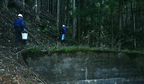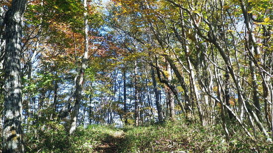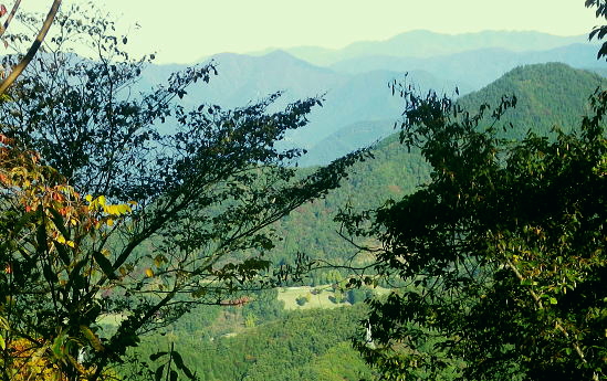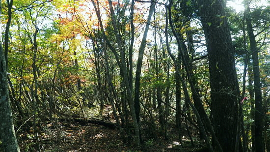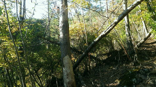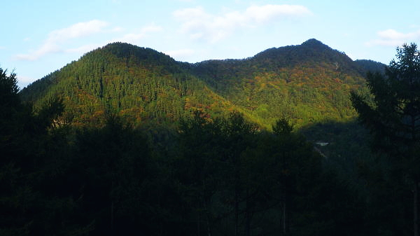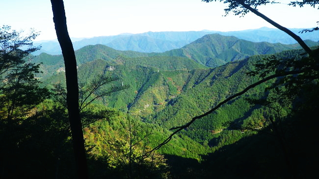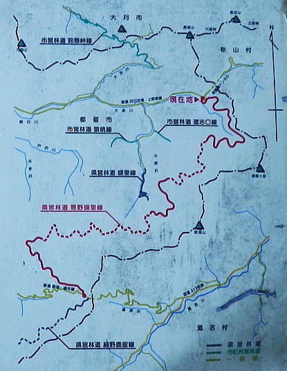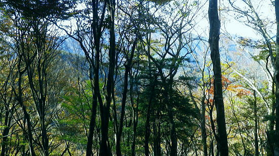| 道志.大旅沢流域を取り囲む尾根を綴る。ヒカゲ沢左岸尾根から奥道志山稜.唐沢尾根を抜け長スラ尾根へ・道志山地Top 主稜の北支尾根群を横切る広域基幹林道と新たな延伸工事の現場・・林道盛里線.菅野盛里線 林道終点のヒカゲ沢左岸尾根を詰め日陰舟を経て.大旅沢源流の奥道志主稜―御座入山をピストンし大旅沢.長スラ尾根を下る 2016年11月04日.松村 ヒカゲ沢左岸尾根から日陰舟.岩戸ノ峰.道志口峠へと続く・・水質検査員.熊騒動 奥道志山稜から菜畑山.御座入山をピストン 長スラ尾根を下降,盛里線から大旅沢.市ノ沢と下り曽雌の里にでる 大旅沢流域は猿焼山西尾根末端の禾生付近から入渓し.桂川に流れる朝日川右俣の上流流域に当たる。 朝日馬場の二俣で左俣の大平川を分け.右俣の大旅川(おおだみさわ)に入ると曽雌付近で左岸から大旅沢が流れ込む。 大旅沢とその上流の枝沢は日陰舟.岩戸ノ峰.ブドウ岩ノ頭.菜畑山に御座入山北尾根のバラジマノ頭.猿焼山を綴る峰々を擁する稜線に囲まれ. 奥道志主稜線の支尾根の中腹には林道・菅野盛里線が横切り.開削工事が昭和62年度以降.今だ延伸工事が綴られている。 盛里線と菅野盛里線 菅野盛里林道の絡みで5.6年前には「月待ちの湯」を起点に.1410m峰北尾根から今倉山北尾根を下り猿焼山まで周回していた。 1410m峰北尾根には真新しく盛里林道が横切り.「大旅工区」では東側山腹の開削工事が周りに騒音を巻き散らかしている。 広域基幹林道菅野盛里線は全長20.4km. 林道が1410m峰北尾根を横切っているのは自分の目で確認しているが 「菅野工区」と「大旅工区」の両起点から工事が行われ.その途切れている区間は谷間でどの辺まで進んでいるか分らないている。 予定ルートとしてはその東側から今倉山北尾根の東側に当たる市ノ沢の右岸間がまだ未完成になっている。 「大旅工区」の開設工事は徐々に進むも.まだ入札に至らぬ所もあり.全線開通にはまだ大分.先になると思われる。 今年発刊された「新バリエーションハイキング」松浦本を参考に開通する前の大旅沢流域に入る。 その後の状況と北尾根から遠望した空白の大旅沢流域を結び付け.盛里林道終点から入山を試みることにした。 ヒカゲ舟沢左岸尾根から日陰舟に登り奥道志主稜を西進し.今倉山東峰をピストン。長スラ尾根を下降して大旅沢を綴り.曽雌に戻るルートを選ぶ。 九鬼山と鹿留山.杓子山 富士急行大月駅ホーム南端より.6:52九鬼山南面の雄姿. 右に延びるのが瀬之上尾根で田野倉へ。肩に乗るのは都留二十六夜山。 左に延びる市界尾根(大月市と都留市)は組屋休場を経て札金峠へ。手前は札金林道から田野倉へ。大月市側は小沢川.漆原に至る。 11月04日快晴後曇 jr御徒町4:36=4:39神田:41=豊田5:52=6:37大月.富士急行:53=7:02禾生.富士急タクシー¥3970=7:25菅野盛里林道終点. jr御徒町駅から始発の電車を乗り継ぎ.更に豊田駅で大月行電車に乗り換える頃,東の空は白みだし.次第に天空に蒼空が目立つようなる。 薄くオレンジ色に変わり始めた色合いも失われ始めている。ただまだ地上は闇の世界だった。 電車の扉が開く都度.冷たいつむじ風が車内に入り込む季節に今年もなってきた。6時06分日の出を迎える。 周りは見る見る明るさを増し.電車は小仏トンネルを潜り.前道志山の流域に入る。禾生駅に下車してからはタクシーで盛里林道口に至る。 禾生駅 富士急行の列車は通学にはまだ早く.通勤者や観光客が多い。その割にハイカーは少なかった。 素晴らしい晴天に恵まれ.列車がミニチヤのような街並を綴り.山梨リニア実験線を潜ると禾生駅ホームに入線した。 禾生駅に下車したのは私一人。狭い通りの改札口前広場には予約したタクシーに迎えられ.リニア車両基地前の雛鶴神社前までお願いした。 富士みち.R139号線.「禾生駅前」の交差点を横断し.陽の洋々と昇る明るい朝方の四日市場上野原線.県道35号線を朝日川沿いを走る。 左手.右岸沿いの尾根は九鬼山東尾根.左岸沿いは猿焼山西尾根と長い尾根に挟まれ街道を進み.下山予定の曽雌.大旅沢出合を過ぎる。 雛鶴神社 朝日馬場は城ケ丸北尾根の取付きで.メーンの通りには石船神社が建立されている。 1335年(建武二年).後醍醐天皇の皇子.盛良親王は鎌倉宮に幽閉され.28歳で殺害された。護良親王の首級がこの神社に祀られていた。 又直ぐ雛鶴トンネルを潜った道志側の穴路沢出合付近にも同名の雛鶴神社があり.棚ノ入山北尾根に入った折には境内に雛鶴姫の立像がある。 鎌倉を逃れ無生野に辿りついた愛妃雛鶴姫は護良親王の王子を産むが不運にも一諸に命を落とし.村人は墓碑塚を築き弔っている。 20年後戦乱のさなか綴連王.王子はこの地に亡命し73歳の天寿を全うした。村人は護良親王.雛鶴姫.綴連王を祭り雛鶴神社を創建したという。 タクシーはで朝日馬場から本流を直進し大旅川に入り.雛鶴神社に寄り参拝する積りだった。 それが熊出没の話に夢中になり.神社を通り過ぎて新雛鶴トンネル口前の大旅川沿いの林道終点にでた。 昨日は曽雌に熊が出現し.