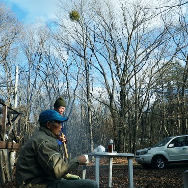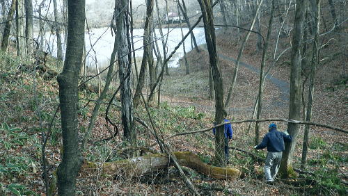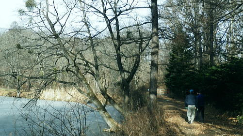 | 上信越高原・・草津温泉と北軽井沢周辺 16年度北軽.薪作りと草津の湯・・2016年12月10〜11日 m見城夫婦.鈴木.松村 薪作り 北軽生活.10日/12:4512月10日(土).快晴後曇 jr御徒町.¥1657:20=7:39東上線池袋.¥515. :45=8:26東上線若葉=鶴ケ島IC.¥1540=11:00駒寄PA(下)=見城邸 =12:00北軽.あさい荘h. 何時もより薪作りの時期は遅い。関越道に入り北風が強く.澄み切った山並を望みながら駒寄PAで高速道を降りている。 そして渋川市有馬に新築したばかりの見城邸に寄ってから見城夫婦と共に.北軽に入いる。着いたのが丁度正午. 薪作り 昼食は軽く済ましている。私は3年振りの薪作り。早速.倒木を選んで運ぶべる大きさに切り.中庭で薪作りに精をだす。 学生時代はよく吾妻連峰.家形ヒュッテで修理を兼ね薪作りをしていた。営林署に伐採してよい立木を選定してもらい.年に一度.秋にヒュッテに入っていた。 北軽では最初の数年は鋸から始まり簡易の電動に変わり.今はやや中型になっている。次第に要領もよくなり.今年は薪作りを早めに終えた。 日差しがでているので.師走に入り肌寒い中.中庭でファイヤーを催した。じっとしていれば.寒さに抑えられぬ厳しさだが火の暖かみはありがたい。 ホット・ウィスキーを片手に4時ごろまで炎を囲み外で遊んでいる。歳を取っても火遊びを好む中高年達。 別荘脇の茂みで 「あさい荘旧館」.13:34 例年と同じ場所にできるヤドギリ・・入口手前で バルコニー前で.14:28 中庭で・・師走のキャンプファイヤー.14:45焚火 誰もが思う炎の魅力.昔後輩達に新聞紙の半紙を持たせ.雨露に濡れる枝木で焚火ができるよう教えたことがある。 又回顧の世界に入るが過って.雪解け水に登山靴を履いたまま.浮く証明を実感させ.直ぐ焚火で暖かみを取るよう訓練したこともある。 残雪残る谷側の河原で渡渉訓練を行い.寒さに震え耐えながら一生懸命.火に向かっていた後輩達。 炎が上がればその暖かみに安らかさを感じさせ.1つ1つ学んだ後輩達も.今は私と同じよう老齢になっている。 古希を真近に迎え.師走の北風の中でキャンプファイヤーをした。若き日の発想とは異なるが炎を見詰める気持ちは同じだった。 この寒さの助っ人は焼き芋とホットウィスキー。優雅な一時を味わっている。ぐずついたていた湿った枝木が音を立て燃え上がり.又風も舞い上がる。 燃え尽きたところで室内に移り.今度はストーブの炎を見詰め.酒宴は夜遅くまでなされた。・・消灯23:00 中庭のヌクギ.15:15中庭の太いヌクギを1本倒してから3年目。もう見た目は慣れだしているものの.見上げる天空は広がりを見せ.残った独木は美木にも見受けられる。 それにしても森の中.巨木を倒した仰ぐ空間は.比べるものがないほどの.空の広がりを見せている。日没まで1時間ある。 空の蒼さが沁みり.澄んだ空間ができ上がっている。たこの場所だけを覗けば違った場所の想像をもさせていた。 西側の森のヤドリギ群.15:32直ぐ近くでヤドリギの群がるのを見る。何時もこんなに多く生い茂っていただろいうか。 樹林に遮られた大地が冬木と共に.一大発見をしたような気を起こさせていた。高木に寄りそうようあるヤドリギに深い北軽の森を感じている。 11日.照月湖を散索 湖畔の馬道に降りる.9:0511日.曇後吹雪・・東京に帰り快晴 北軽11:00=12:00スパックス草津=15:05駒寄PA(上).¥1500=15:55鶴ケ島IC=若葉16:02準急 =志木.快速16:22=16:53jr池袋. 夜半.冬木の樹冠を透し満点の星を仰ぐ。夏には樹葉に埋め尽くされてた山小屋も.この時期になるとバルコニーから夜空を広く見上げることができる。 落葉の大地は枯葉で埋め尽くされるも.仰ぐ裸林の枝々はすっきりした姿を現わし.抜けた先は大空だけではなく.見晴らしはより広く開かれていた。 散歩 朝方.明るい日差しが窓際まで差し.その明るさに風に乗る小雪が舞っている。よく見ると細かい雪の結晶が光の1点の如く絡まり舞い降りてきた。 足先は別荘地の枯葉積もる裏道に入り.散歩にでる。照月湖への落葉径. 手の甲に耳元に冷たく.手袋に毛糸の帽子を深く被っている。 湖面は殆どが氷結され.湖畔の片隅に仄かに先日の残り雪が積もっていた。風が舞い.枯葉が氷の上で巻き上げられている。 又南側の本の一部分だけが凍らず残されていた。そのに鴨の姿を十数羽見るも.枯葉を踏む私の足音を聞き.湖畔から遠く飛び去った。 落葉を蹴りつつ東電の長野原制御所を回り込んで.一周する形で山荘に戻っている。 照月湖 周囲2km.静かな森に囲まれた湖畔は殆どが買い占められた照月湖アラビアン・ホース・ランチがある。 敷地内にはエンジュランスコースに湖畔を回るトレイルがあり.現在アラビアンホース14頭に道産子馬11頭がいる。又観光トレーキングに乗馬ができる。 標高は1048m.夏でも25℃を割り.6/下旬〜7/中旬にはゲンジボタルの鑑賞ができ.幼虫は中流域にすむ.カワニナを補食している。15oと大型. 南岸道.9:11草津の湯 ゆっくり11時北軽の山荘をでる。吾妻川を下る途中で温泉に入浴しようと考えていたが見城さんの提案で.やや遠
